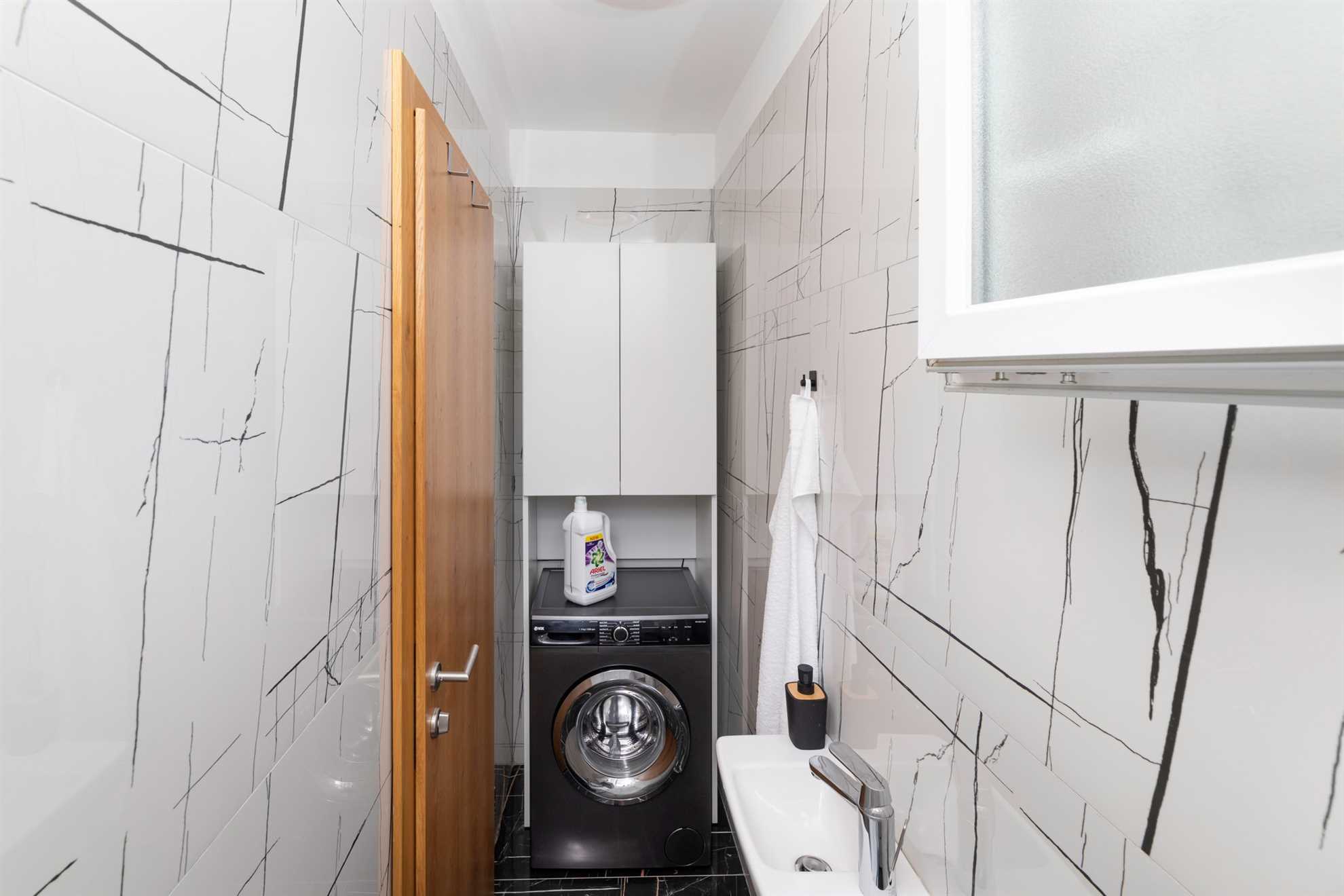 One of the four luxurious bedrooms is located on the ground floor, featuring a double bed, en-suite bathroom, air conditioning, and TV. A separate guest WC with a washing machine adds to your comfort during your stay.