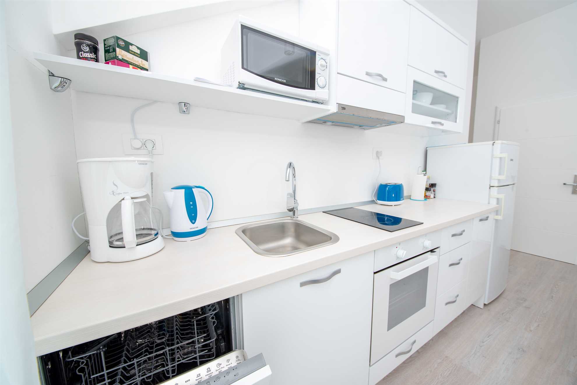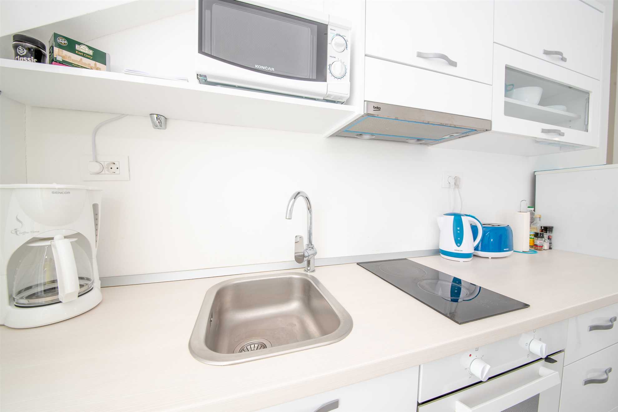 The kitchen, well-appointed and modern, comes equipped with essential appliances, allowing you to cook and savor meals at your leisure.