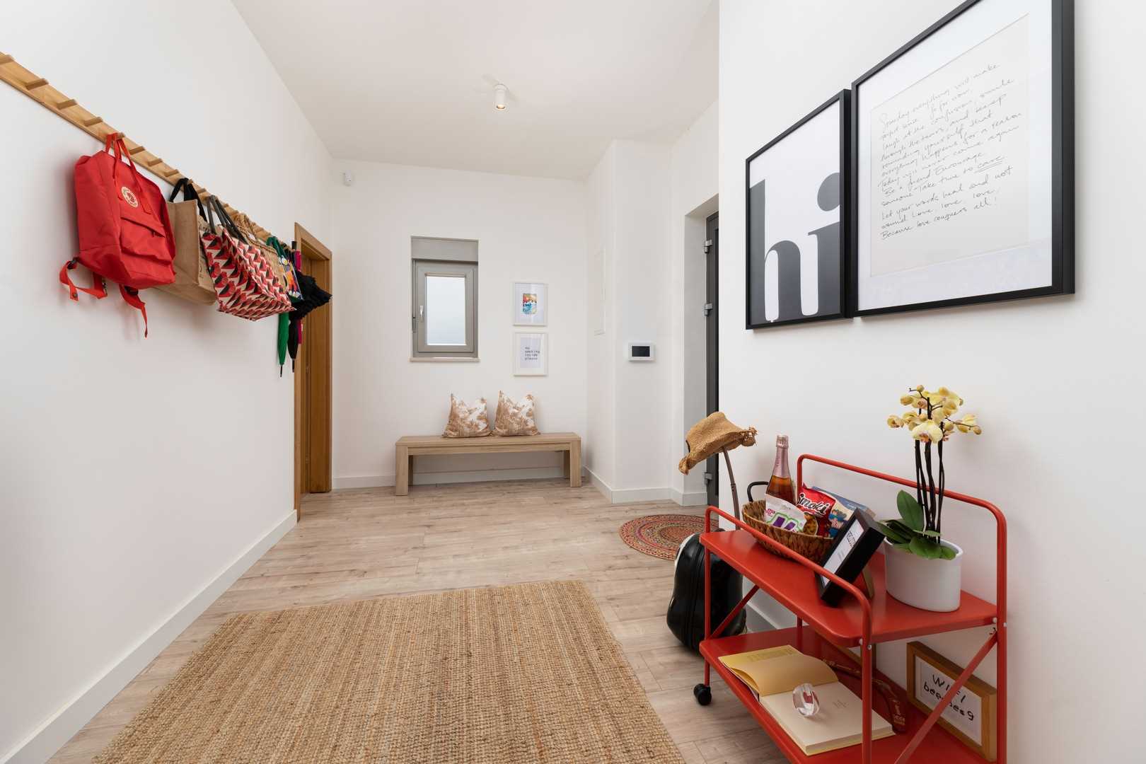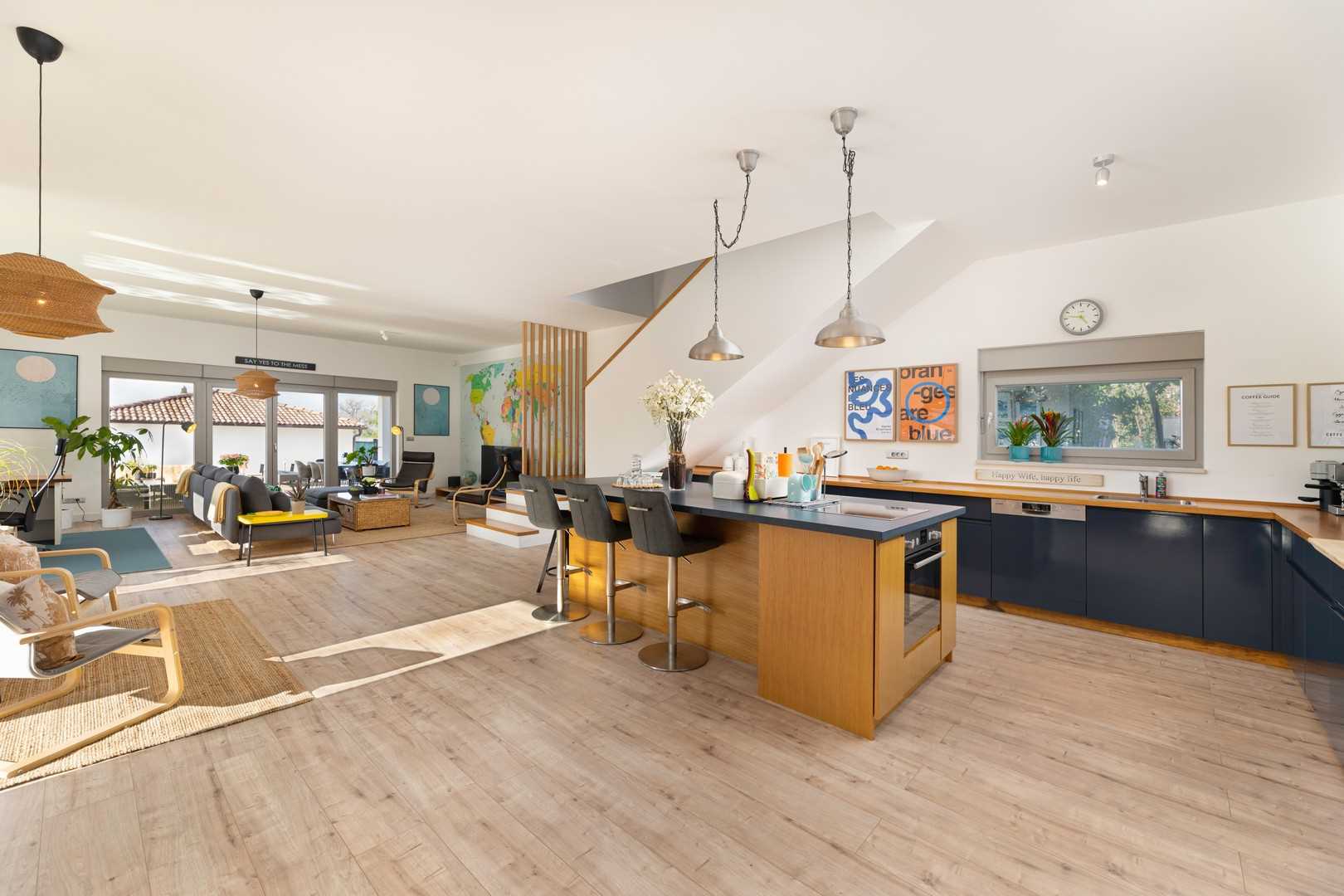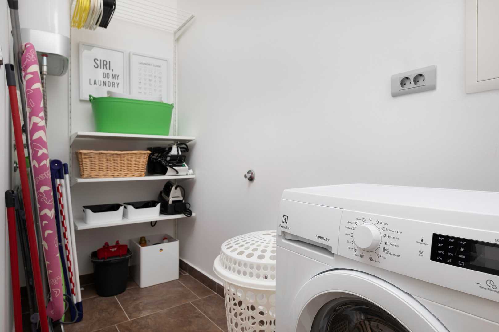 The outdoor area of the villa seamlessly connects to the interior, which impresses with its modern and elegant design. The bright and spacious living room is furnished with a comfortable sofa, a large LED TV, and a beautiful fireplace that creates a warm atmosphere during the colder months. The kitchen is fully equipped with everything you need to prepare meals, while the dining area provides a pleasant space for enjoying food together. On the ground floor, there is also a utility room and a separate guest WC.