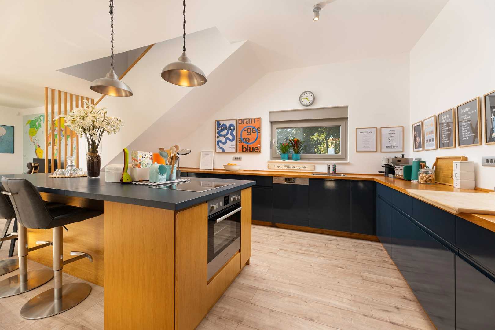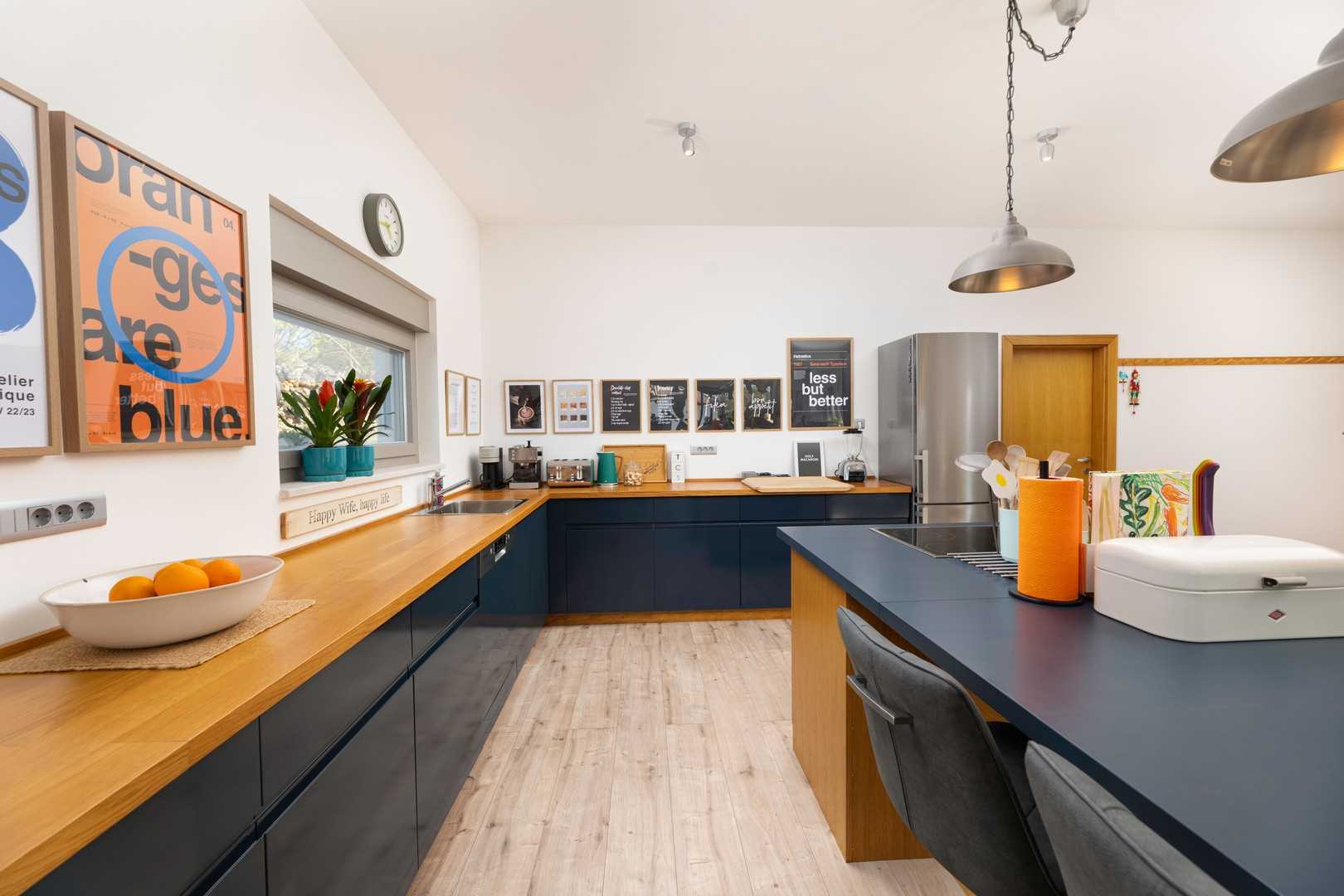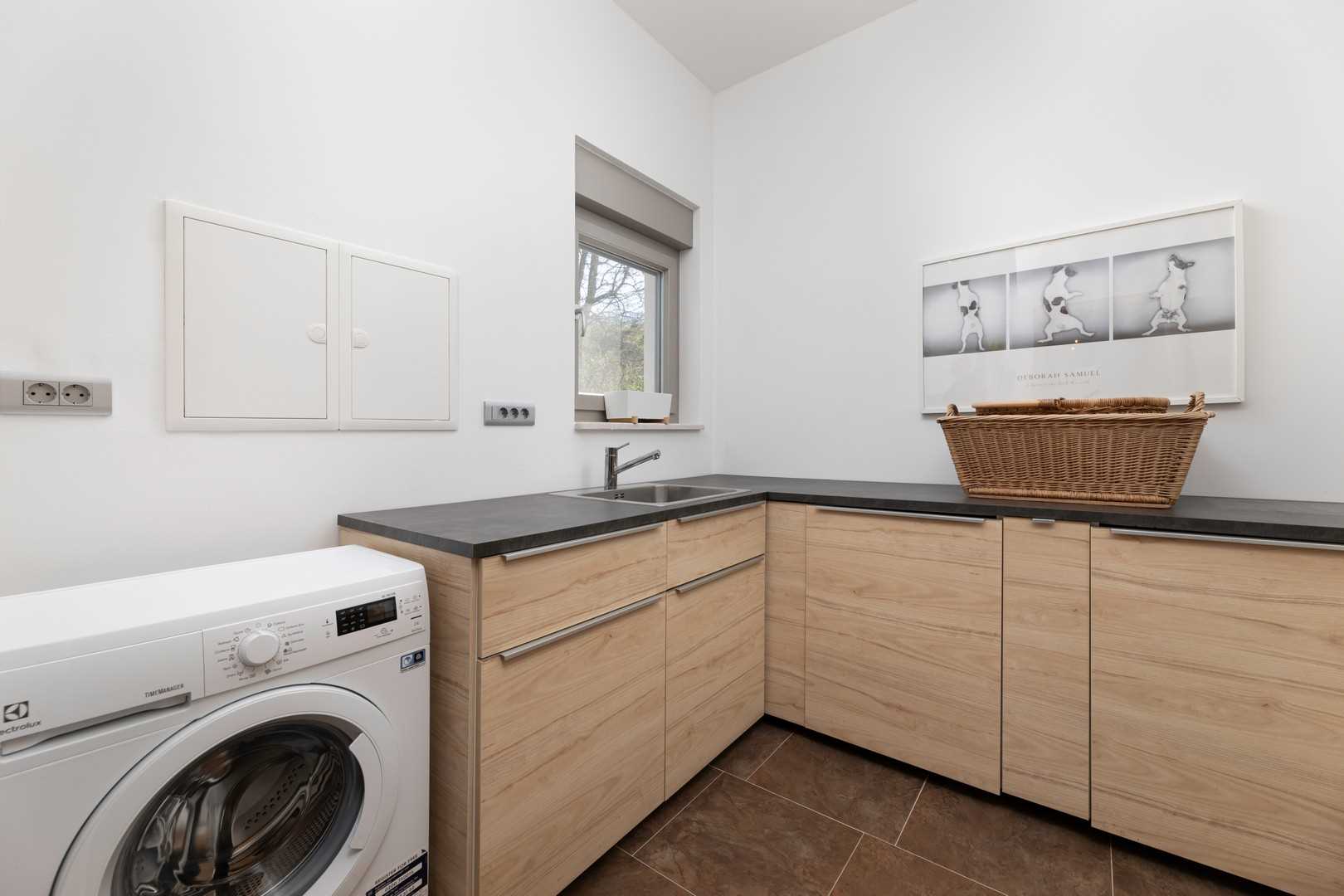 The outdoor area of the villa seamlessly connects to the interior, which impresses with its modern and elegant design. The bright and spacious living room is furnished with a comfortable sofa, a large LED TV, and a beautiful fireplace that creates a warm atmosphere during the colder months. The kitchen is fully equipped with everything you need to prepare meals, while the dining area provides a pleasant space for enjoying food together. On the ground floor, there is also a utility room and a separate guest WC.