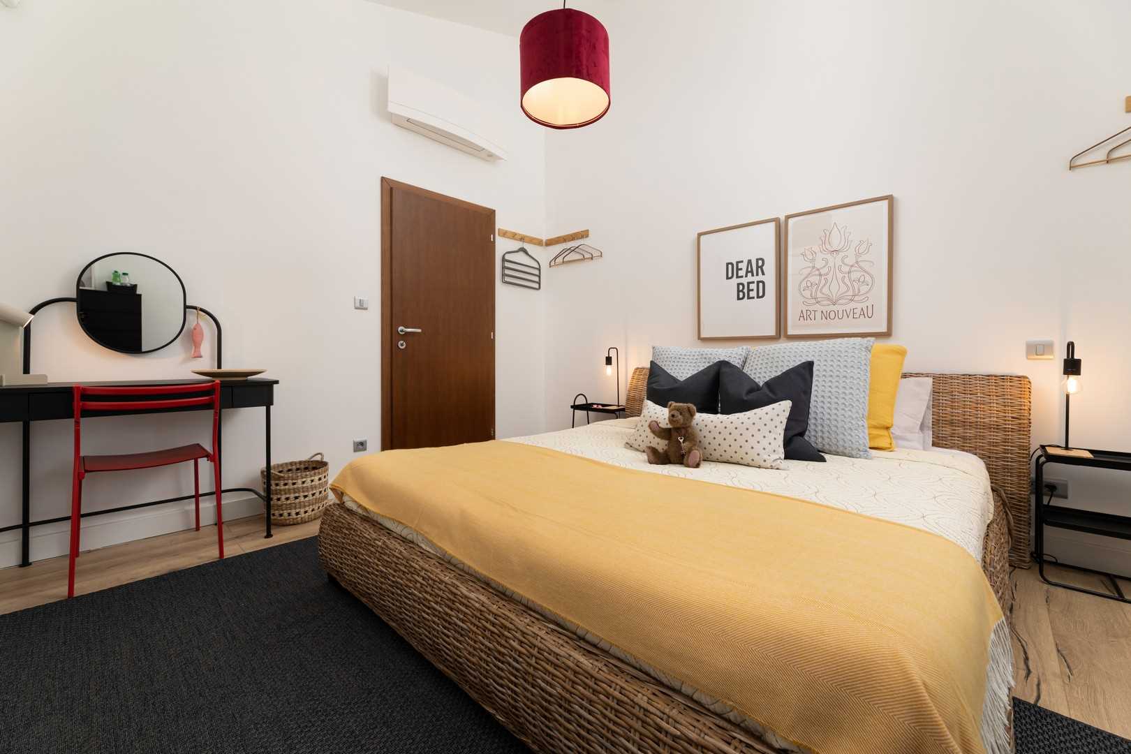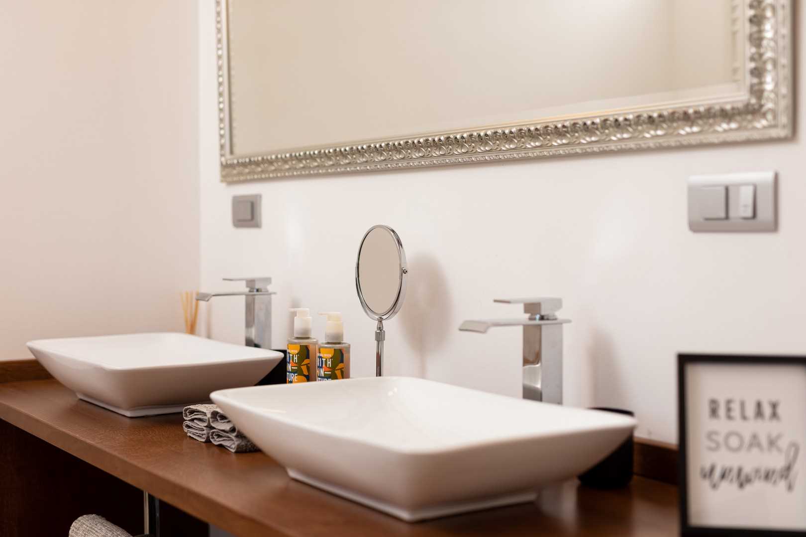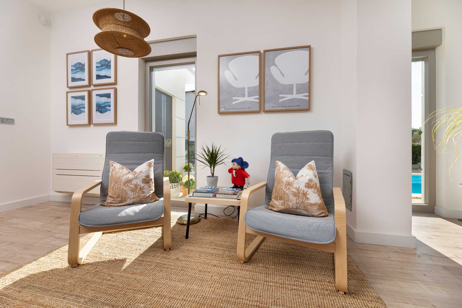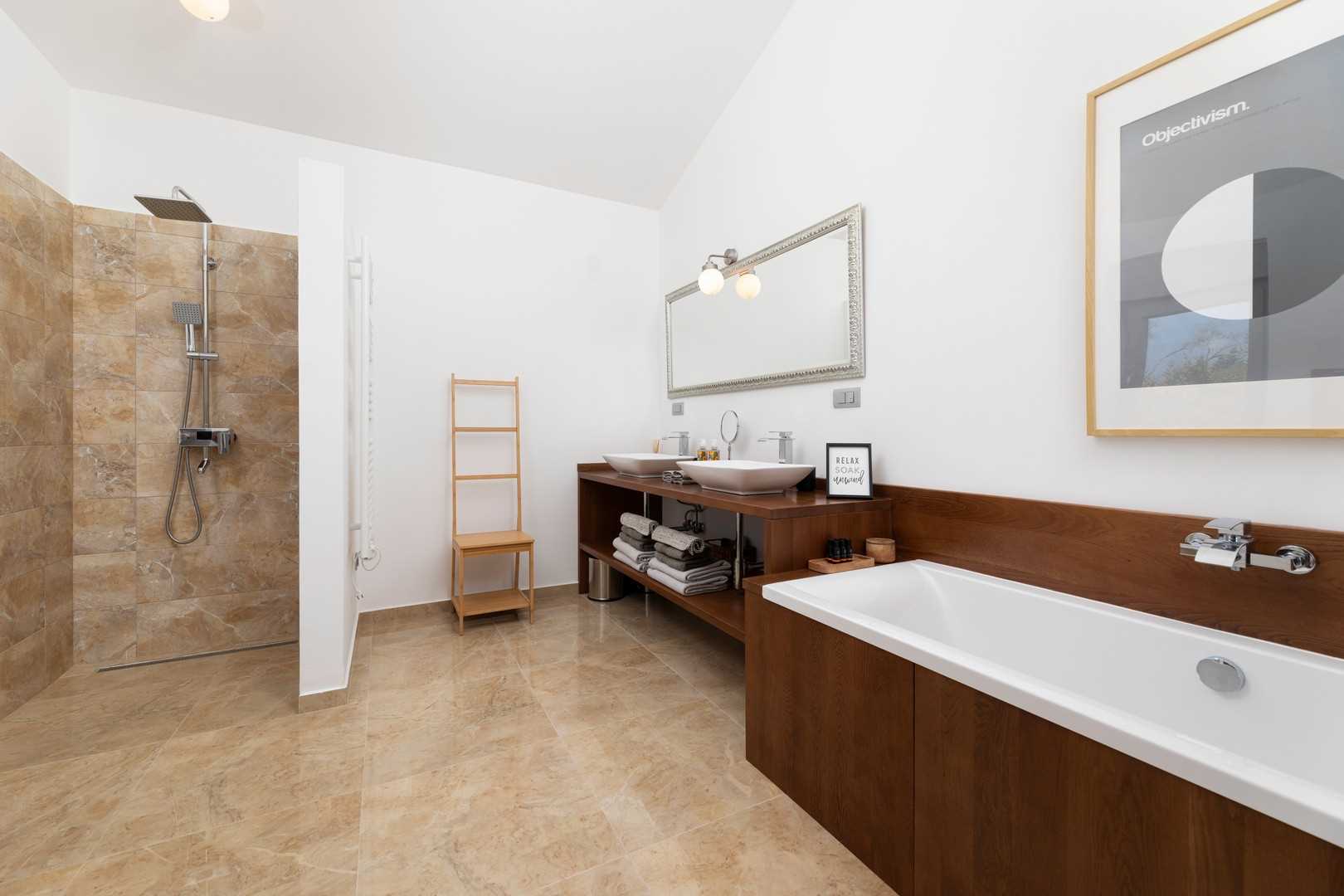 Villa EL offers three comfortable bedrooms. All are on the first floor. Each bedroom is equipped with a large bed, air conditioning, and high-quality bedding. The villa has three bathrooms – one featuring a shower, bathtub, double sink, and WC, while the others have a shower, sink, and WC. In the hallway on the upper floor, you will find a cozy reading nook – perfect for moments of peace and relaxation.