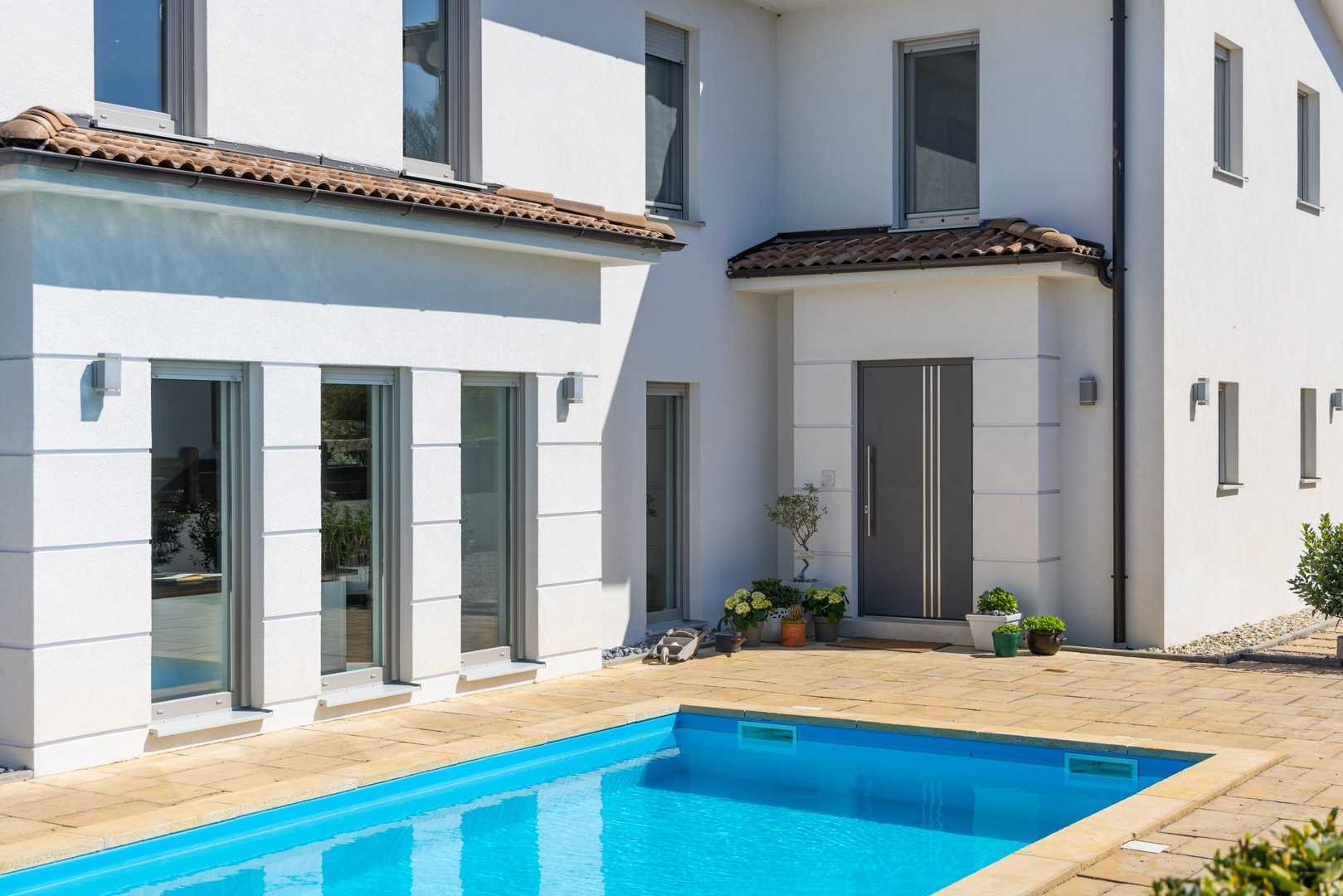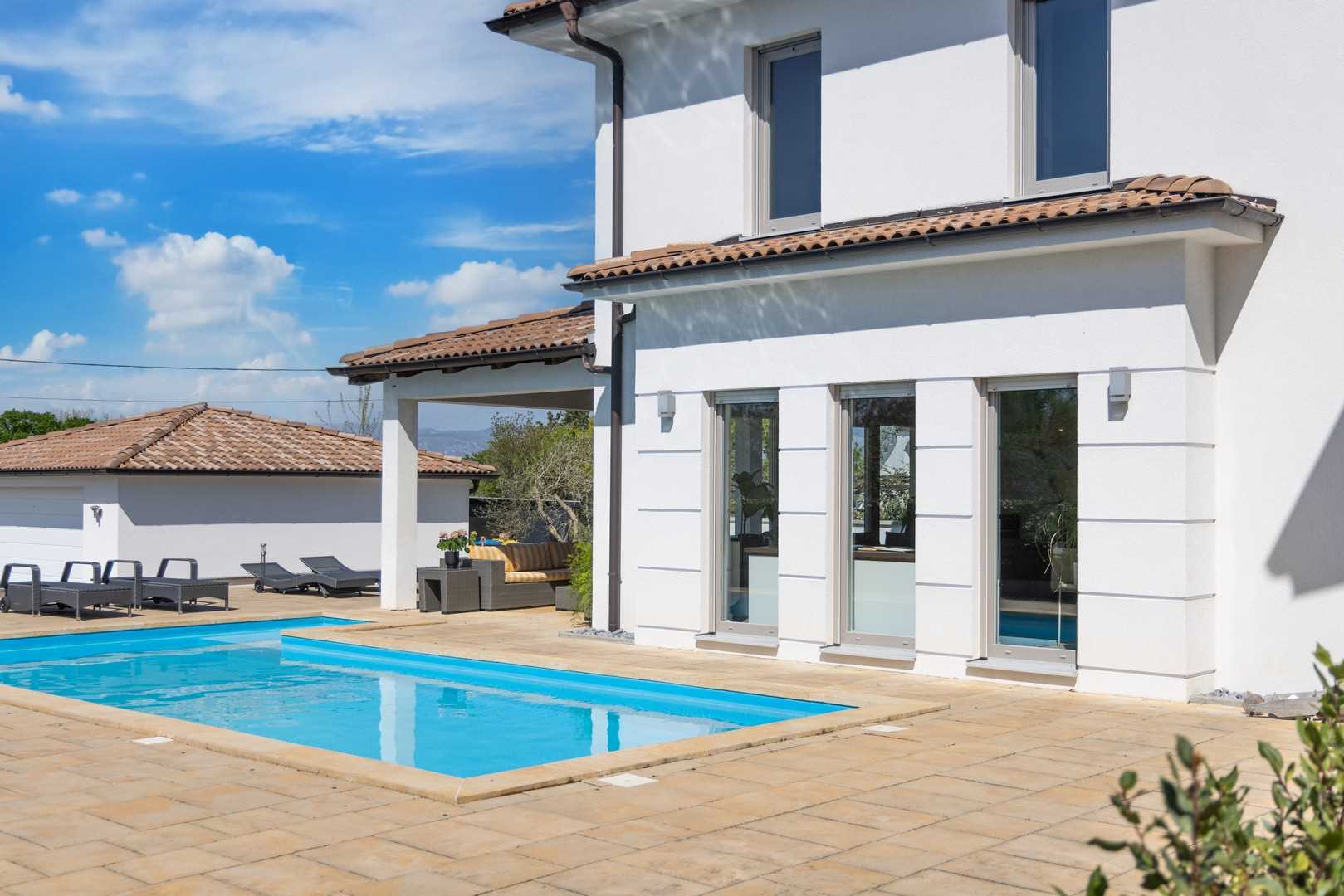 The heart of the villa is a spacious pool, measuring 28 m². It is surrounded by a large terrace with sun loungers for relaxation in the sun. The covered part of the terrace provides pleasant shade with a cozy outdoor seating area and a space for socializing. Here, you will also find a barbecue area, perfect for preparing local delicacies. The entire property is fenced, ensuring total privacy, and offers multiple parking spaces. The garage is not in use and is not included in the offer.