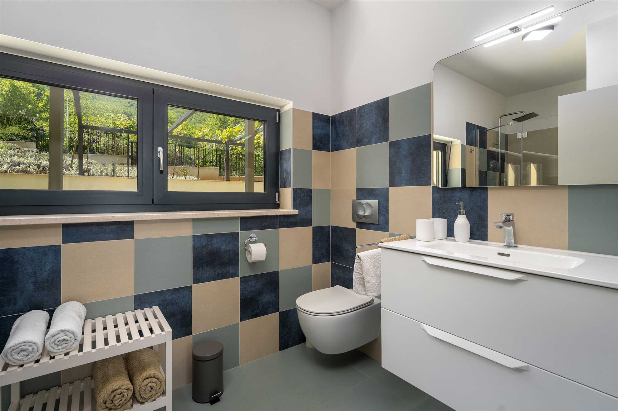 Each of the three bedrooms comes with its own en-suite bathroom—two upstairs and one on the ground floor. All bathrooms feature sleek walk-in showers with relaxing rain showerheads for that spa-like feel. There’s also a guest toilet on the ground floor for extra convenience. Need a rinse after a swim or beach trip? Head to the outdoor shower on the shared deck—it offers both warm and cold water for a refreshing cool-down anytime.