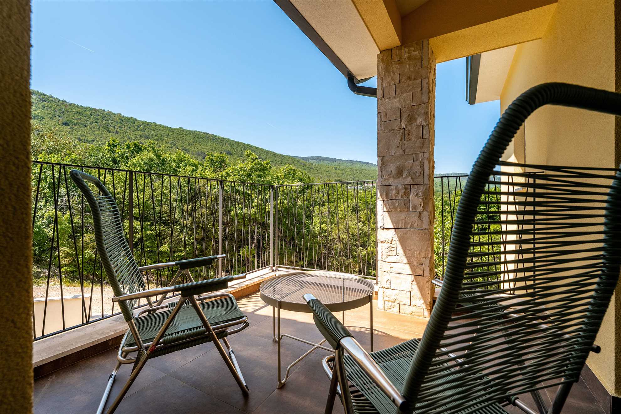 Every bedroom comes with its own private balcony, complete with outdoor furniture—perfect for sipping your morning coffee or enjoying sunset views. Gaze out over the sparkling sea, nearby islands, and lush greenery all around. Plus, there’s an extra balcony on the first floor with two comfy deck chairs, ideal for some quiet time with a book or a glass of wine.