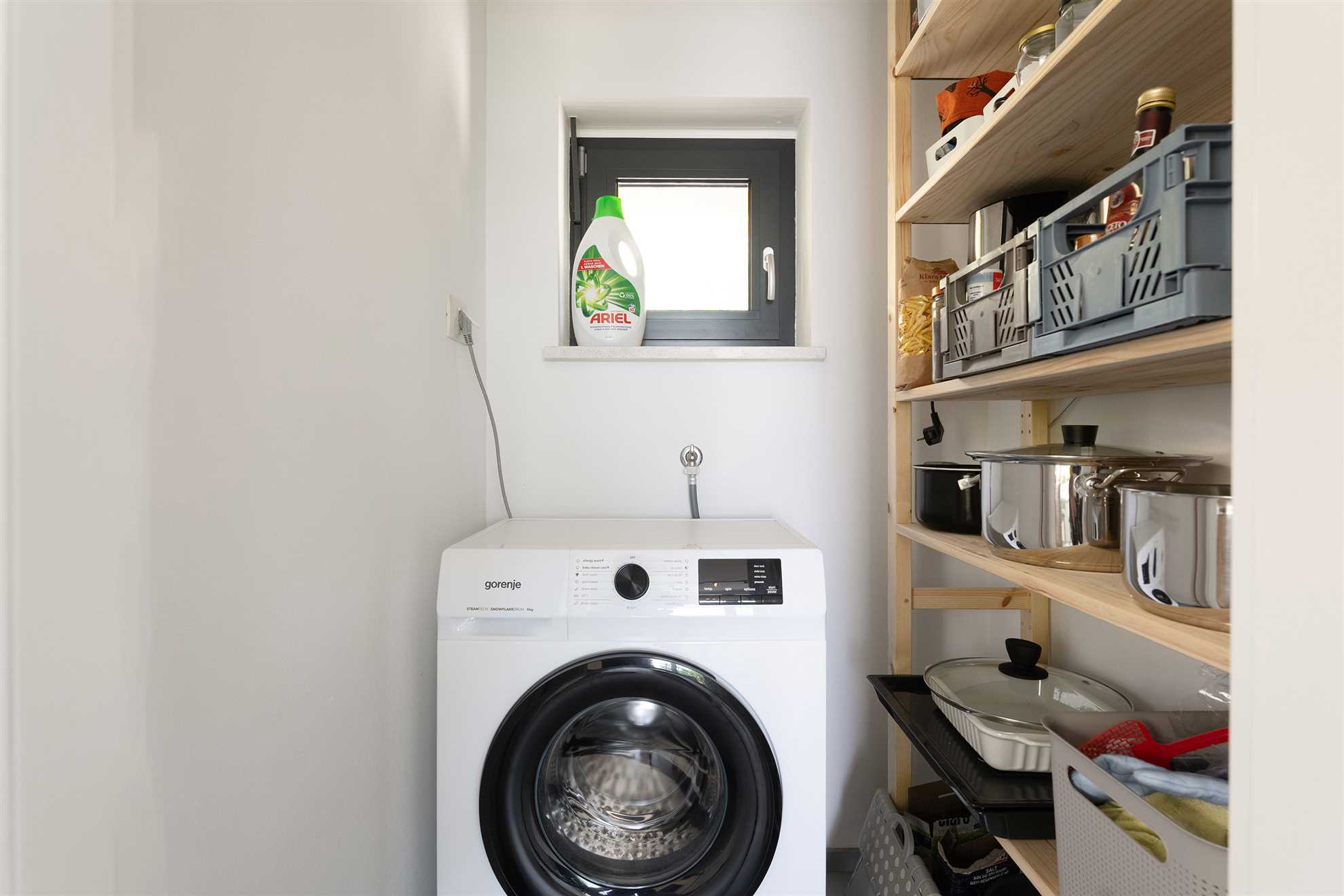 Cook up a storm or simply enjoy a morning coffee in the bright and fully equipped kitchen. You’ll find everything you need—fridge, freezer, stove, oven, toaster, electric kettle, Nespresso coffee machine, microwave, and even a hand mixer. The round dining table seats six and is perfect for sharing meals, laughs, and local wine. Just off the kitchen, there’s a handy storage room with a washing machine for added convenience.