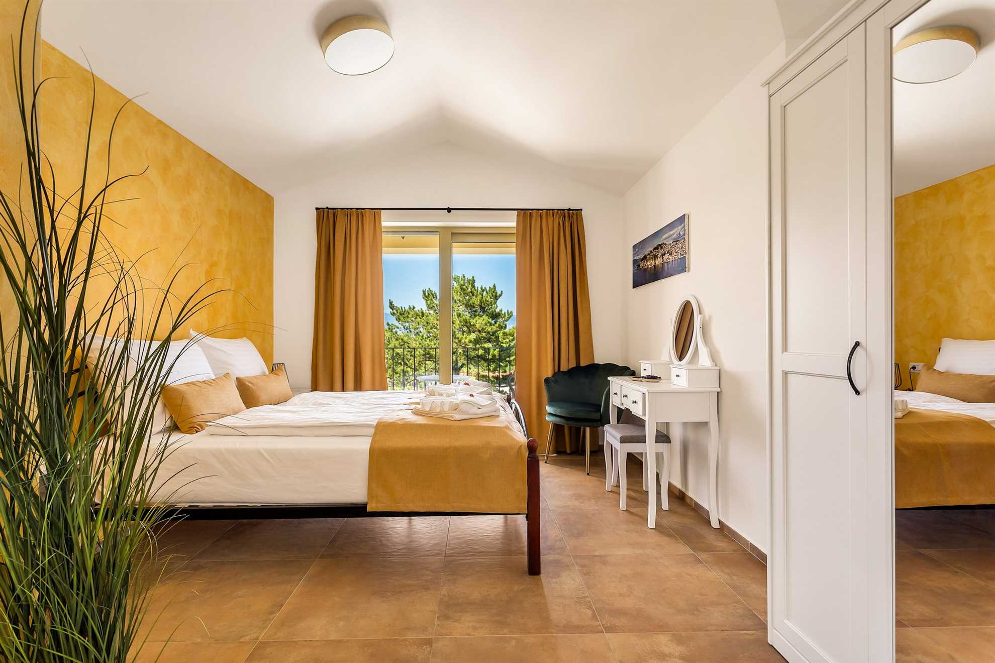 Two of the bedrooms feature king-size beds, private bathrooms with walk-in showers, wardrobes, and vanity tables. Both rooms are air-conditioned and have direct access to a terrace, where you can wake up to breathtaking views of the sea, the historic core of Vrbnik, and the shimmering pool below. Sipping your morning coffee or watching the sunset from this vantage point is truly unforgettable.