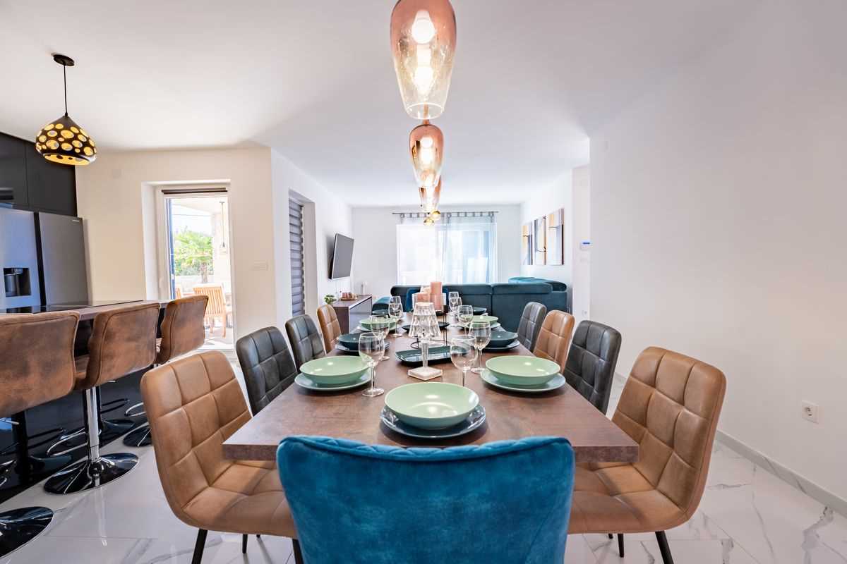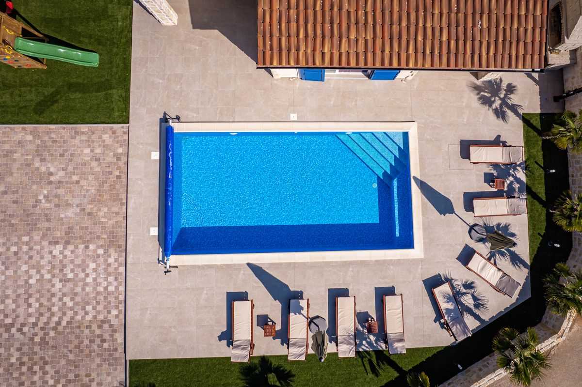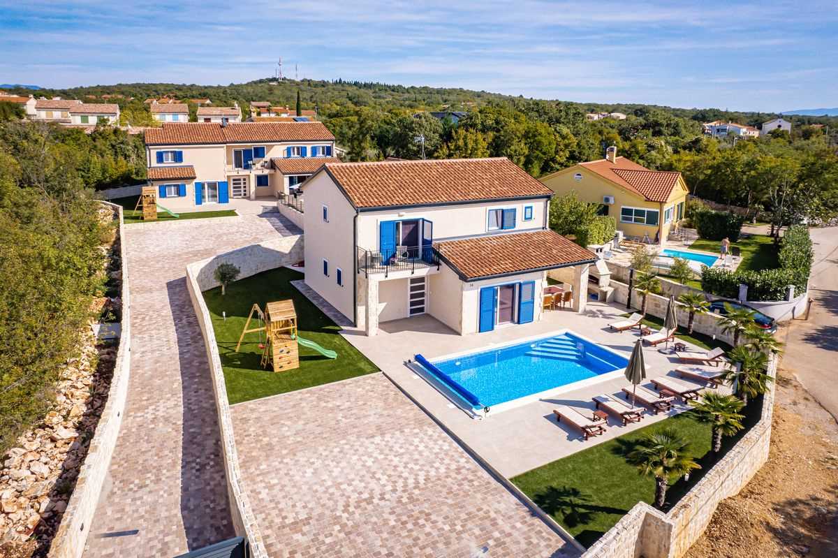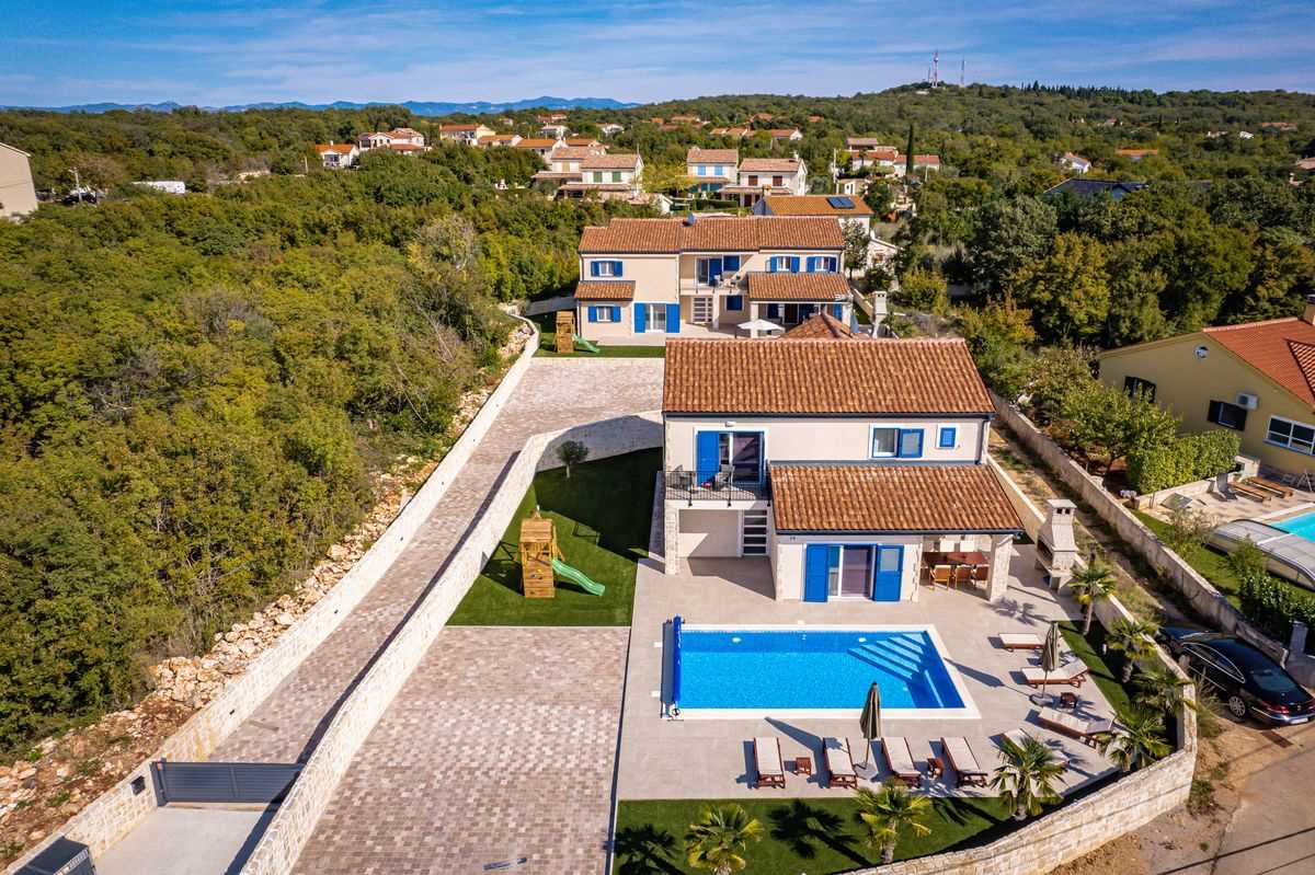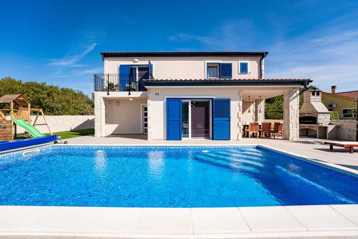 Villa Silvia Krk is modern comfortable 5-bedroom villa (200 m2) with private open swimming pool (32 m2) in small quite village. 4 Bathrooms ensuite plus 1 Toilet. Spacious living room with fireplace, dining area (for 10 persons) and fully equipped kitchen. Terrace with barbecue and outdoor sitting (10 persons). Outdoor area for children. Three parking spots on the property. Spacious garden around the house fully fenced. Outdoor furniture, Darts. Children playground.
