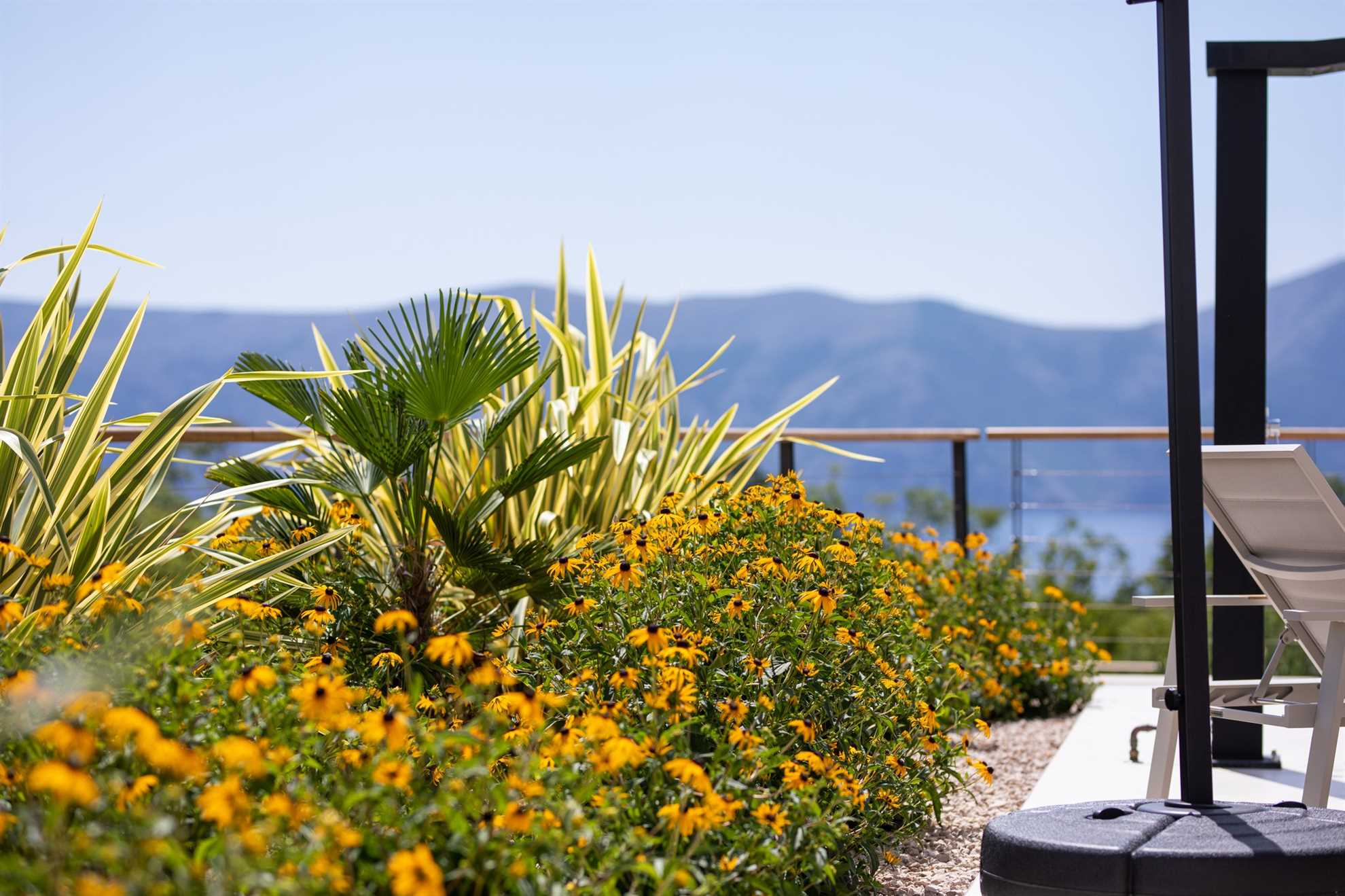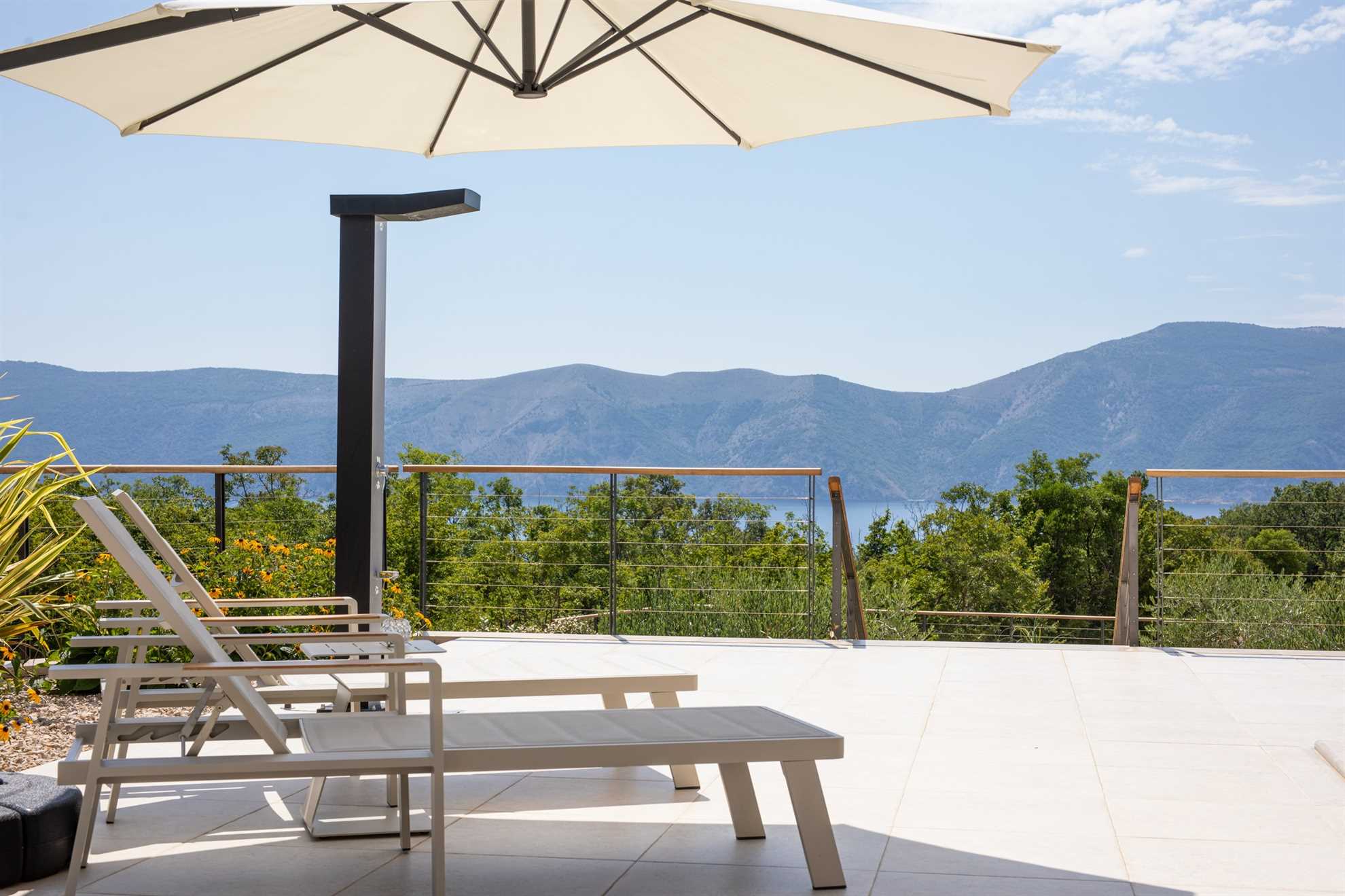 The outdoor area of Villa Olive Garden is designed for spending most of your time under the open sky. A spacious, sun-drenched terrace surrounds the large swimming pool, complemented by sun loungers and an outdoor shower. From the terrace, stairs lead to the olive garden – a serene spot ideal for reading or simply enjoying the natural shade of olive trees.