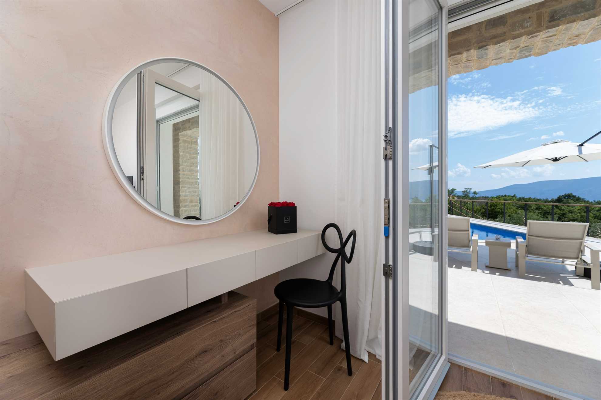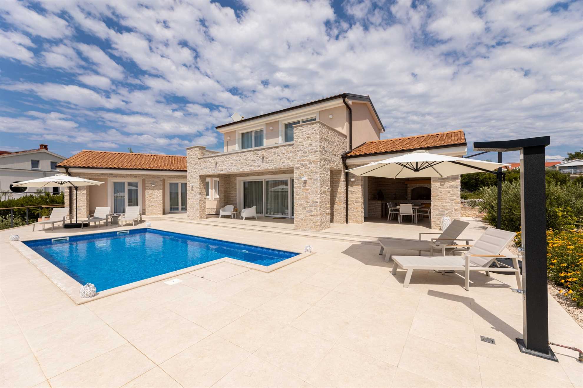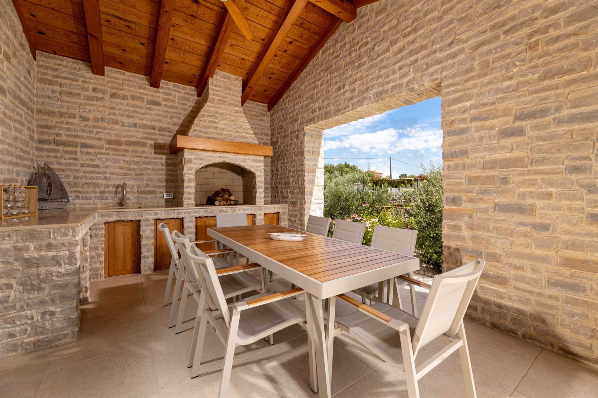 One of the villa’s highlights is the outdoor kitchen, equipped with a traditional grill, a sink, and ample counter space for preparing delicious meals. The dining area for 8 guests is the perfect place to enjoy long, relaxing evenings under the stars.