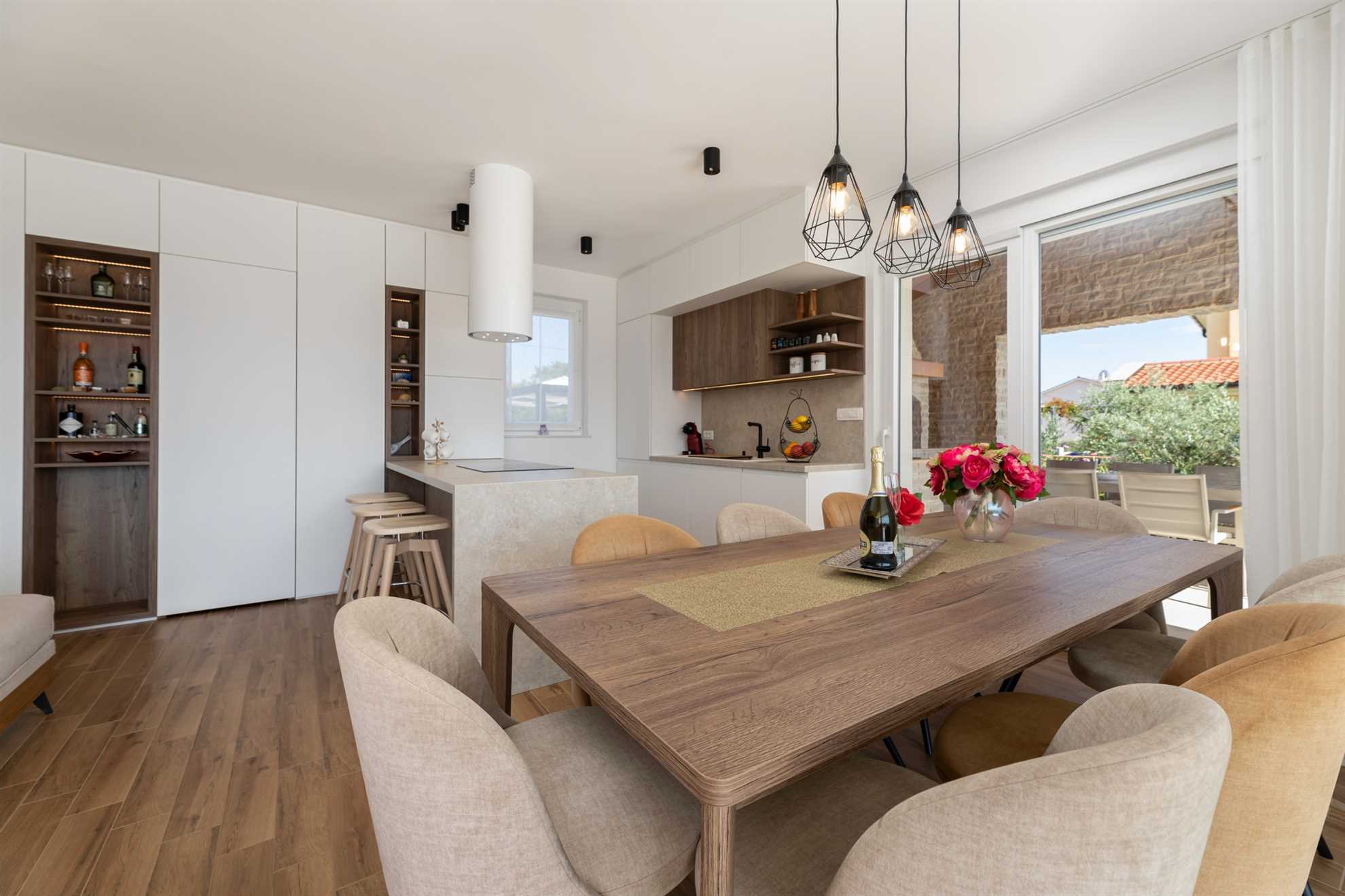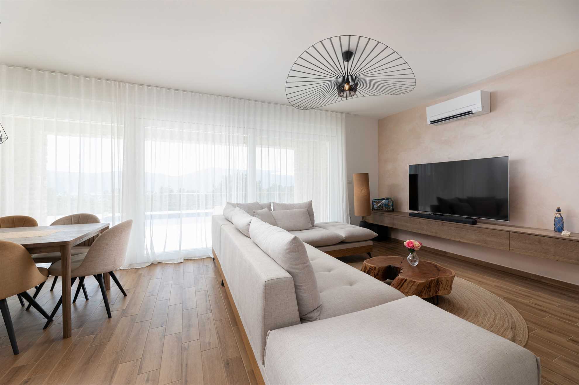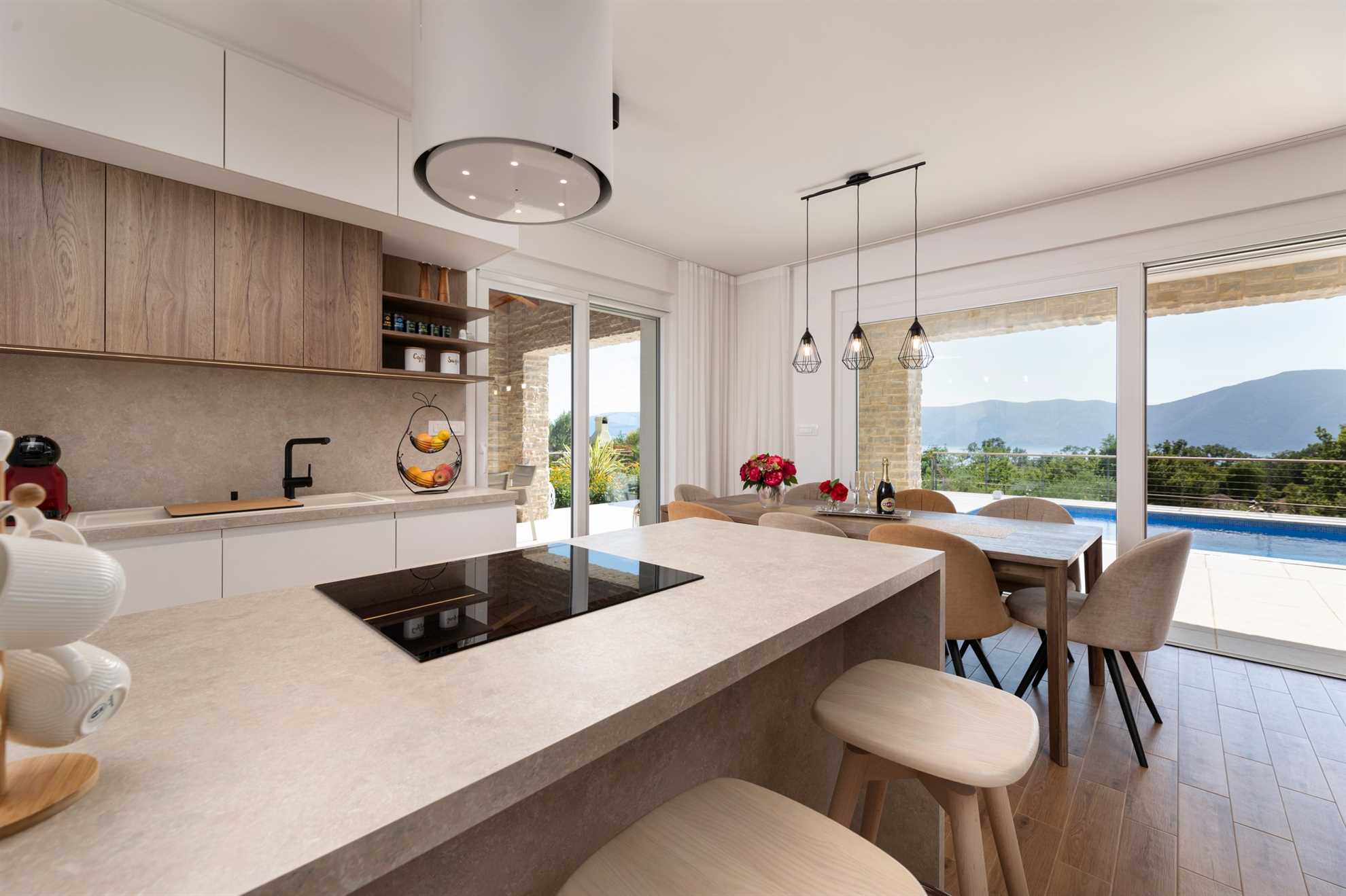 Upon entering the villa, you are greeted by a bright, spacious, and tastefully designed interior. The ground floor features an open-concept area that connects the kitchen, dining room, and living room. The kitchen is fully equipped with premium appliances, including three types of coffee makers, a blender, a juicer, a kettle, a toaster, and a dishwasher. The dining area, with a table for 8 guests, offers stunning sea views, making it a delightful spot for meals.