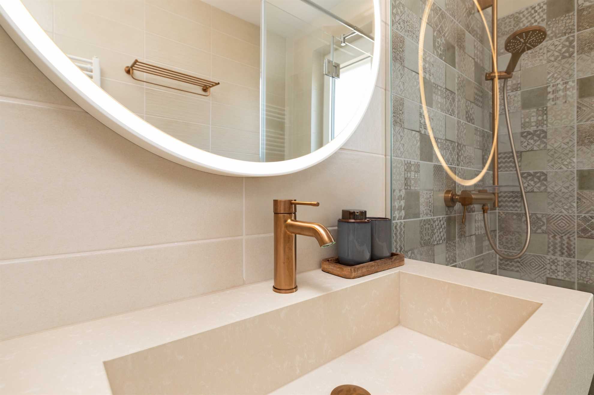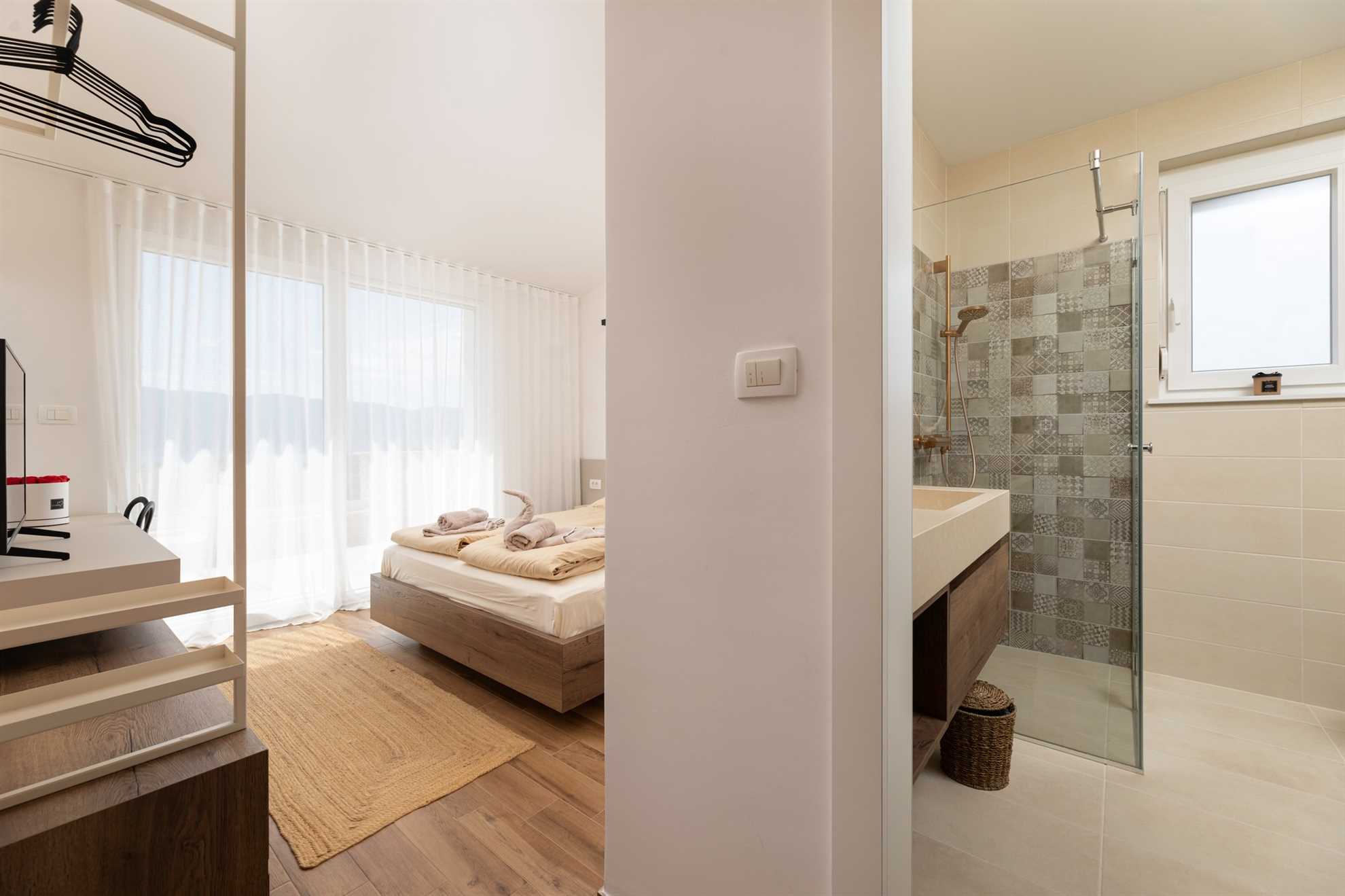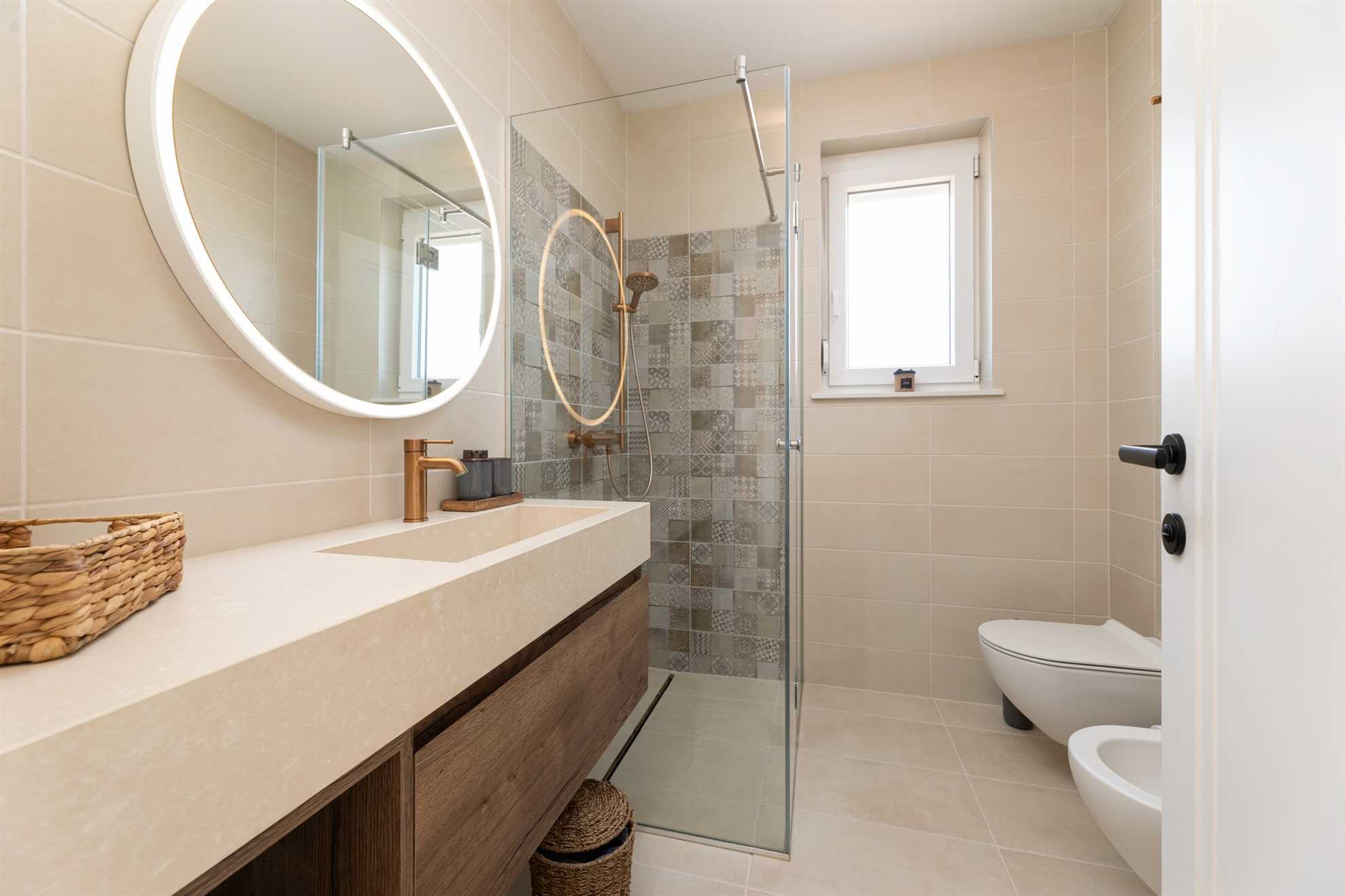 The first floor features two more elegantly furnished bedrooms, each with an en-suite bathroom and a balcony offering panoramic sea views. The bathrooms are equally well-equipped with modern amenities.