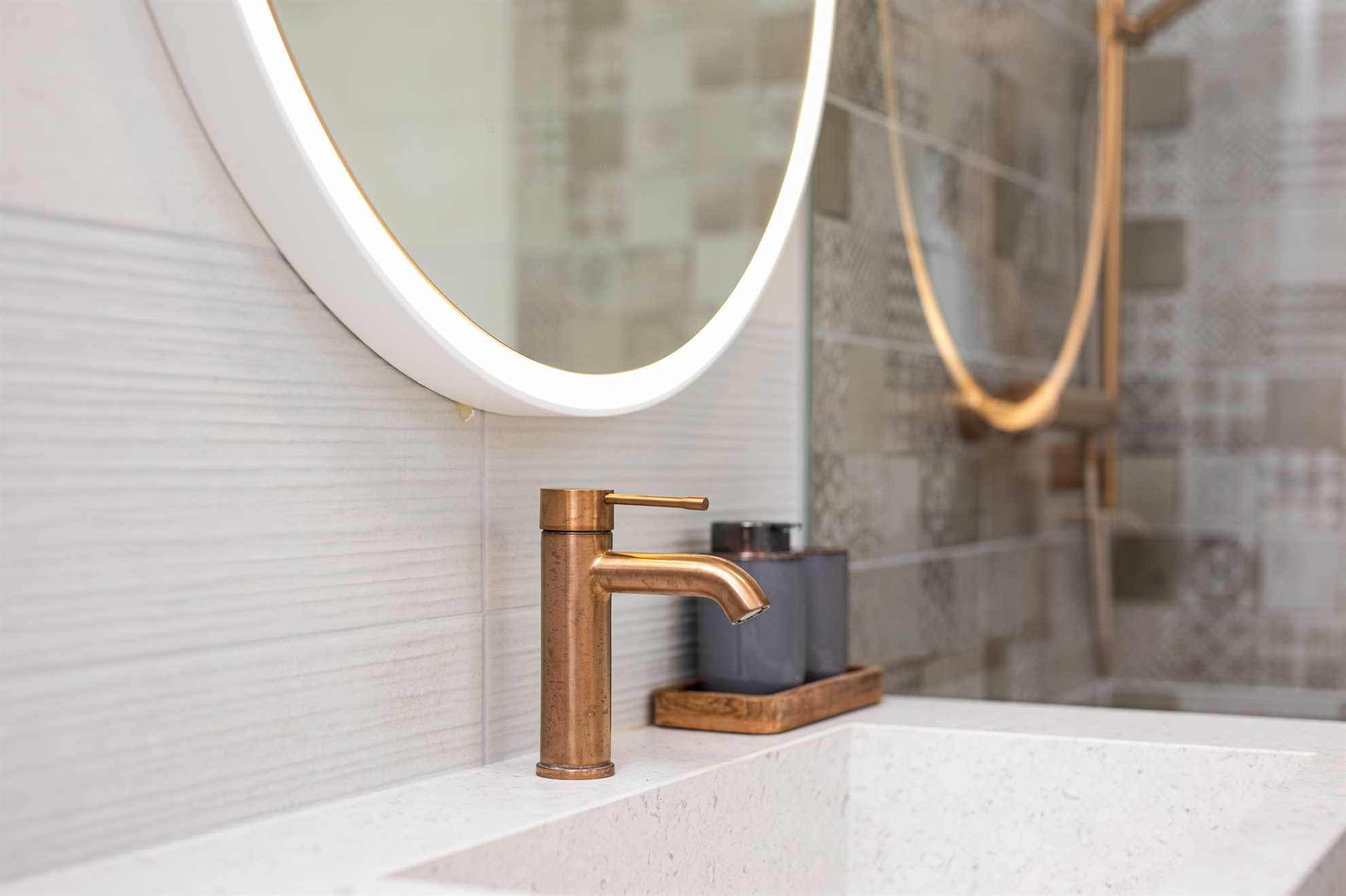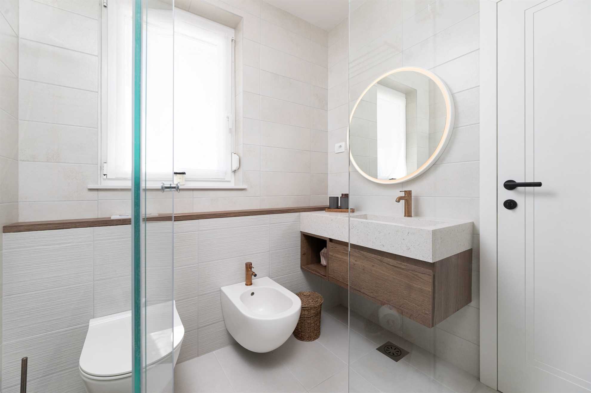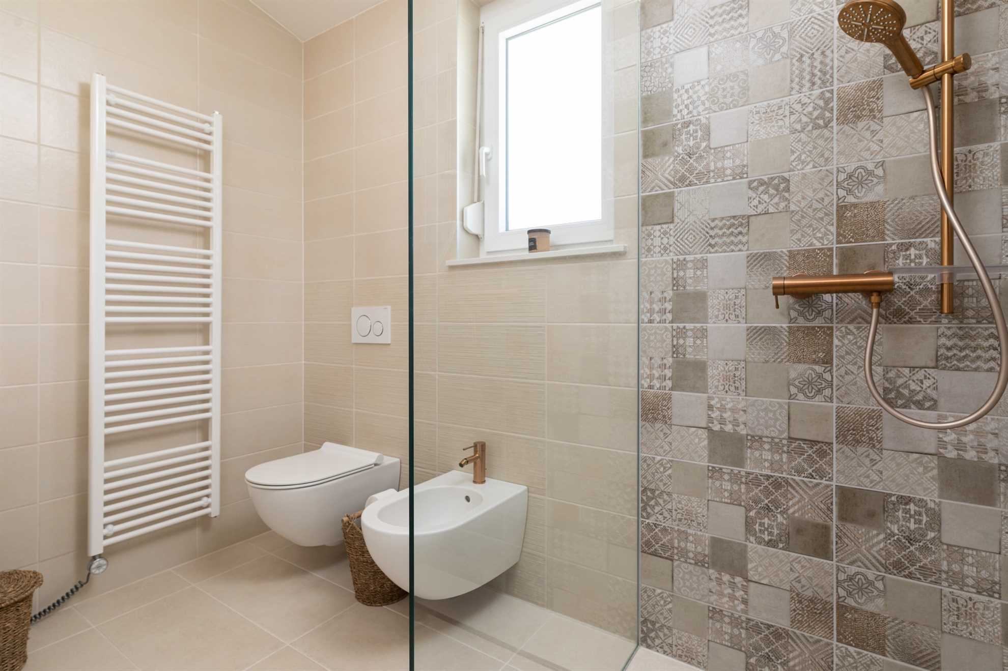 The first floor features two more elegantly furnished bedrooms, each with an en-suite bathroom and a balcony offering panoramic sea views. The bathrooms are equally well-equipped with modern amenities.
