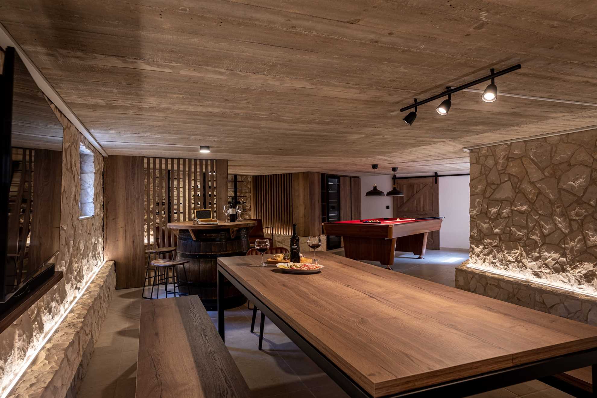 In the villa’s basement, you’ll find a cozy entertainment room with a pool table, a wine cellar, a TV, and a seating area. It’s the perfect spot for evening relaxation with friends and family. There is also a utility room with a washing machine, dryer, ironing equipment, and other essentials to ensure a comfortable stay.