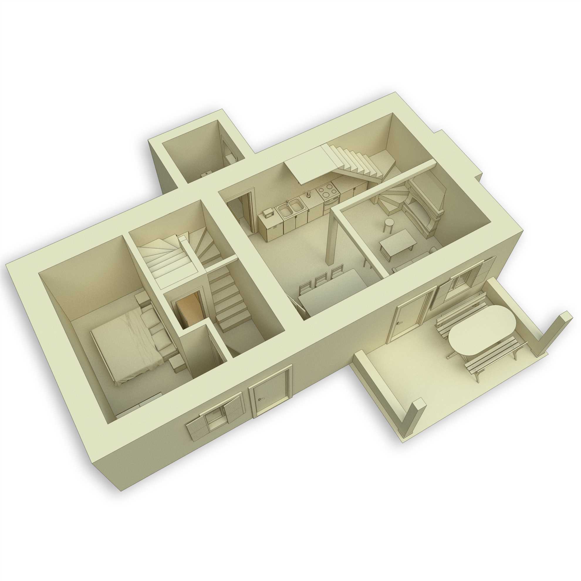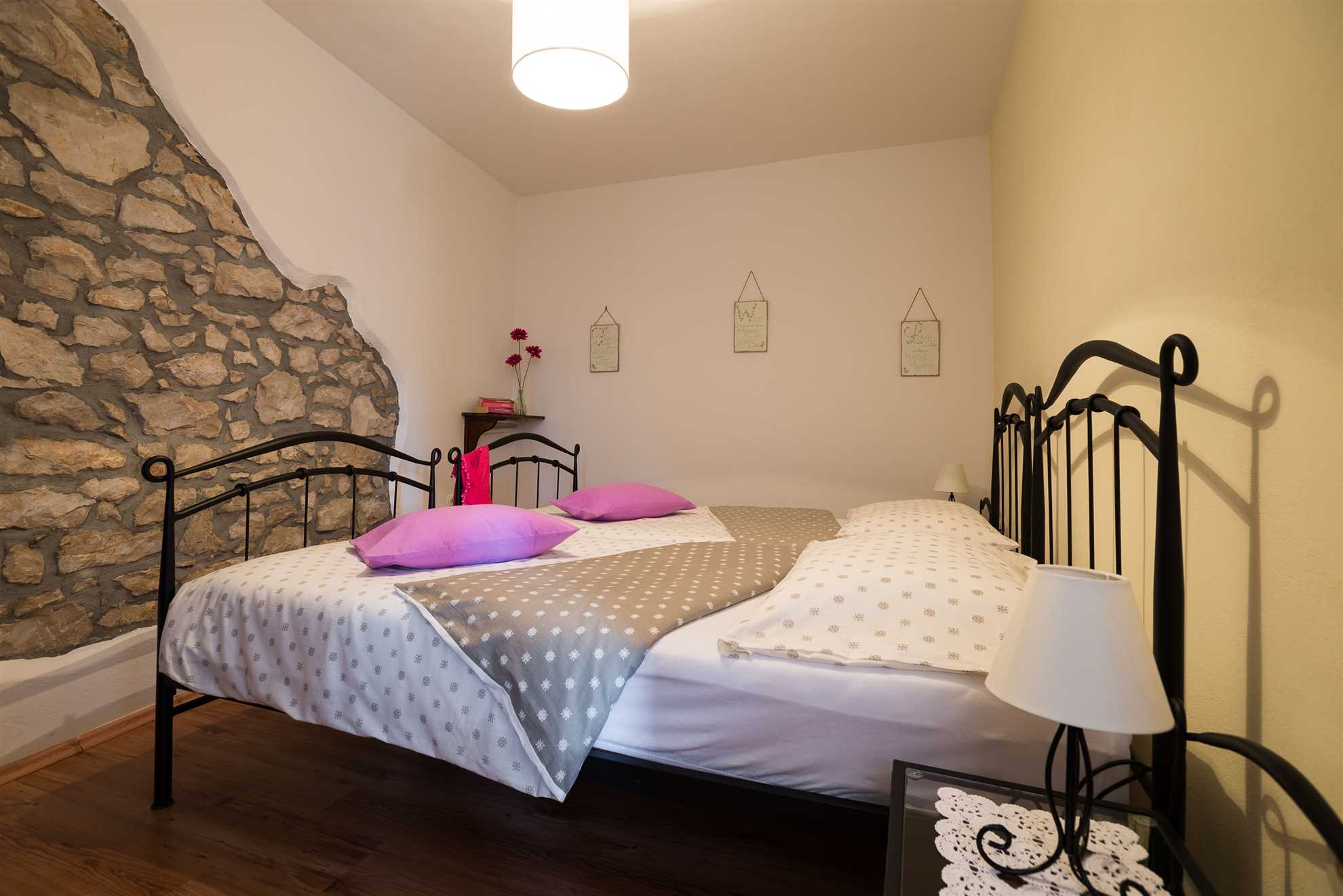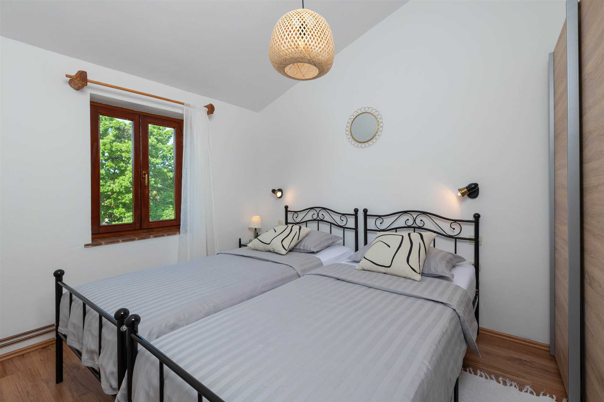 There are four bedrooms in total. On the first part of the house, there is one bedroom, equipped with a king-size bed (180x200 cm) on the first floor and one bedroom on the ground floor, equipped with a two single beds (90x200 cm). In the second part of the house, there is one bedroom with a king-size bed (180x200 cm) on the first floor and one bedroom on the ground floor, equipped with two single beds (90x200 cm).