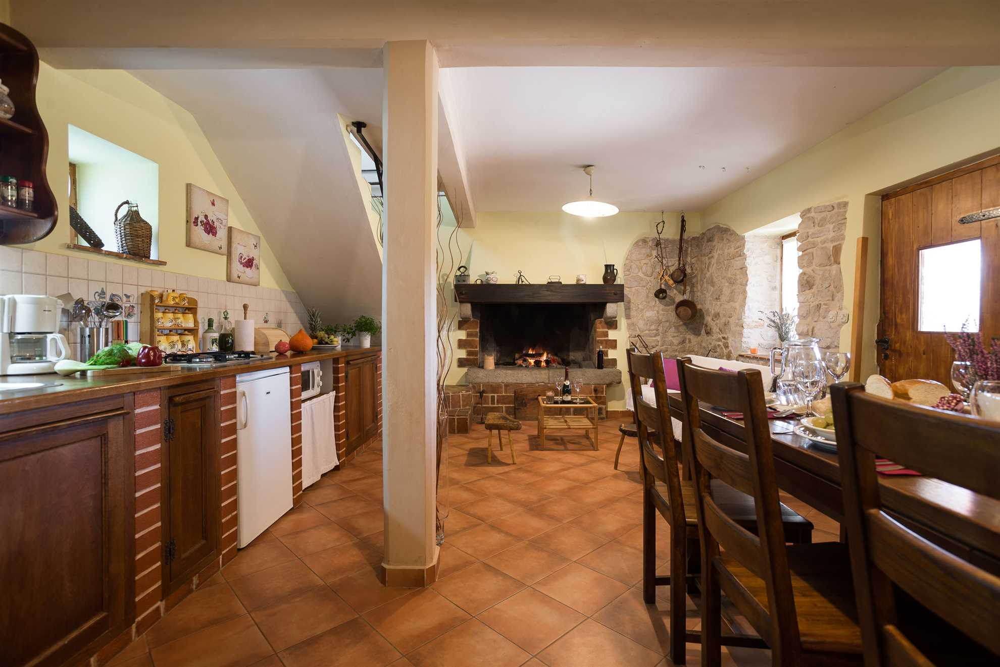 In the second part of the house is an open-space area with a living room with a fireplace, a dining area, and a kitchen. Close to the living room is a guest toilet.
