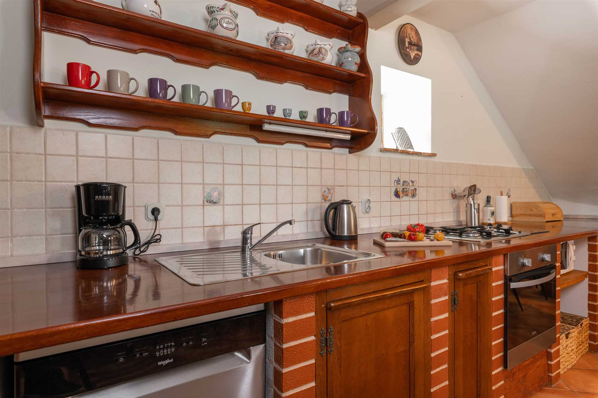 In the second part of the house, there is a fully equipped kitchen and a dining area with a dining table for eight people. A fridge, freezer, stove, oven, toaster, water kettle, and filter coffee machine.