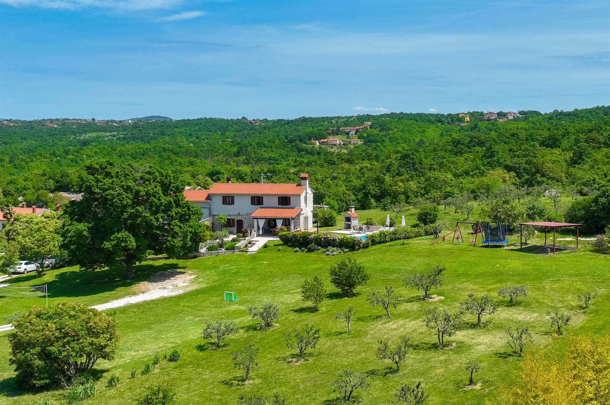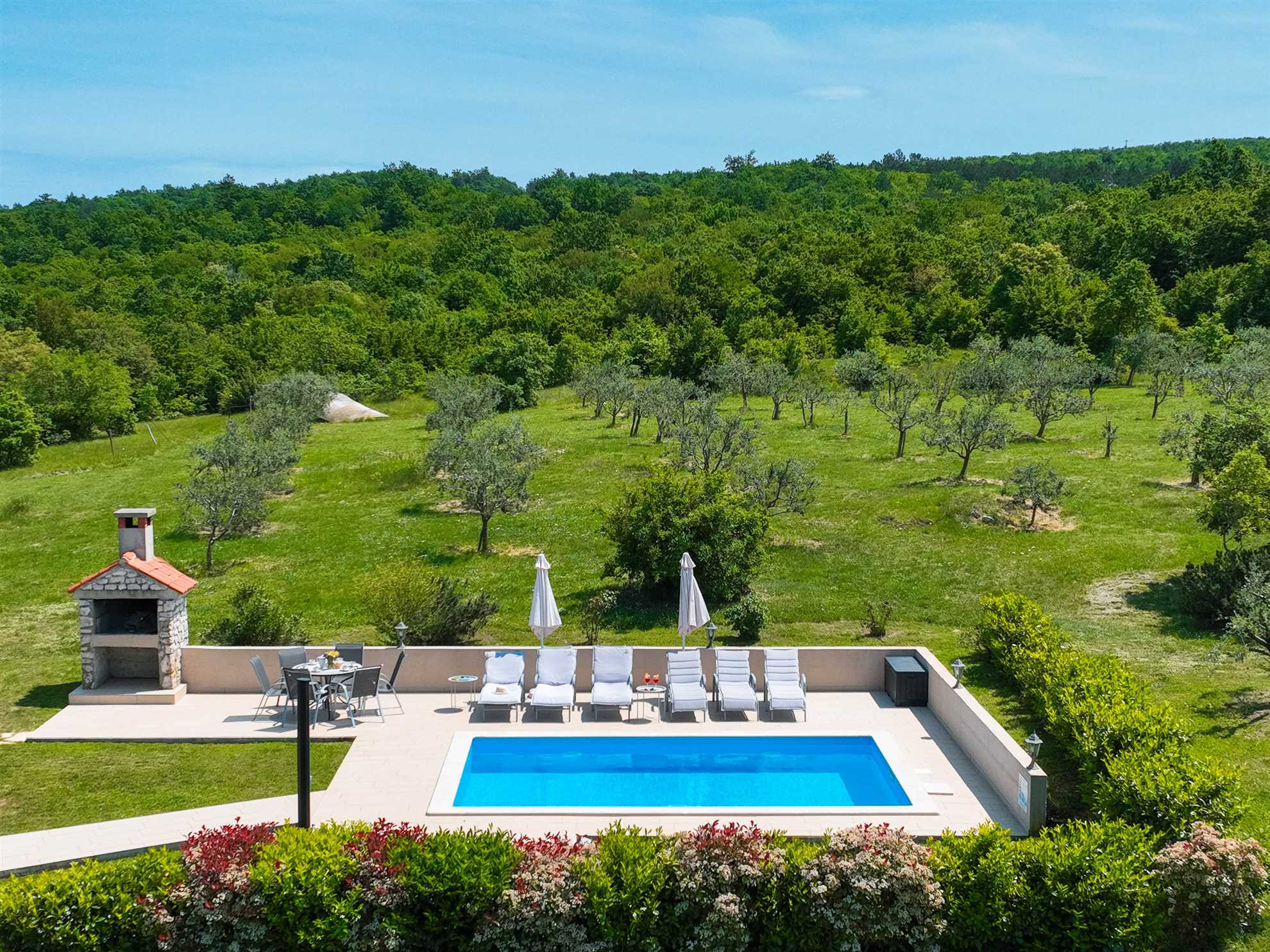 Casa Ivanovac beckons families, friends, and couples seeking a stress-relieving getaway. Boasting four bedrooms, two bathrooms, a private swimming pool, a patio, a deck area, and an outdoor fireplace.