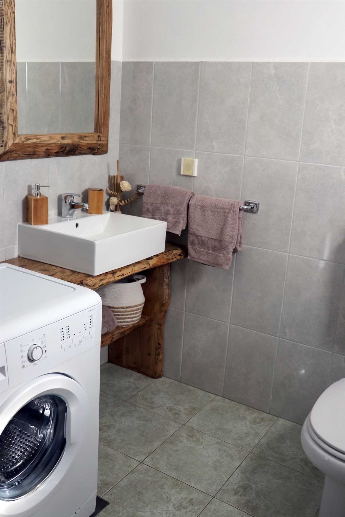 In the first section of the house, you'll find one bathroom with a shower and a guest toilet featuring a washing machine. In the second section, there is another bathroom with a shower and a guest toilet with a washer. Additionally, on the deck area, there is an outdoor shower with both cold and warm water.