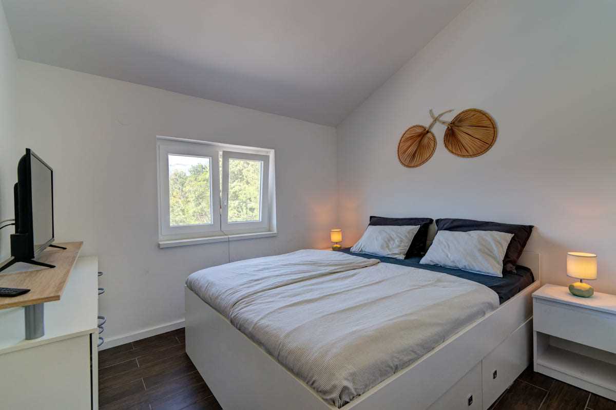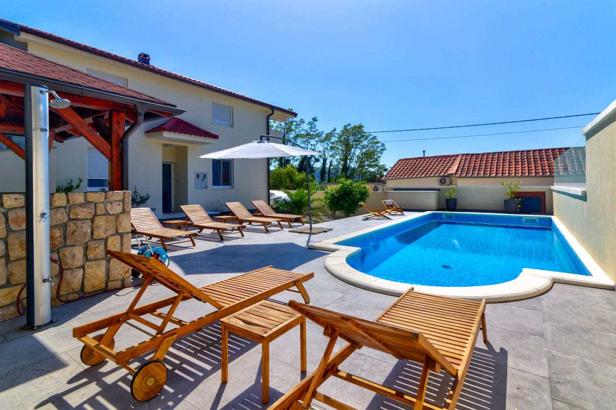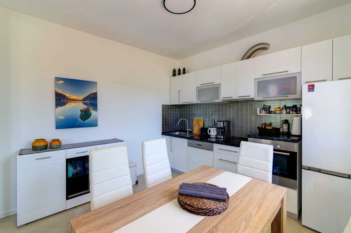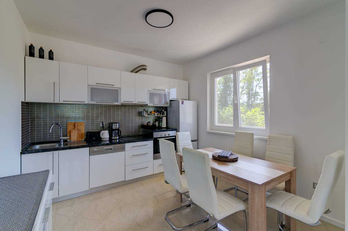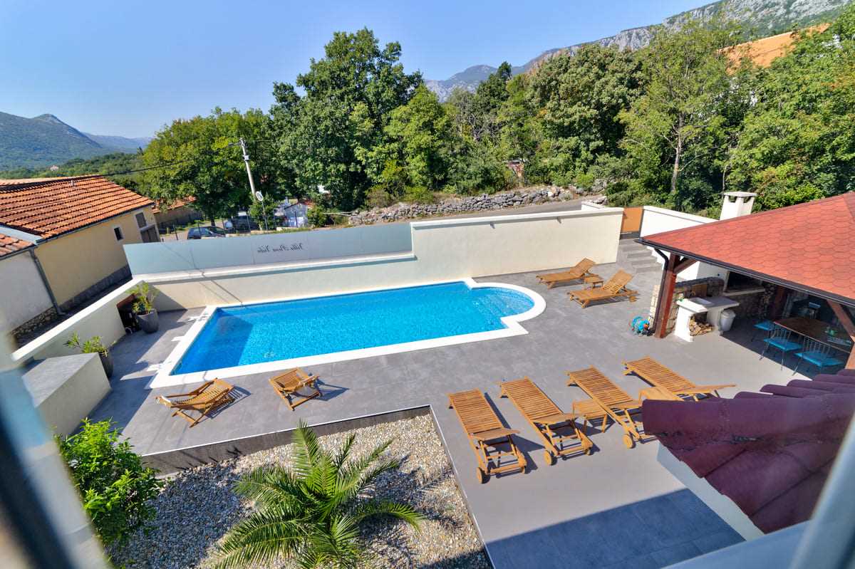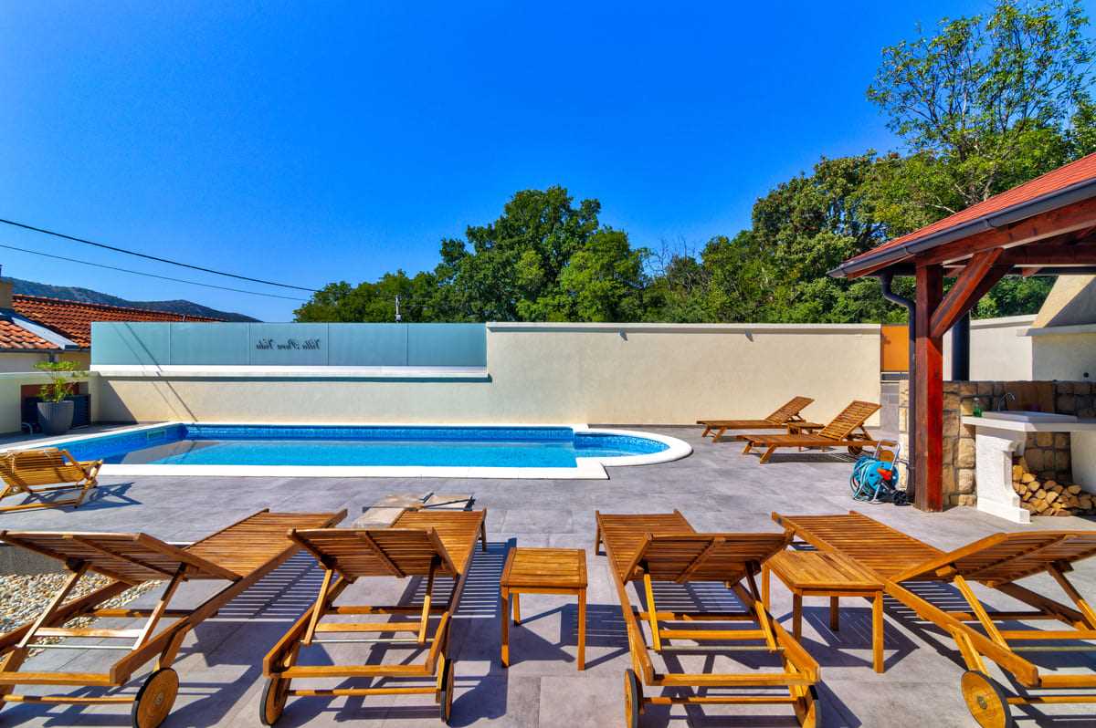 With an elegant saltwater pool and a quiet location close to Crikvenica town center, this beautiful holiday home offers everything you could wish for a relaxing holiday. When you enter the property, you will be enchanted by the harmonious combination of indoor and outdoor areas. The ground floor and first floor, together with the magnificent outdoor area, offer maximum enjoyment for families with children or friends longing for relaxation. The property is generously laid out and consists of a ground floor and a first floor, each with two bedrooms, a bathroom, a stylish living room and a state-of-the-art kitchen. The tasteful furnishings and carefully selected details give the house an inviting atmosphere that invites you to linger. The villa can accommodate up to 10 people, with 8 people being the optimal occupancy. Access from the ground floor to the first floor is via a picturesque external staircase. A covered terrace with a barbecue invites you to spend sociable evenings, while the well-kept garden and the spacious 32 m2 pool represent an oasis of relaxation. Parking spaces in the yard ensure convenient storage of vehicles. Located in a quiet and idyllic area, the villa is not suitable for parties and youth groups are not allowed. This guarantees guests an undisturbed and relaxing break in this dreamlike environment. This villa is undoubtedly a place where unforgettable memories are created. Discover the beauty and comfort of this property and let yourself be enchanted by its unique atmosphere.