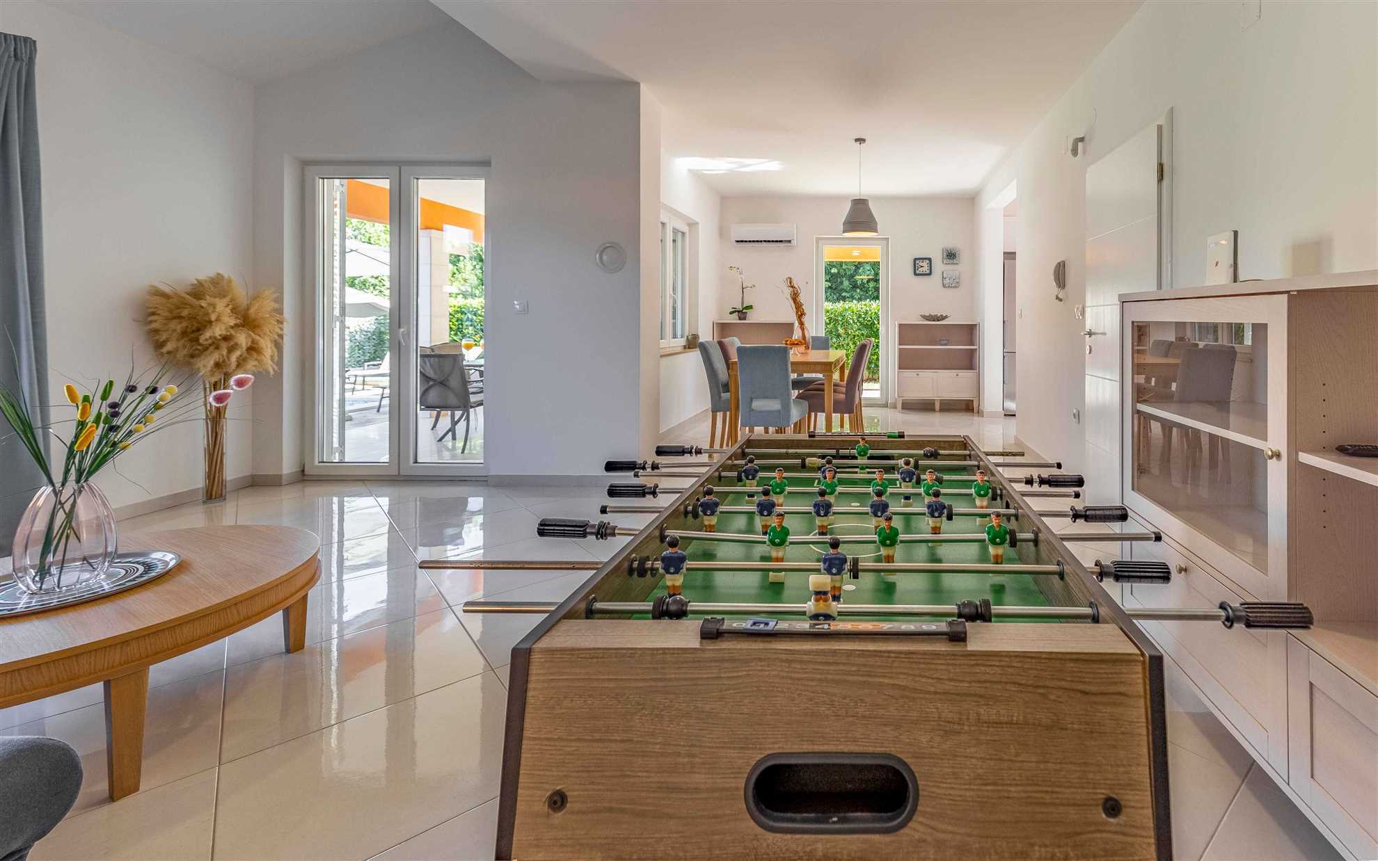 The fully equipped kitchen boasts state-of-the-art appliances and a delightful dining area, creating the perfect setting for preparing and savoring delicious meals together. Unwind in the cozy living room, complete with a table football game for endless entertainment.