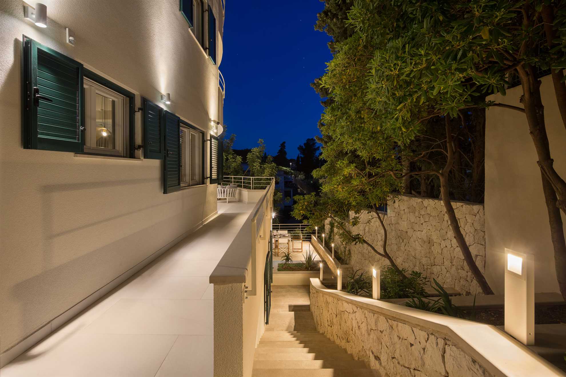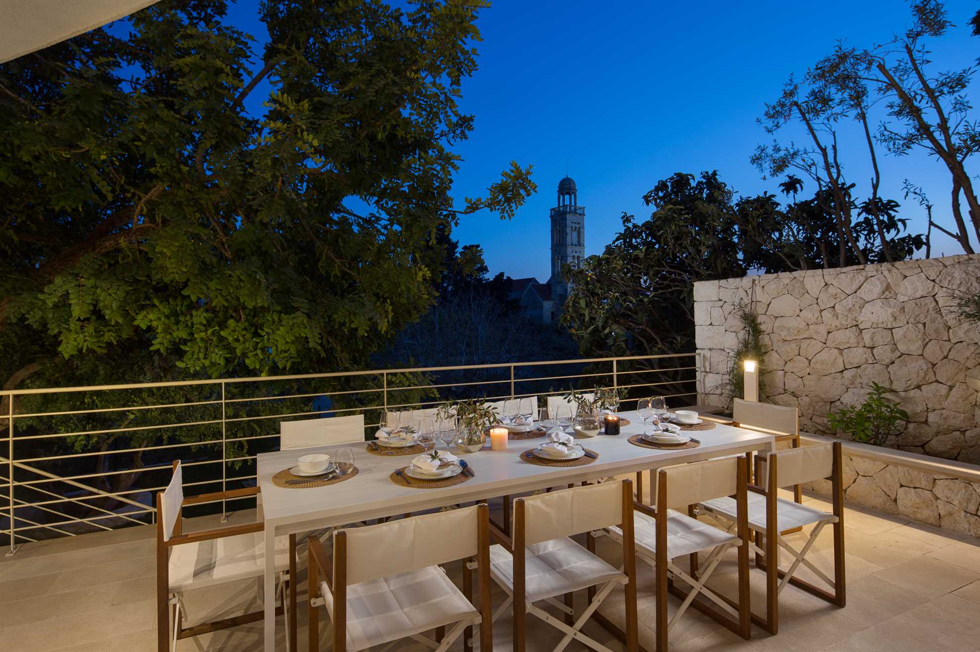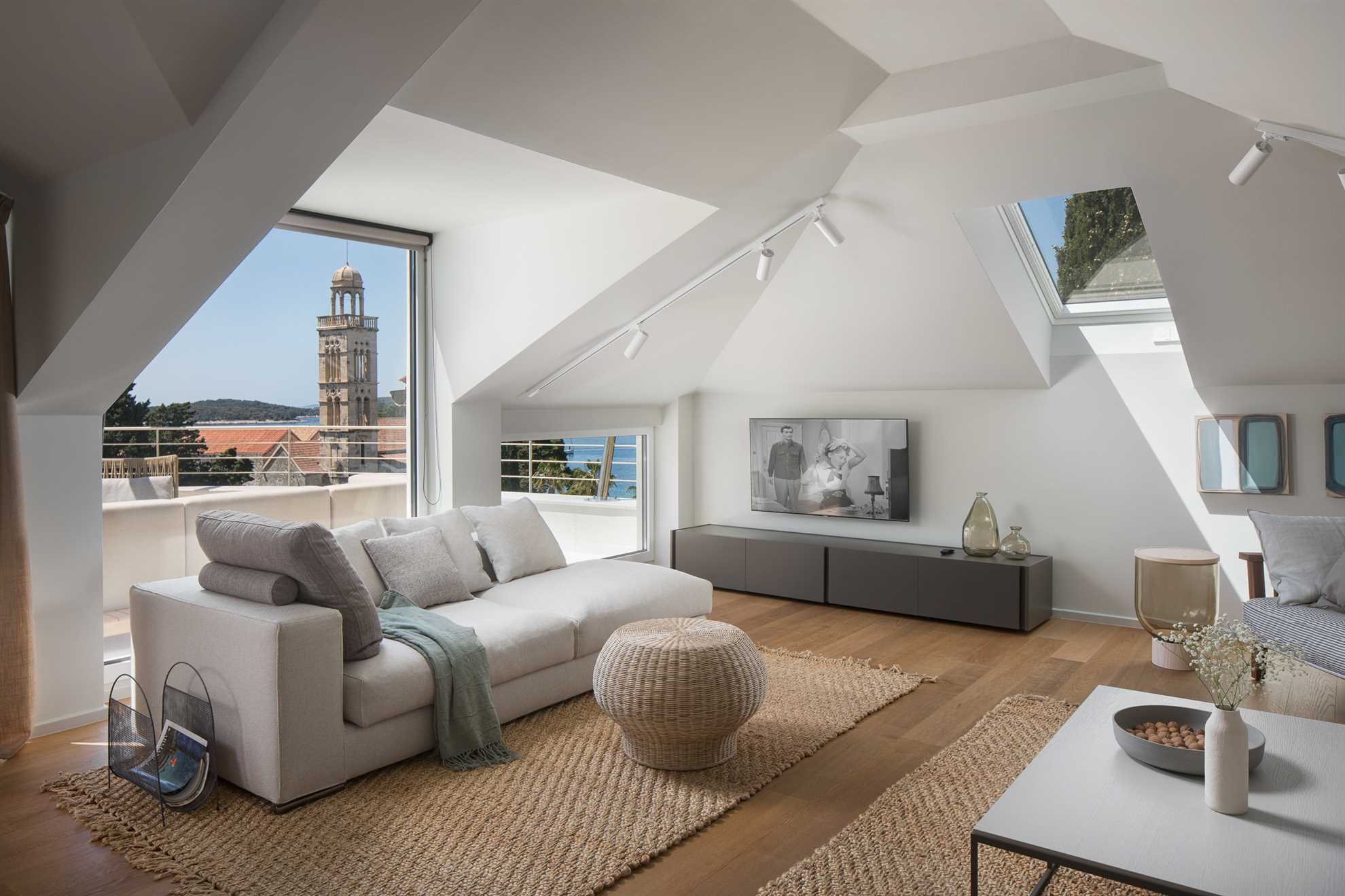 A stone throw’s away from Old Town Hvar, also the beach, restaurants and cafés, plus a luxurious view of the sea and the historic Franciscan monastery, Villa Amore doesn’t seize to amaze any observer. With four specious levels, each with its own living area, a kitchen, and an entrance to a terrace or a balcony, this holiday home gives way to privacy for multiple families. Staring at the top is the attic, with a living room and one of the ensuite bedrooms with an exit to a charming terrace keeping a Jacuzzi, an outdoor kitchen and a large dining table. Level below occupies another kitchen with a dining area, plus a living room and two of the ensuite bedrooms. On the 1st floor is another kitchen with a dining area, a living room, and two of the ensuite bedrooms. Finally, the airy and bright ground floor presents a large kitchen with a living area, a dining table set for 12, the final ensuite bedroom, as well as a massage and fitness studio. From here access a charming garden with a 30 m² heated pool surrounded by sun loungers. Splendid views of the Adriatic and the surrounding greenery can be enjoyed from every corner.