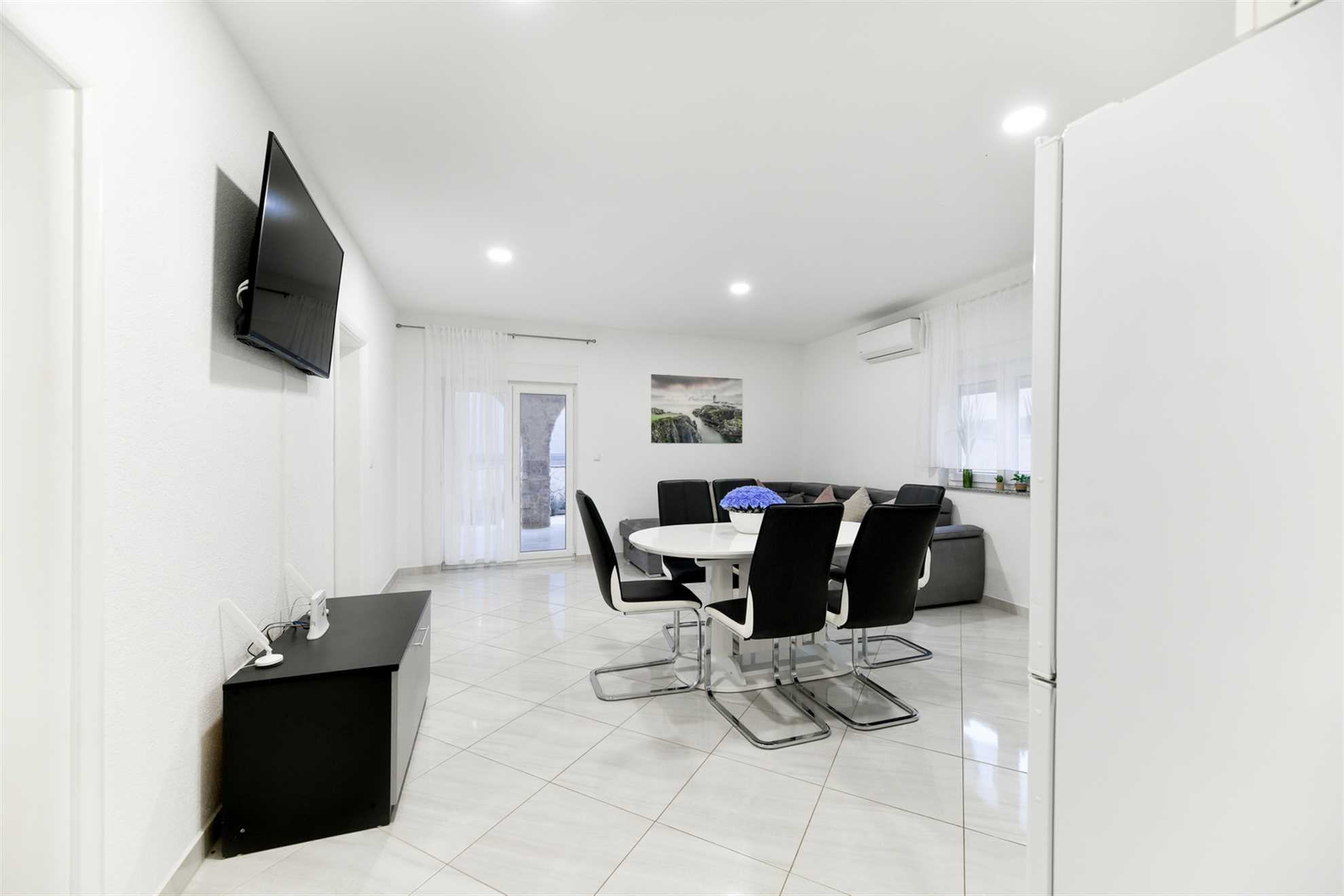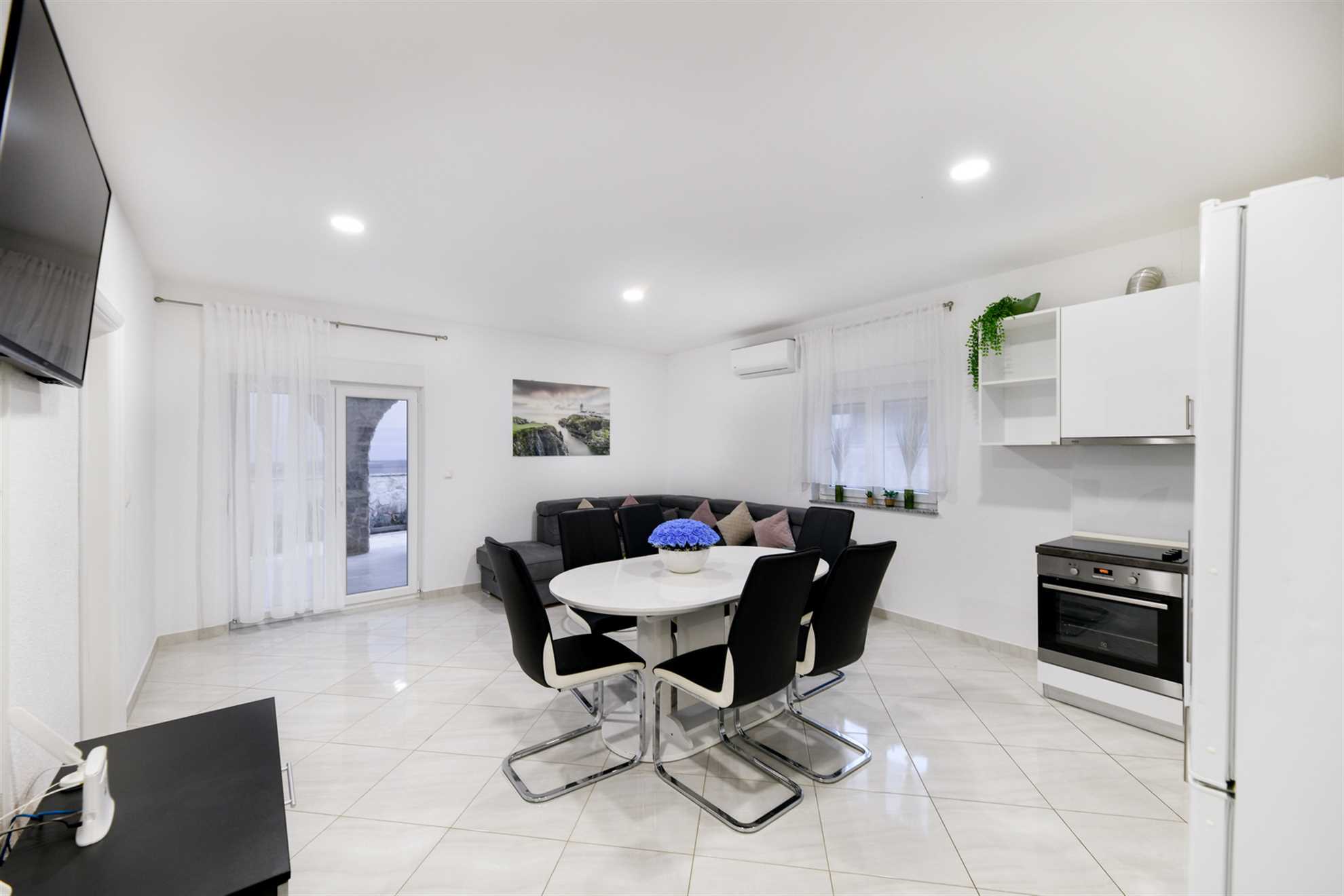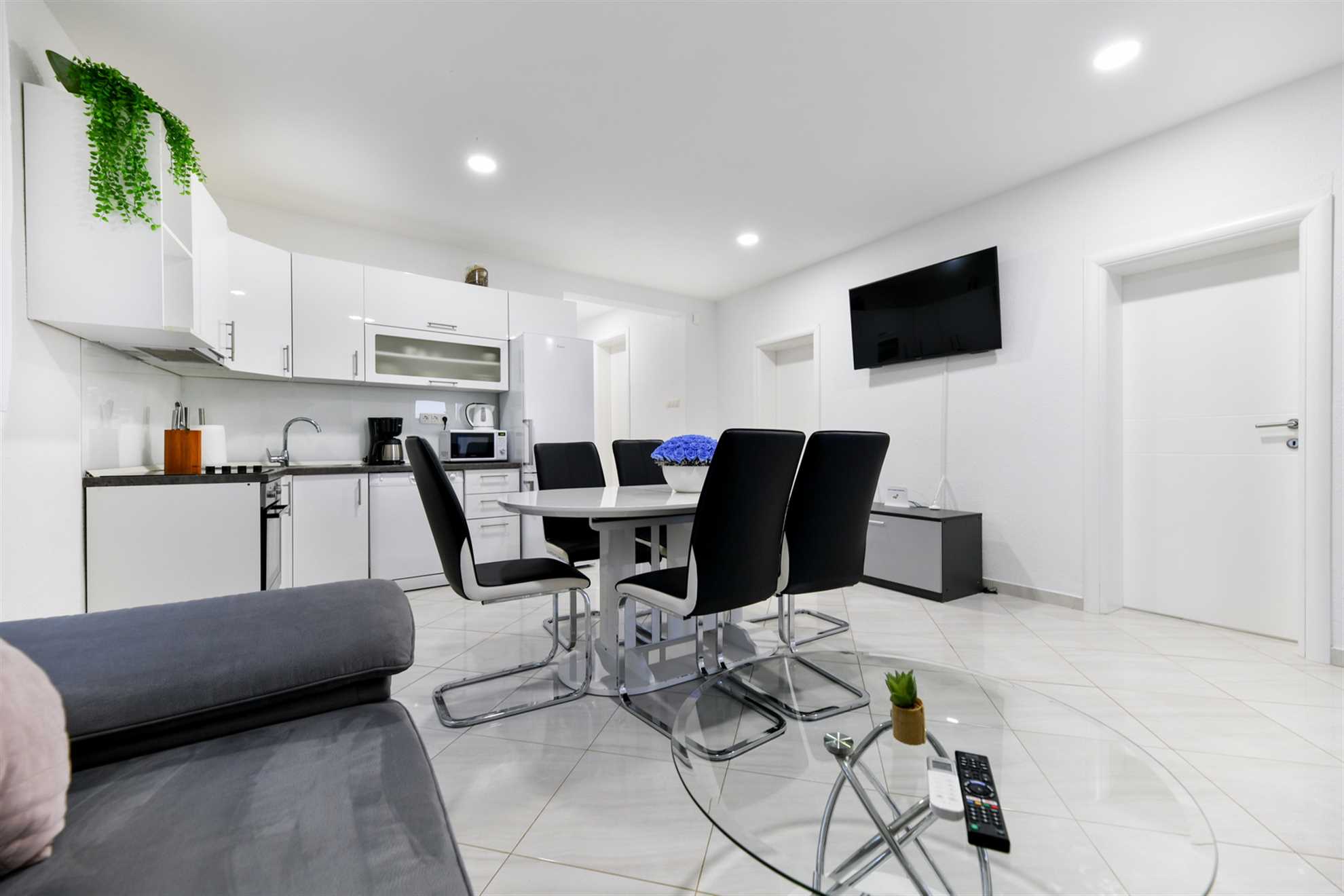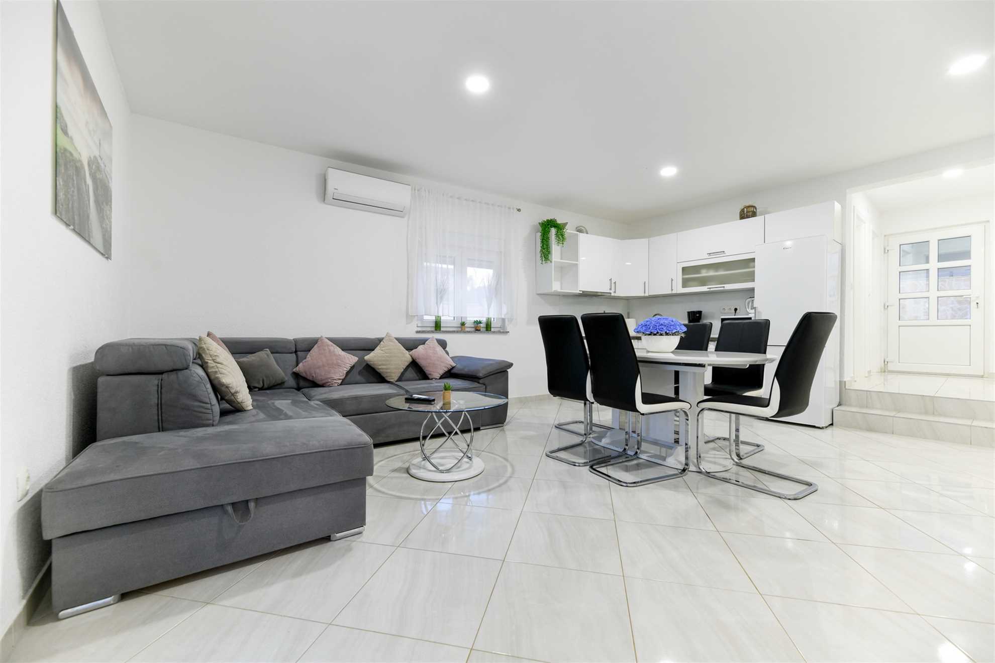 A spacious, air-conditioned living room with satellite TV is connected to a fully equipped kitchen with a capsule coffee machine. There is a dining table and a big sofa bed that ensures a sleeping space for 2 people. A living room has a direct exit to a backyard patio. The part in front of the living room balcony door is covered/shaded and equipped with 2 sets of garden furniture: one for dining and one for the lounge.