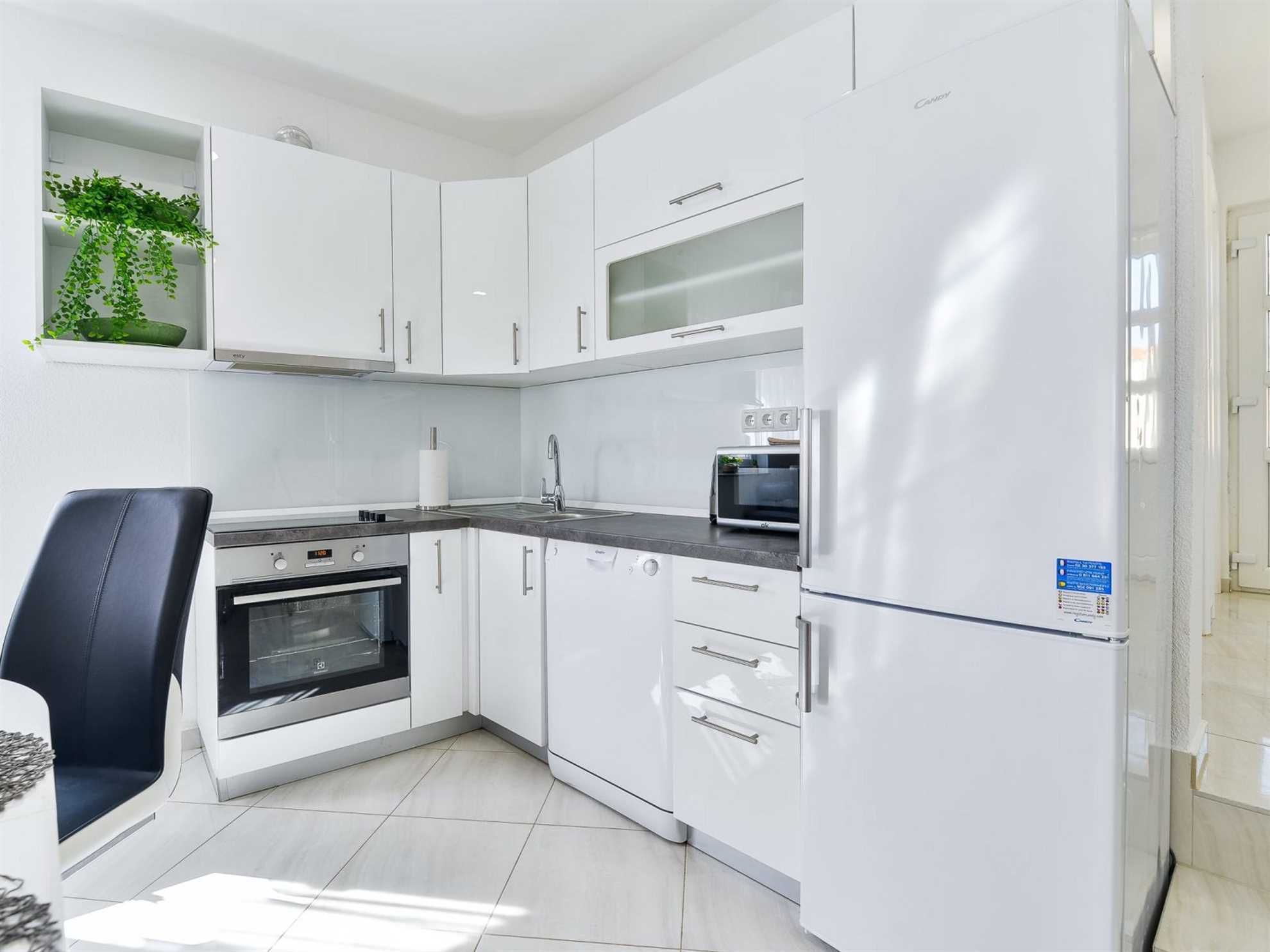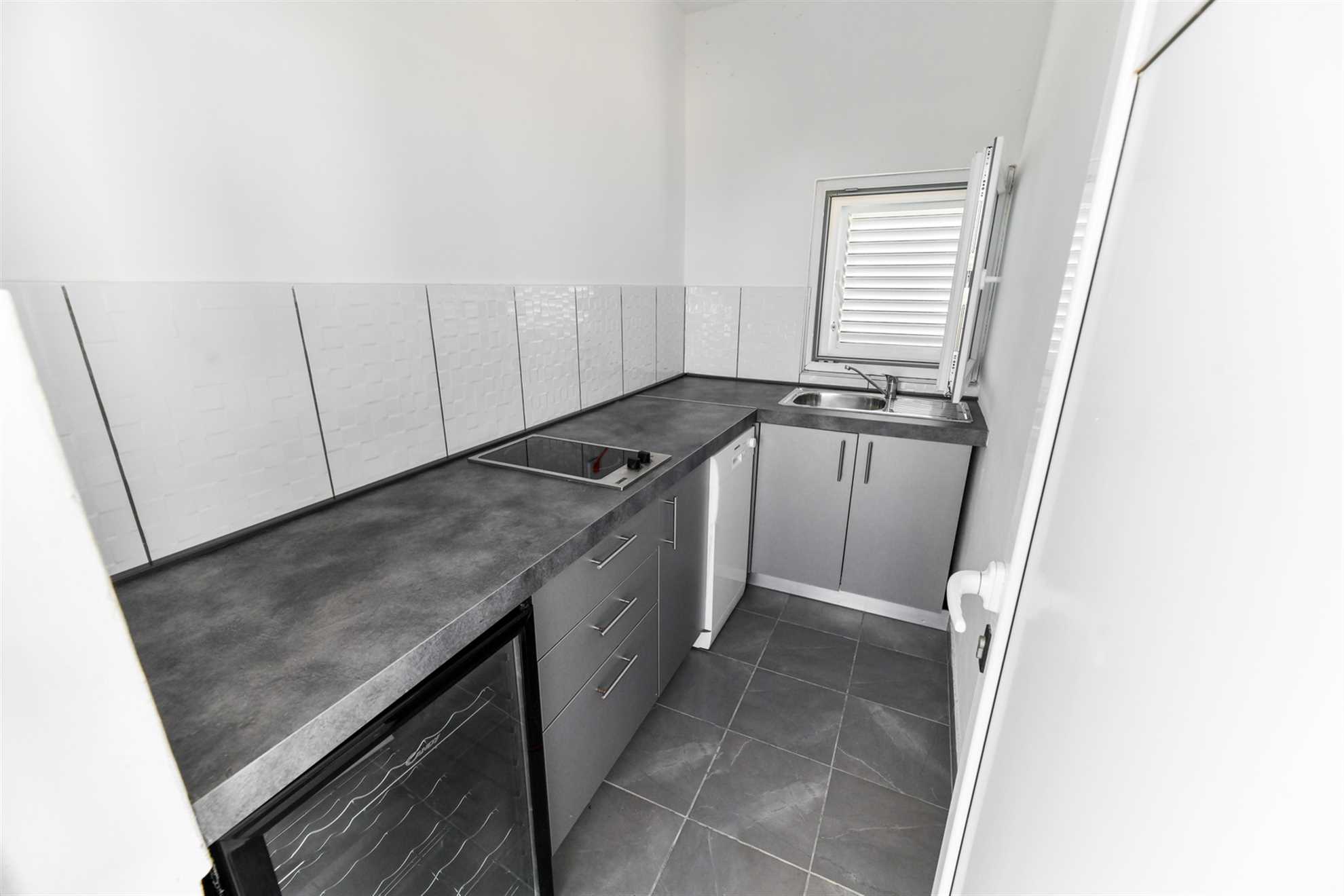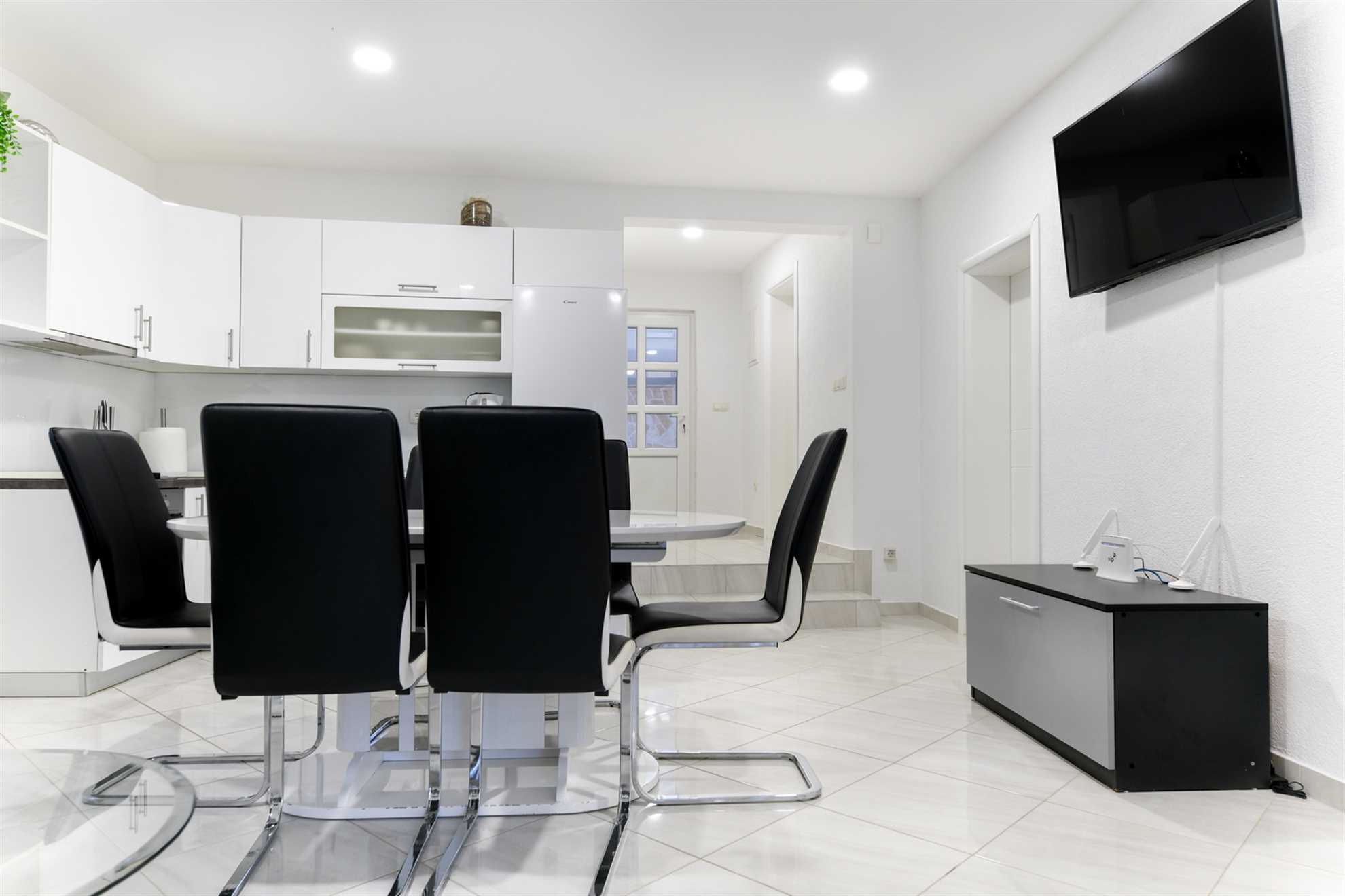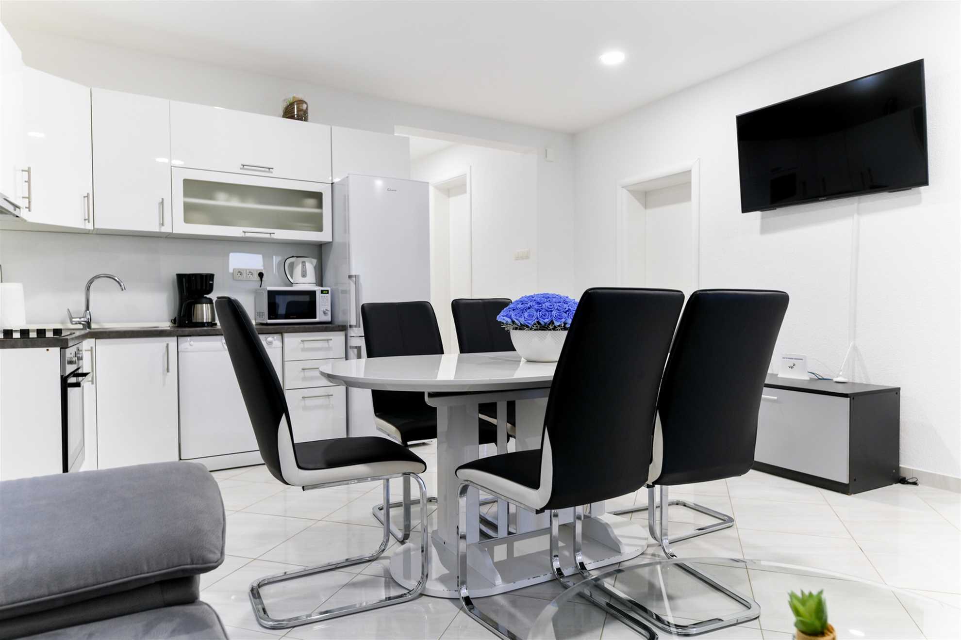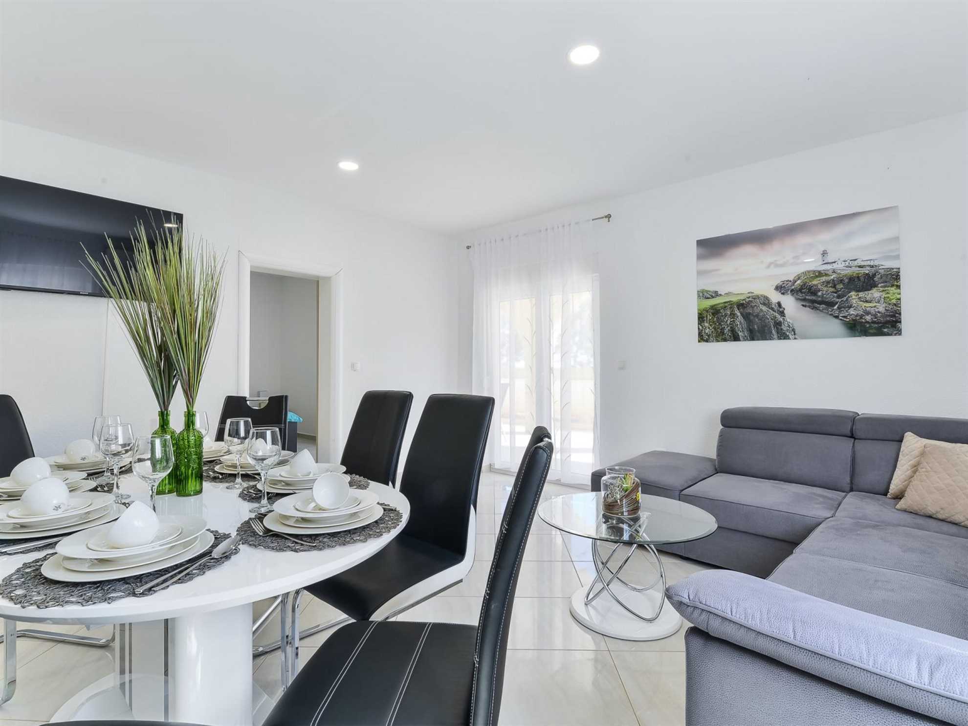 A spacious, air-conditioned living room with satellite TV is connected to a fully equipped kitchen with a capsule coffee machine. There is a dining table and a big sofa bed that ensures a sleeping space for 2 people. A living room has a direct exit to a backyard patio. The part in front of the living room balcony door is covered/shaded and equipped with 2 sets of garden furniture: one for dining and one for the lounge.
