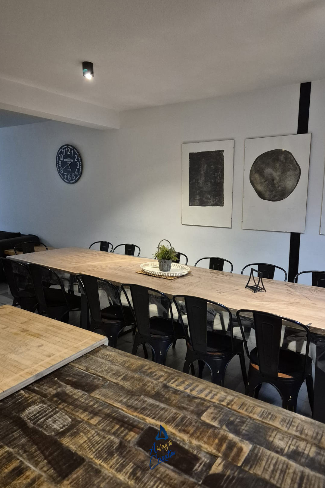 In the lower ground floor, there is a spacious entertainment room with a comfortable seating area, TV, and PlayStation, as well as a large dining table for 16, a fully equipped kitchen, and a bathroom – an ideal space for the entire group to relax and spend quality time together.