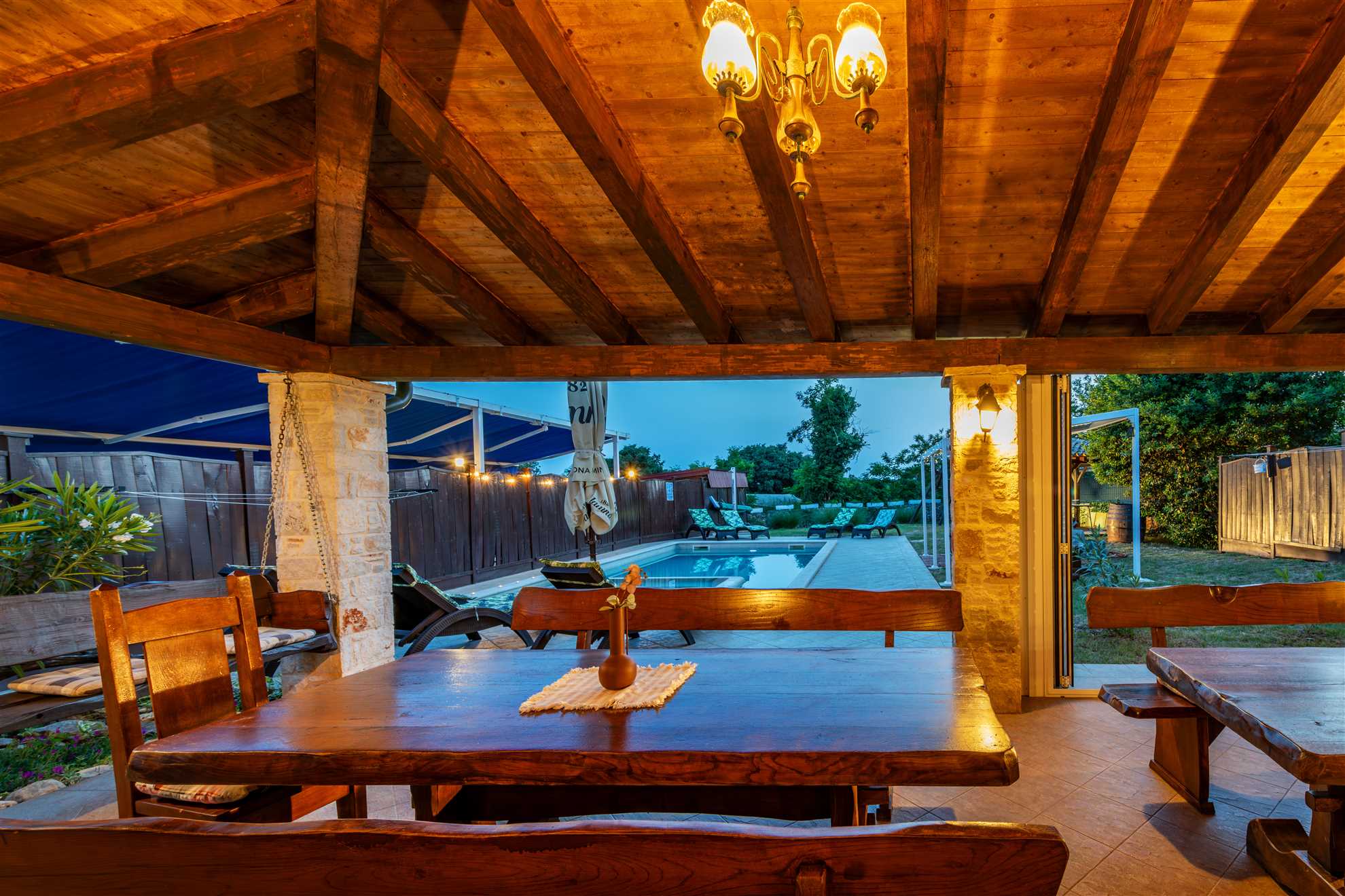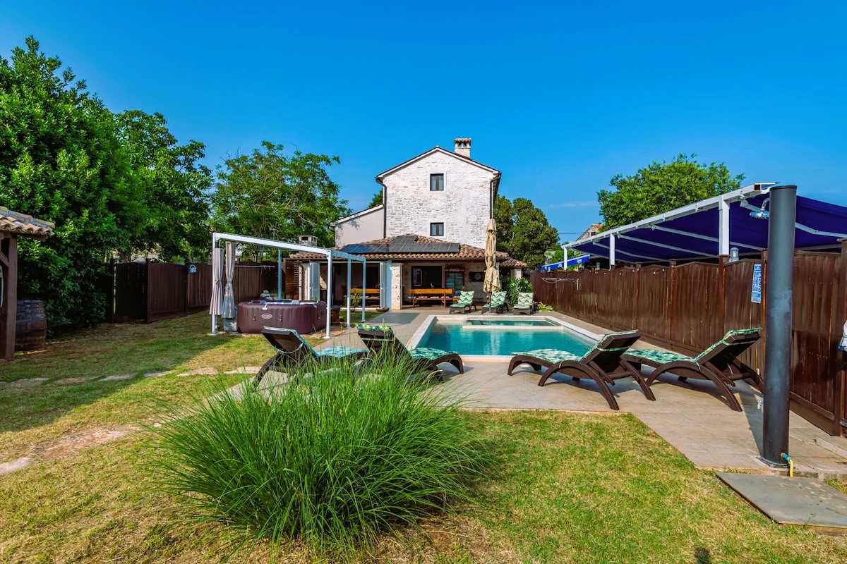The ground floor has a spacious living room with access to a large covered terrace with fireplace, where there is also a table tennis, table football and electronic darts. In front of the house there is a beautiful heated swimming pool with children's pool and whirlpool. The heating is solar and increases the pool temperature in sunny weather. The villa also features a sauna.