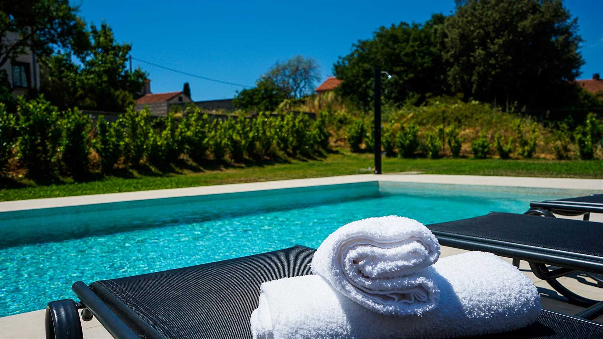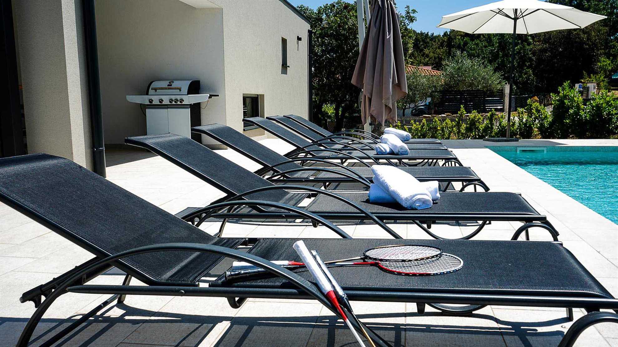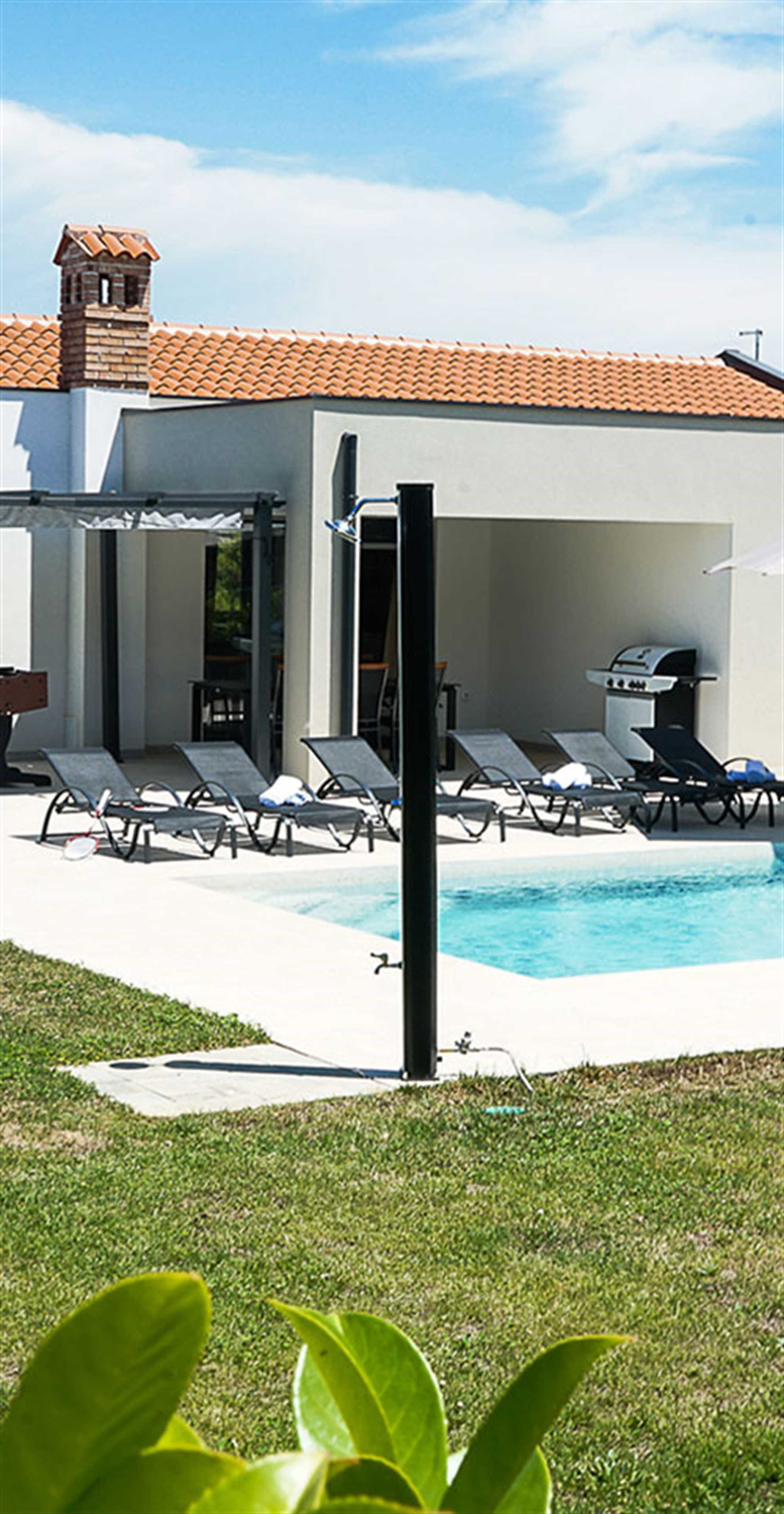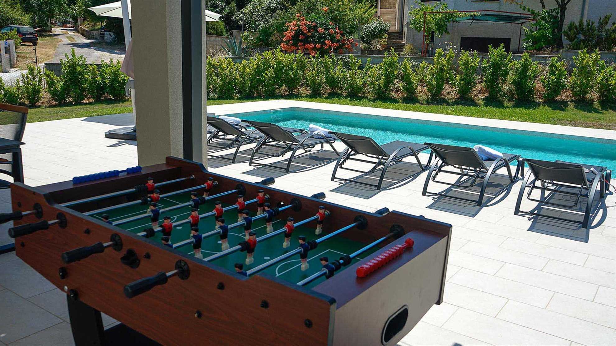 This villa is a modernly appointed villa situated in the city of Pula. It offers 3 bedrooms and 4 bathrooms and can accommodate up to 6 persons in comfort. The ground floor features a large, open-plan living area next to a spacious kitchen with all the amenities you might need to prepare a great family meal. After that you might decide to relax next to the gorgeous swimming pool, continue your culinary adventure on the outdoor BBQ and dining area or perhaps challenge someone to a friendly game of table football.