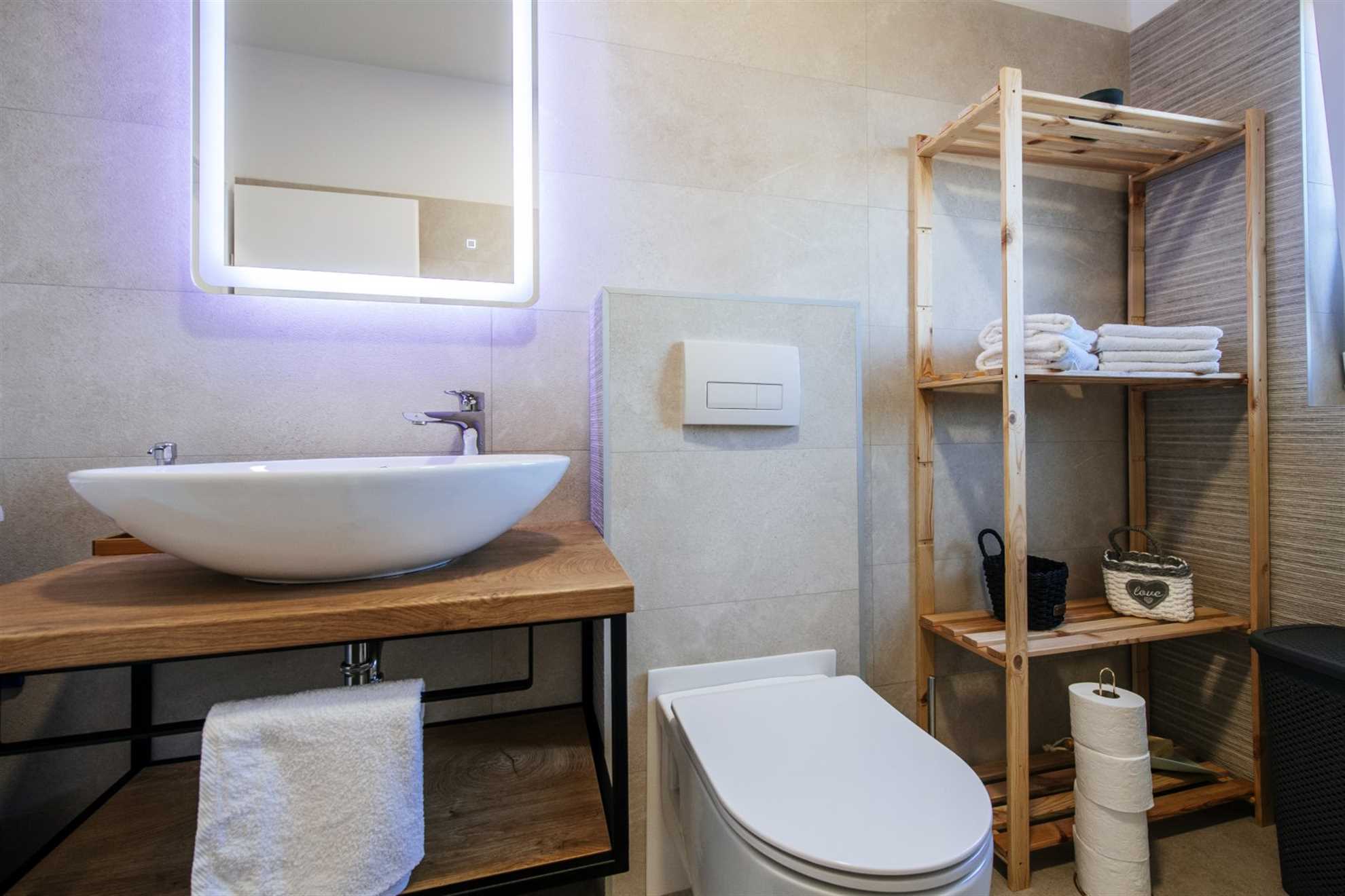 The living room is equipped with a large, fold-out sofa with a sleeping function and has a direct exit to a nice sunny balcony (11 m2) which is a zone of peace and relaxation. It offers an extraordinary view of the sea, islands and green olive groves that surround the villa from almost all sides. There is a set of balcony lounge furniture.