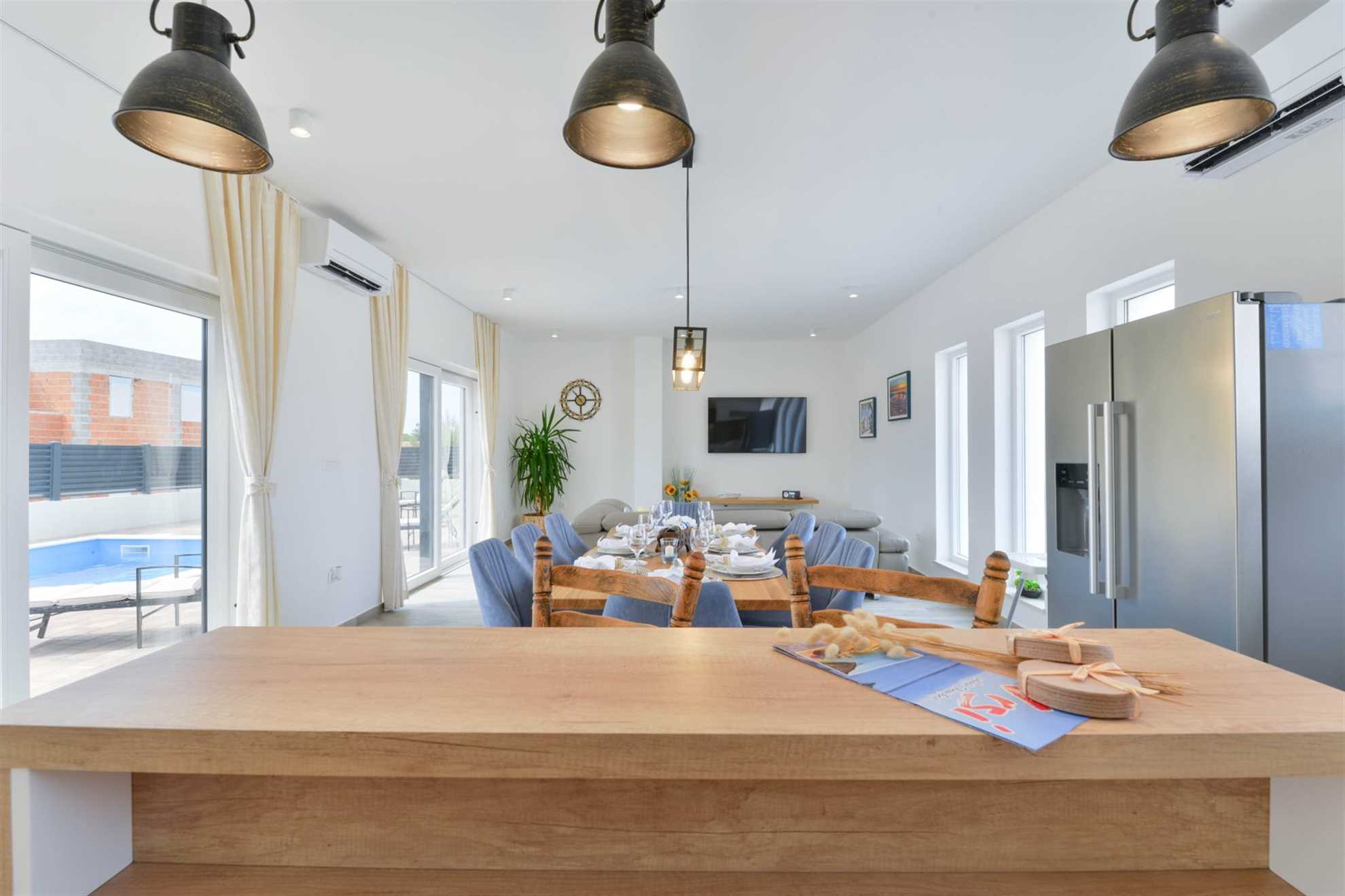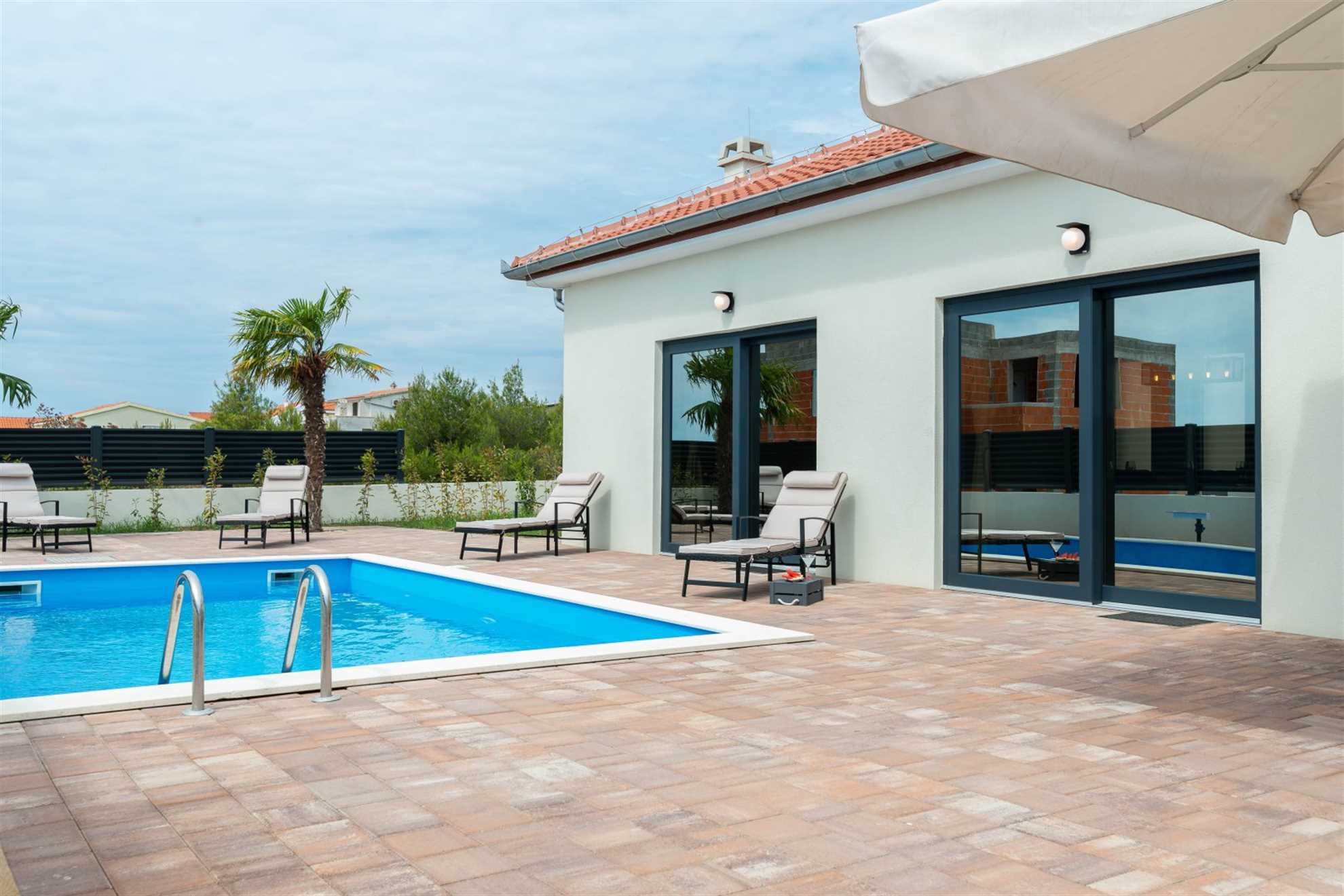 A modern and cosy furnished villa with a swimming pool and a mini playground for children is situated on a hill, in a quiet part of Vrsi Mulo.