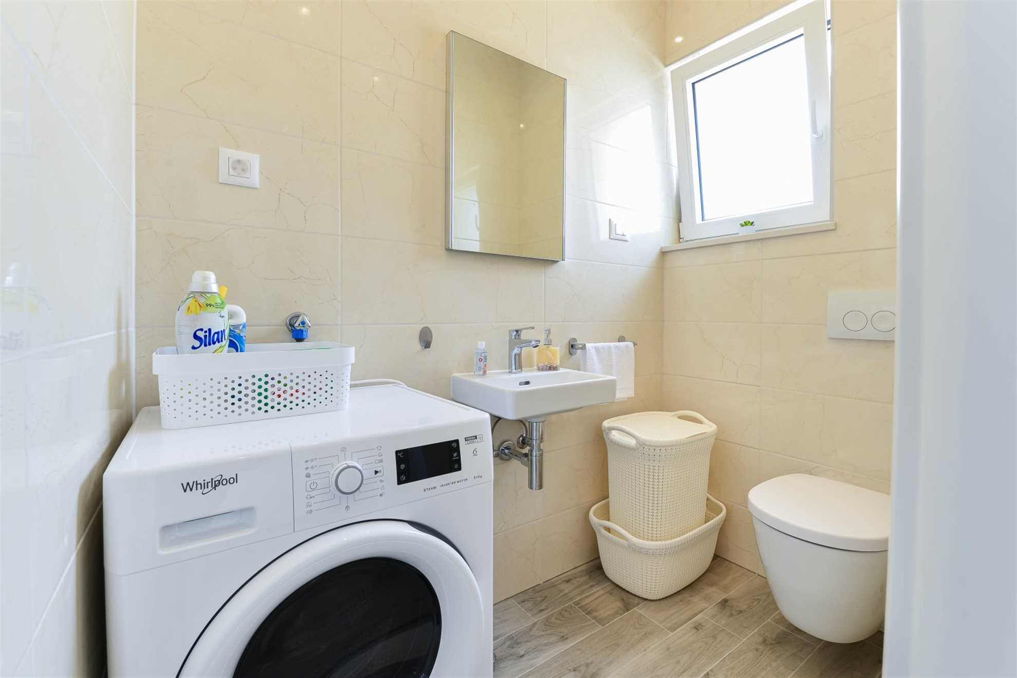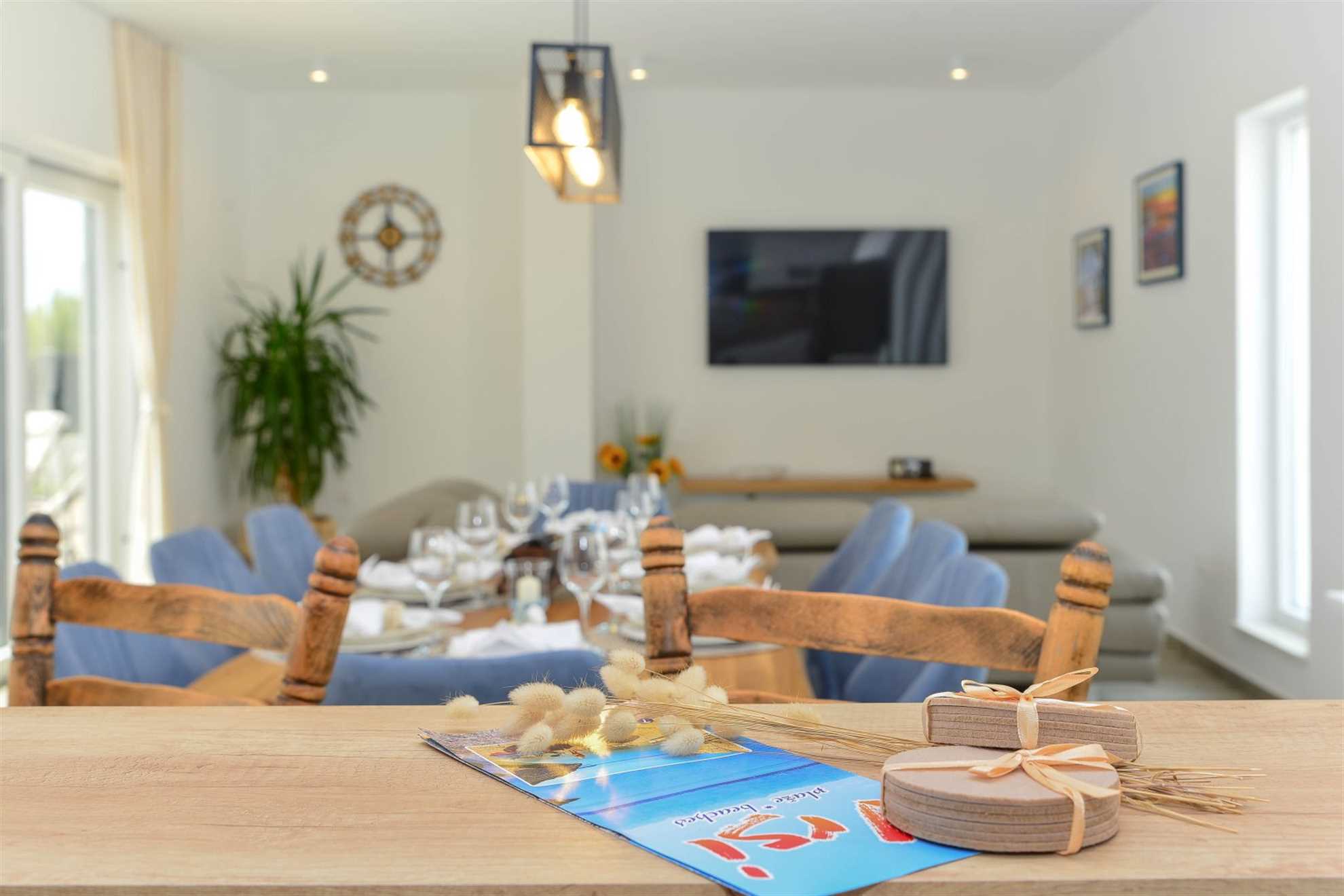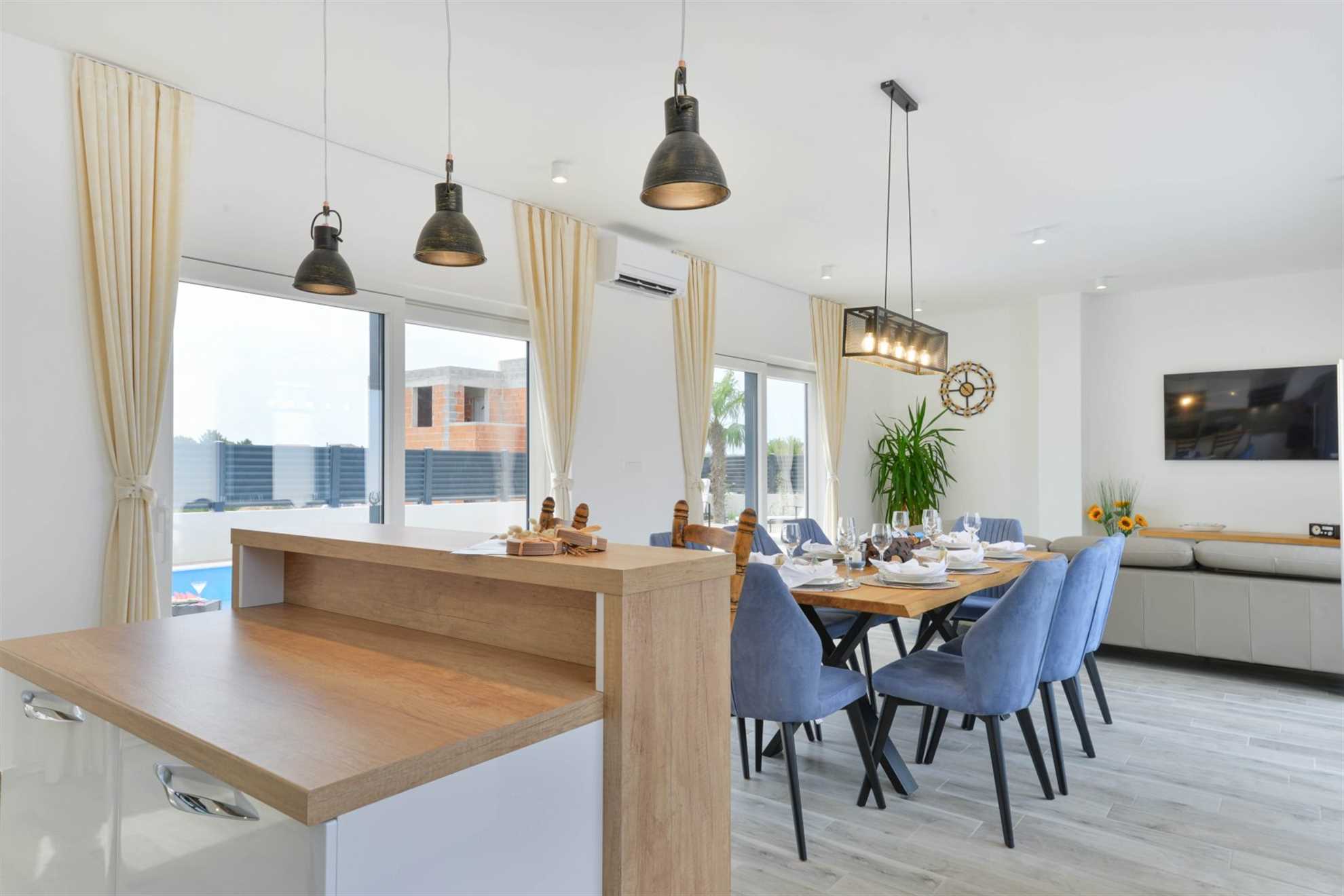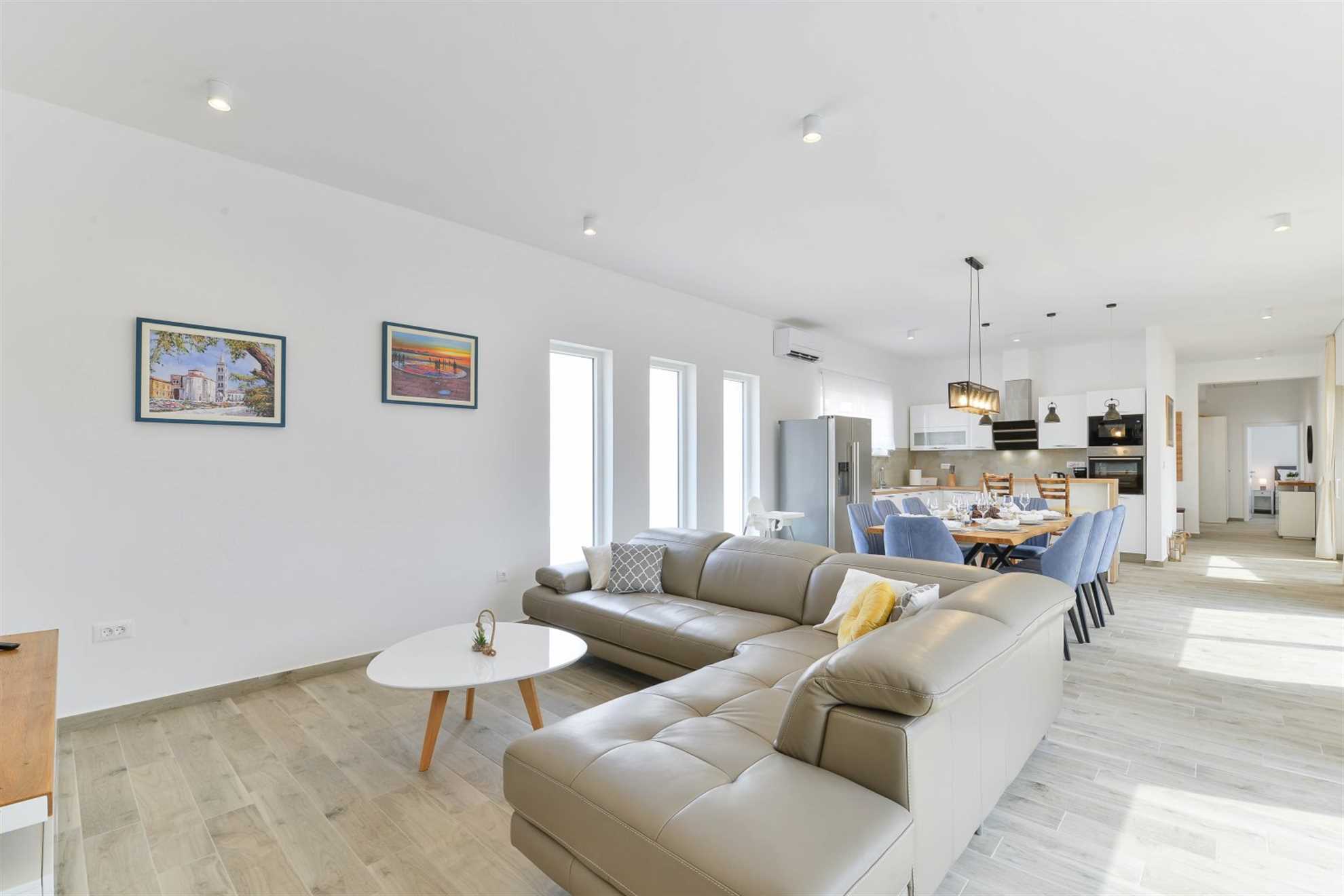 All of the rooms are located on the ground floor. A daily part of the house open space concept with a spacious air-conditioned living room (seating set) connected to a fully equipped kitchen, a dining area (table and chair for 8) and a guest toilet.