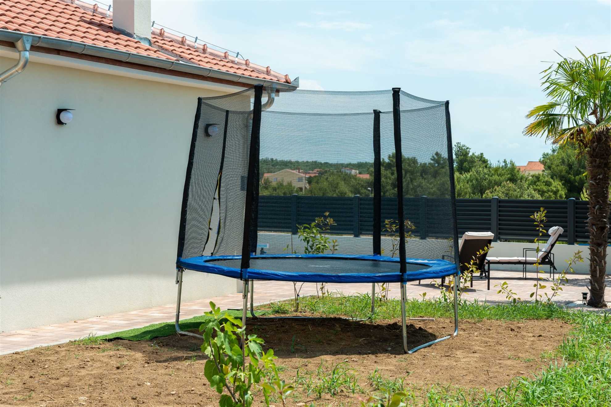 The daily part has a direct exit to a sun terrace with a swimming pool. Sun loungers and umbrellas are at guest disposal. There is also a seating area with a set of garden furniture designed for outdoor dining. A kid's corner is equipped with a trampoline.