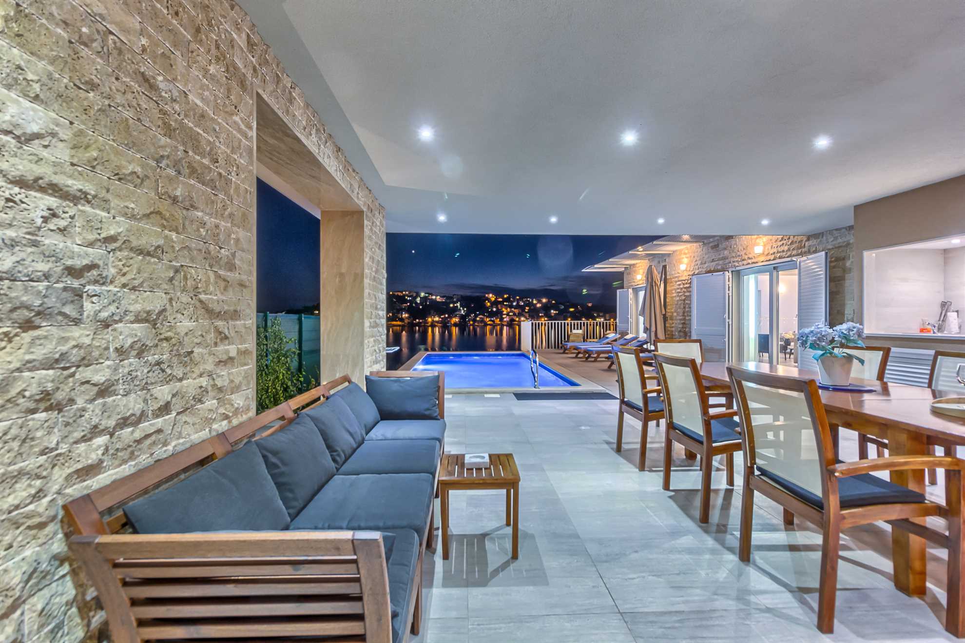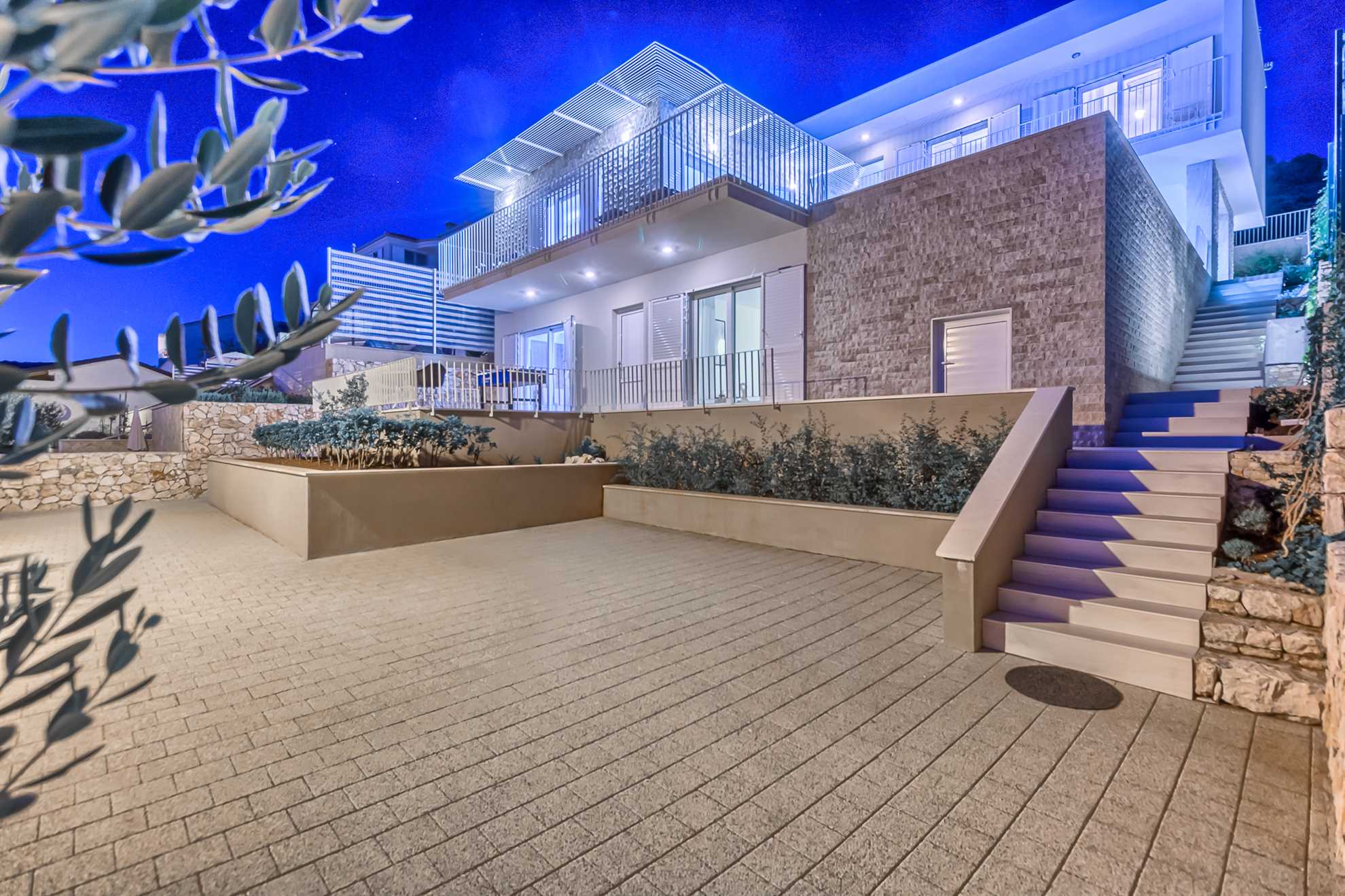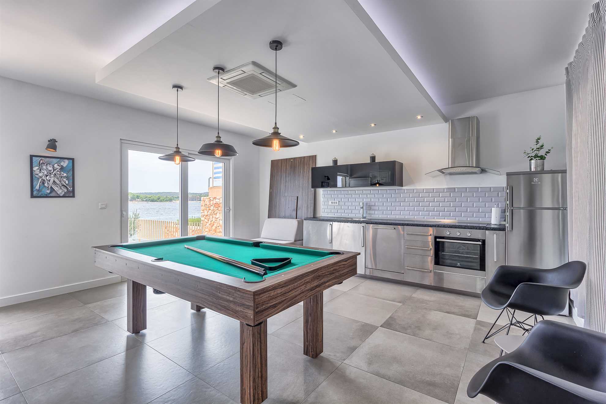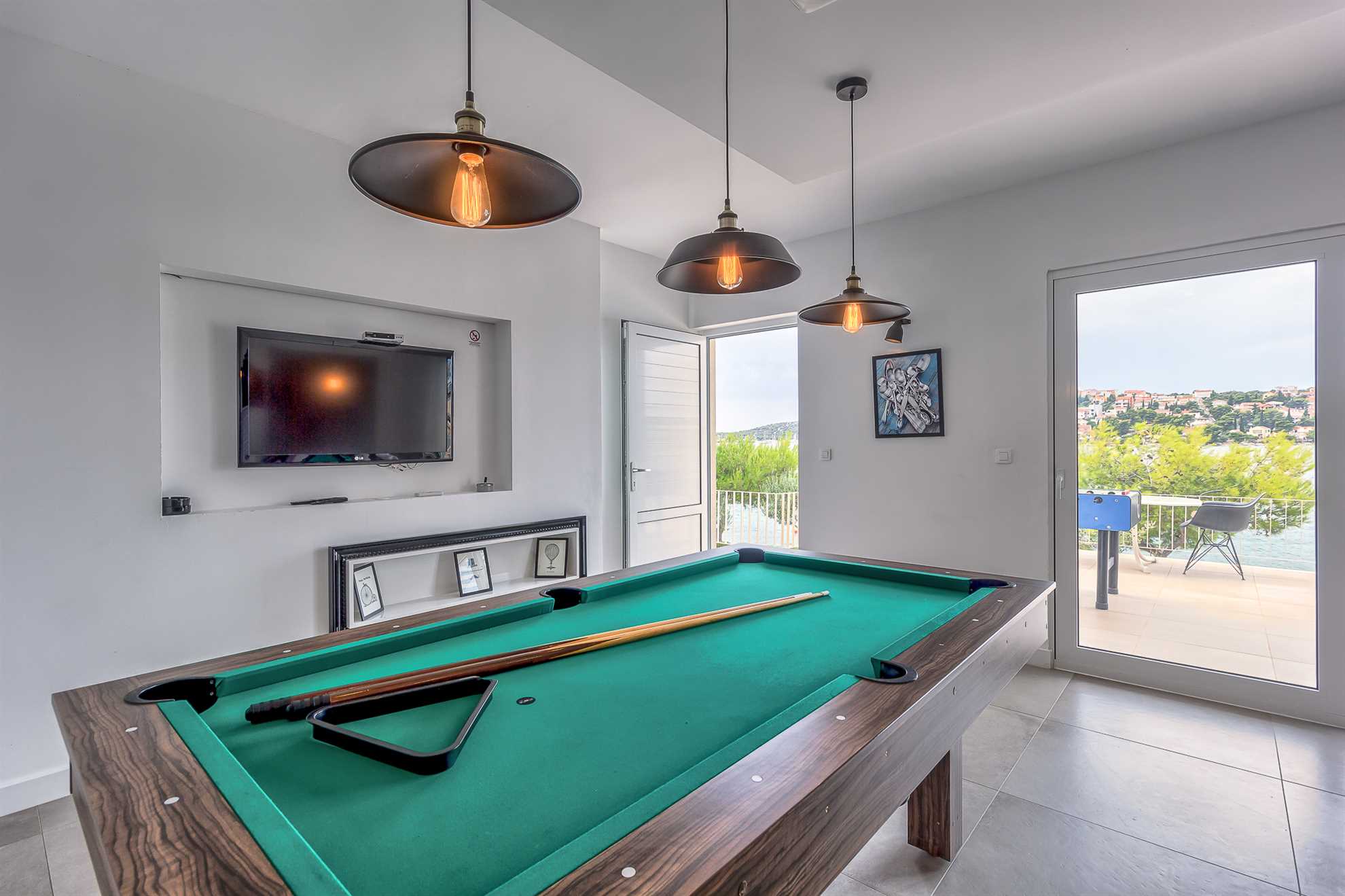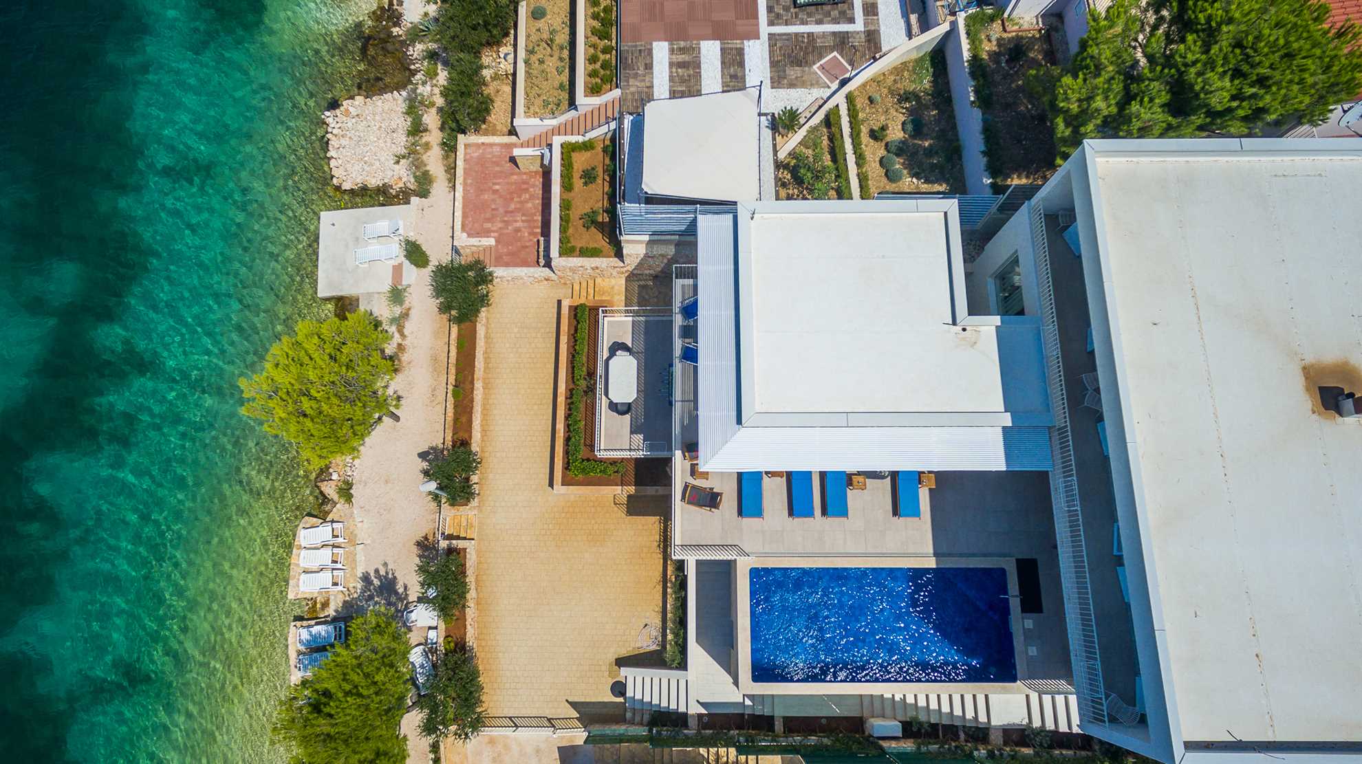 Villa La Perla is a modern and specious yet cozy and inviting holiday villa only steps away to the crystal blue Adriatic with spectacular views offered from each angle. It occupies 300m² spread over three levels and offers a roomy lounge with floor to ceiling windows, a fully equipped kitchen with a central island and a bright dining room, all with access to the balcony. Specious bedrooms decorated in color themes each have their own private bathroom, seating area, flatscreen TV, including access to the balcony or terrace with magnificent views of the sheltered bay. For your entertainment you will also find a pool table room adjacent to the balcony equipped with table football. Once outside the aromas of sea and pines will delight your senses. Enjoy this area setup for leisurely activities, whether that means taking a dip in the heated pool, lighting up a BBQ, sharing al fresco meal with your loved ones, relaxing in a shaded seating lounge or taking a swim in the sea...the choice is yours. Life seldom gets better than this.