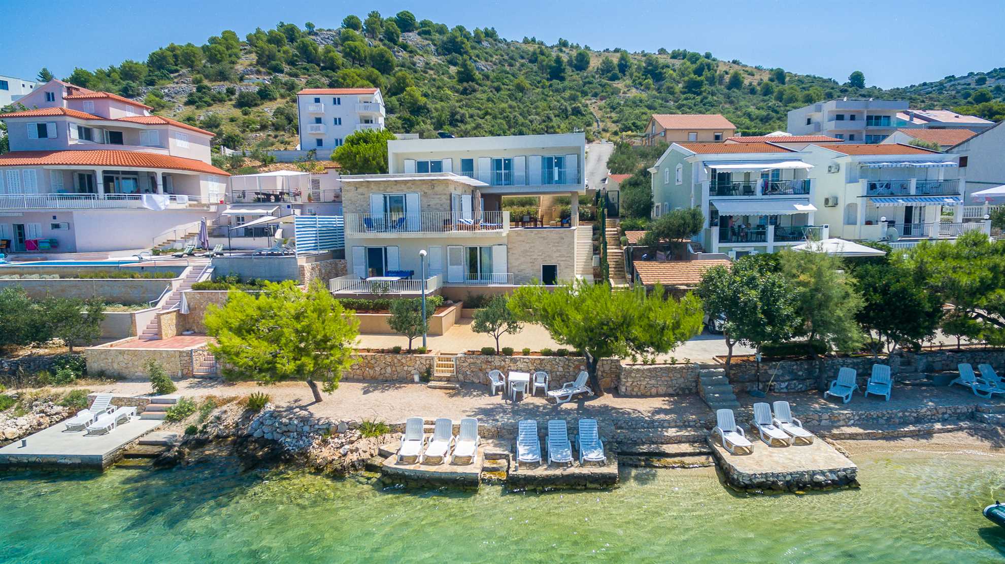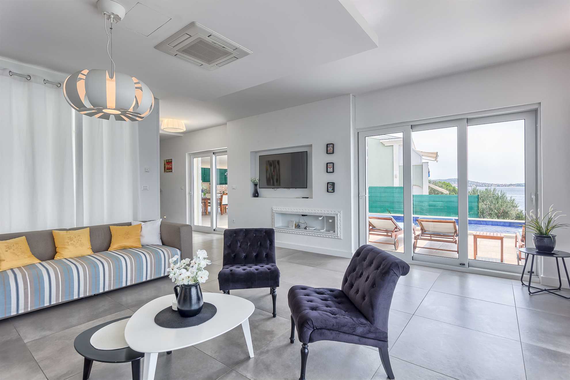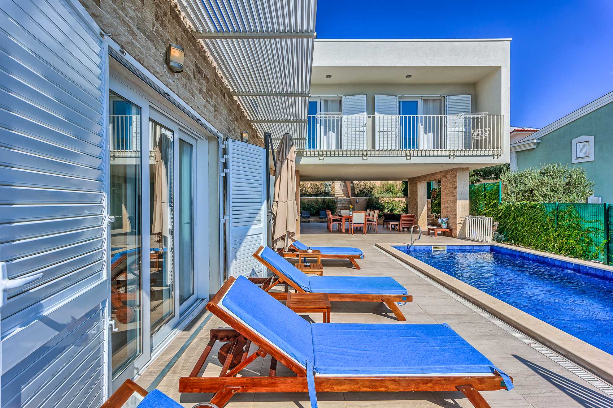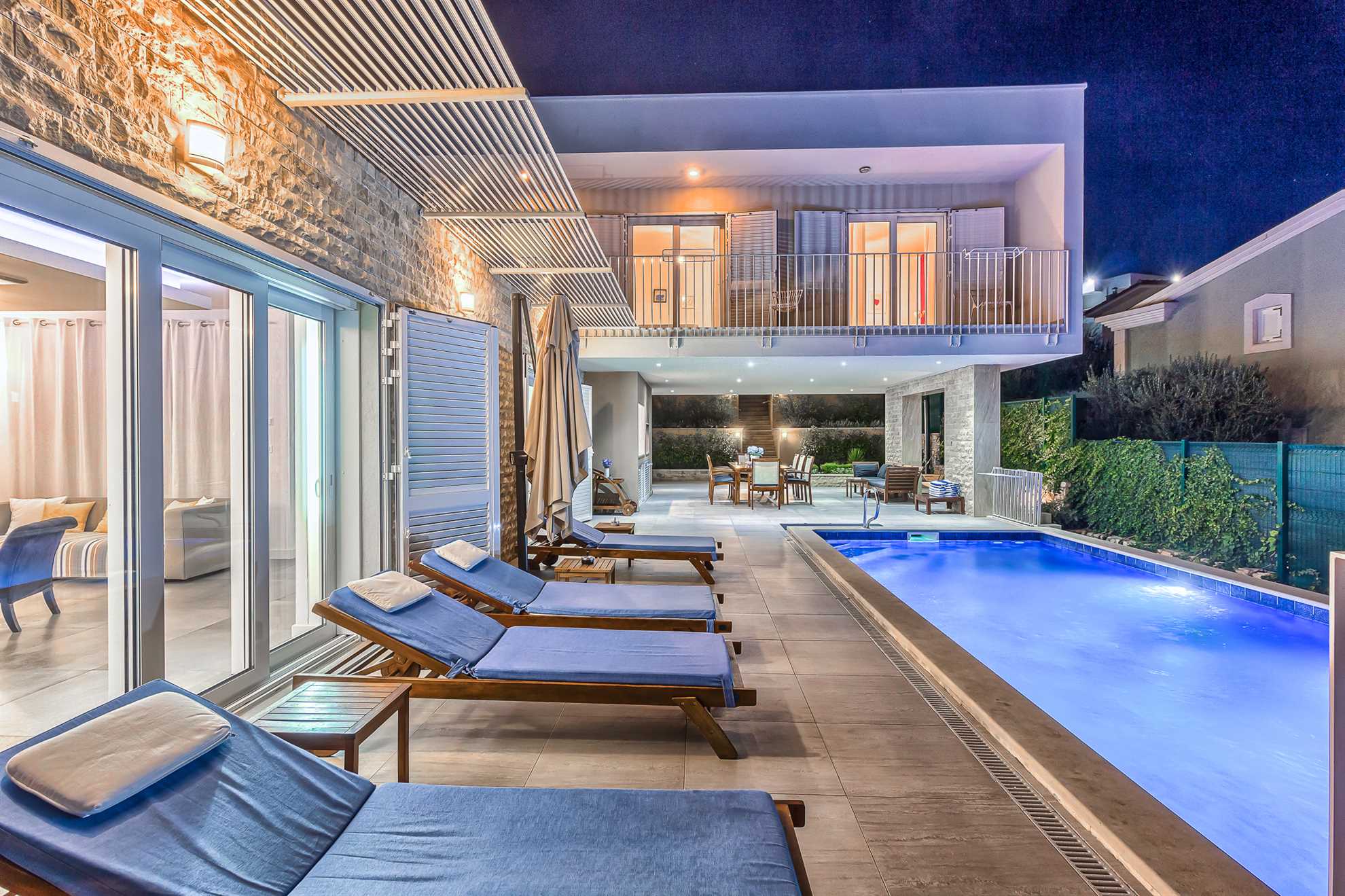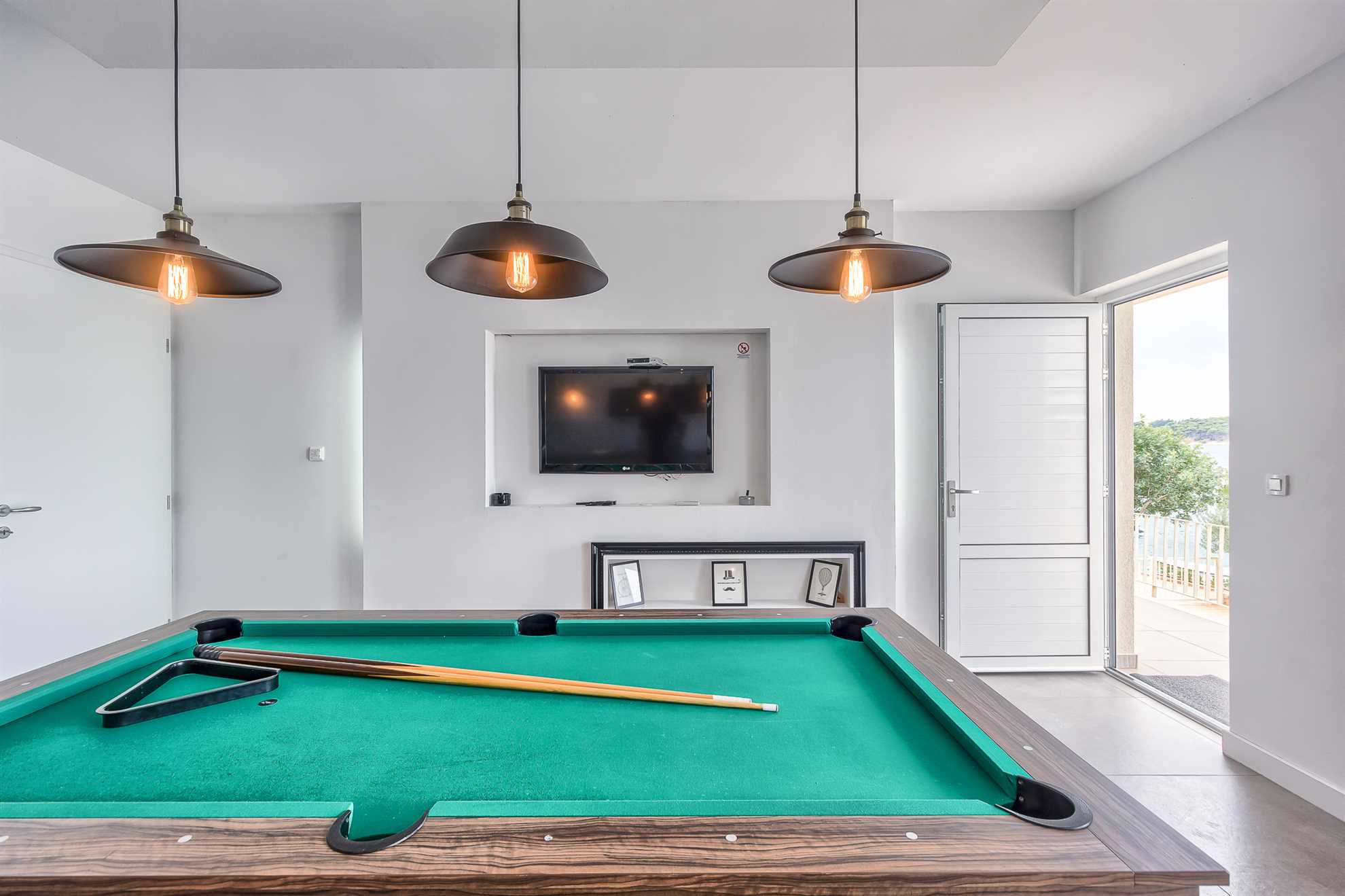 Villa La Perla is a modern and specious yet cozy and inviting holiday villa only steps away to the crystal blue Adriatic with spectacular views offered from each angle. It occupies 300m² spread over three levels and offers a roomy lounge with floor to ceiling windows, a fully equipped kitchen with a central island and a bright dining room, all with access to the balcony. Specious bedrooms decorated in color themes each have their own private bathroom, seating area, flatscreen TV, including access to the balcony or terrace with magnificent views of the sheltered bay. For your entertainment you will also find a pool table room adjacent to the balcony equipped with table football. Once outside the aromas of sea and pines will delight your senses. Enjoy this area setup for leisurely activities, whether that means taking a dip in the heated pool, lighting up a BBQ, sharing al fresco meal with your loved ones, relaxing in a shaded seating lounge or taking a swim in the sea...the choice is yours. Life seldom gets better than this.