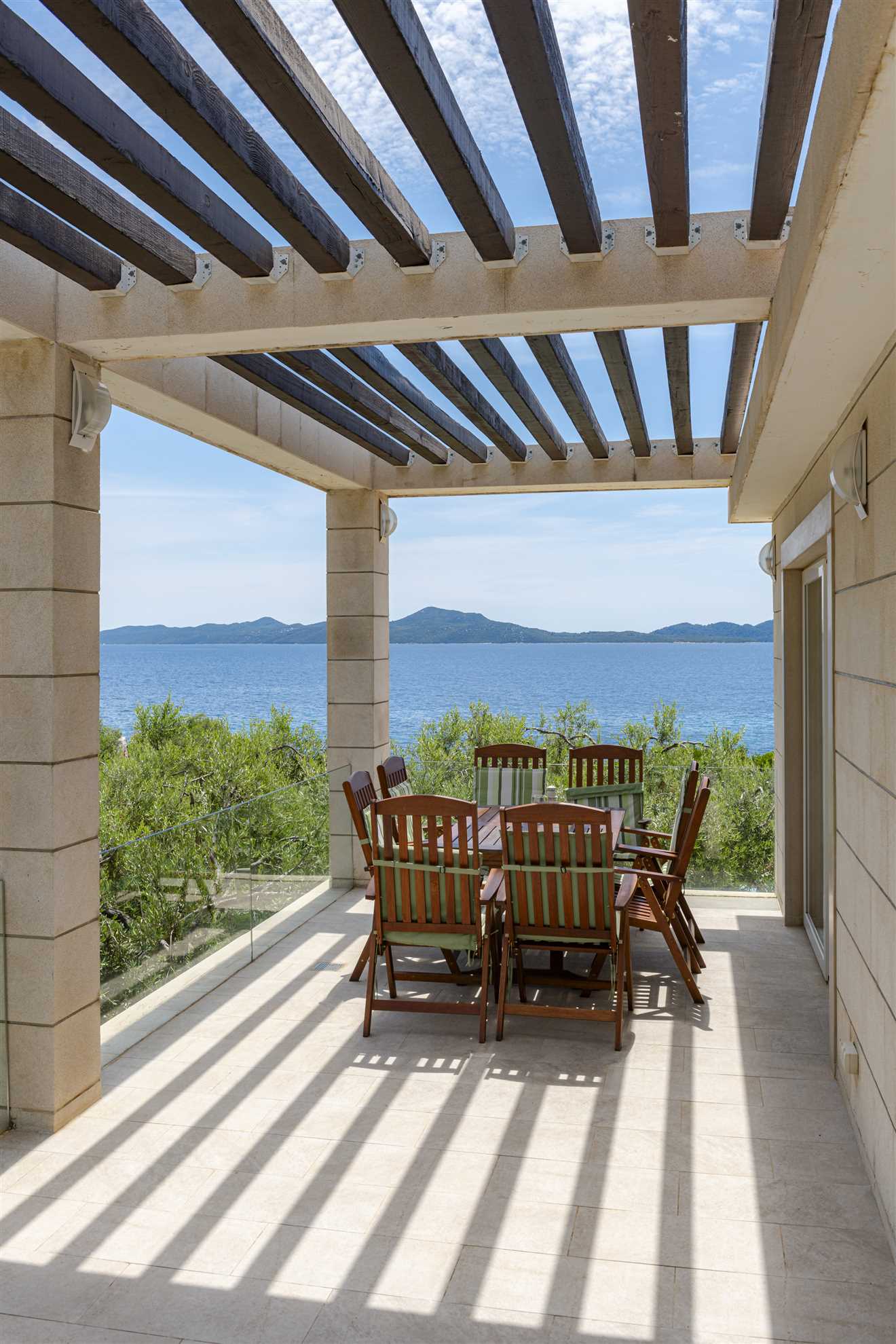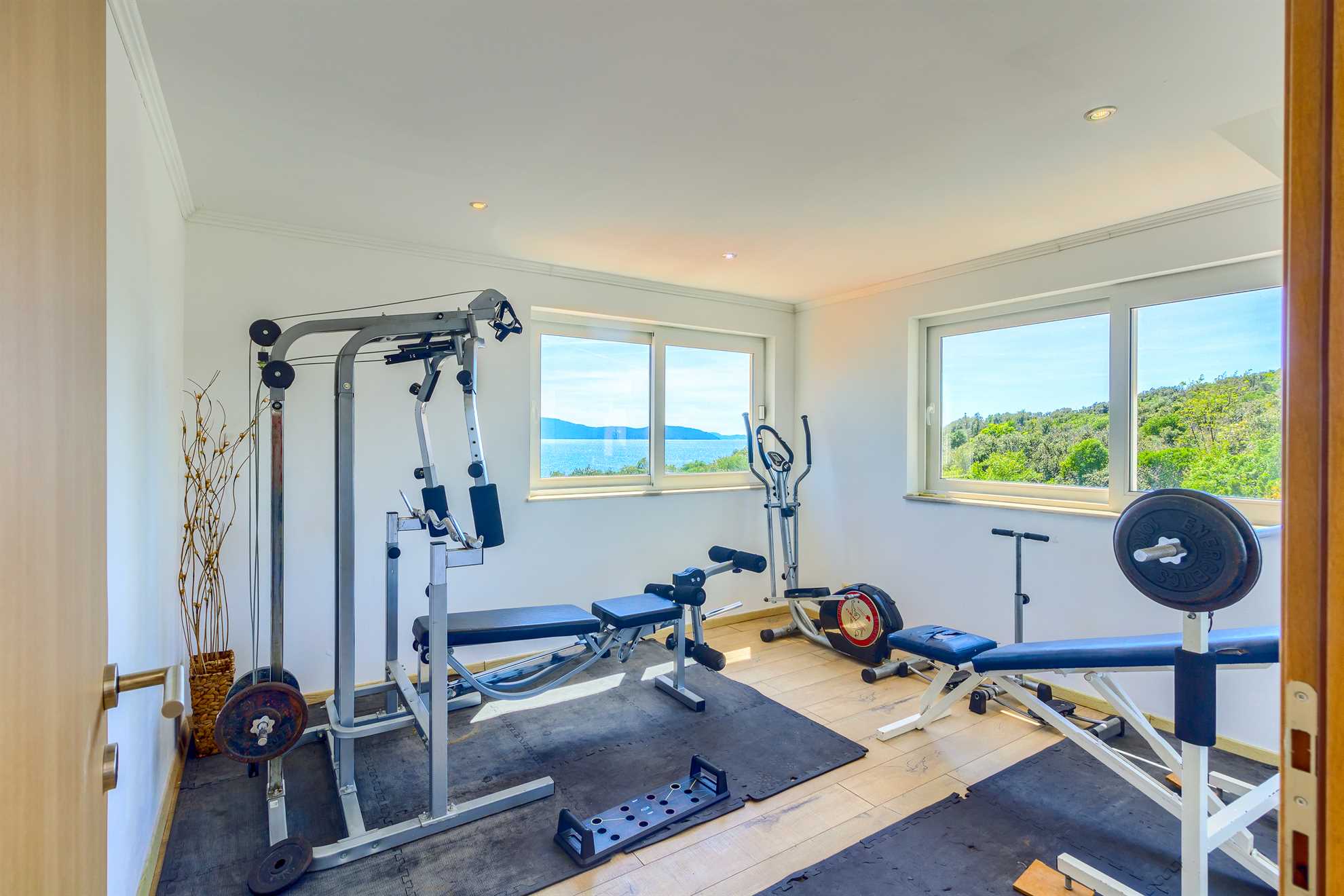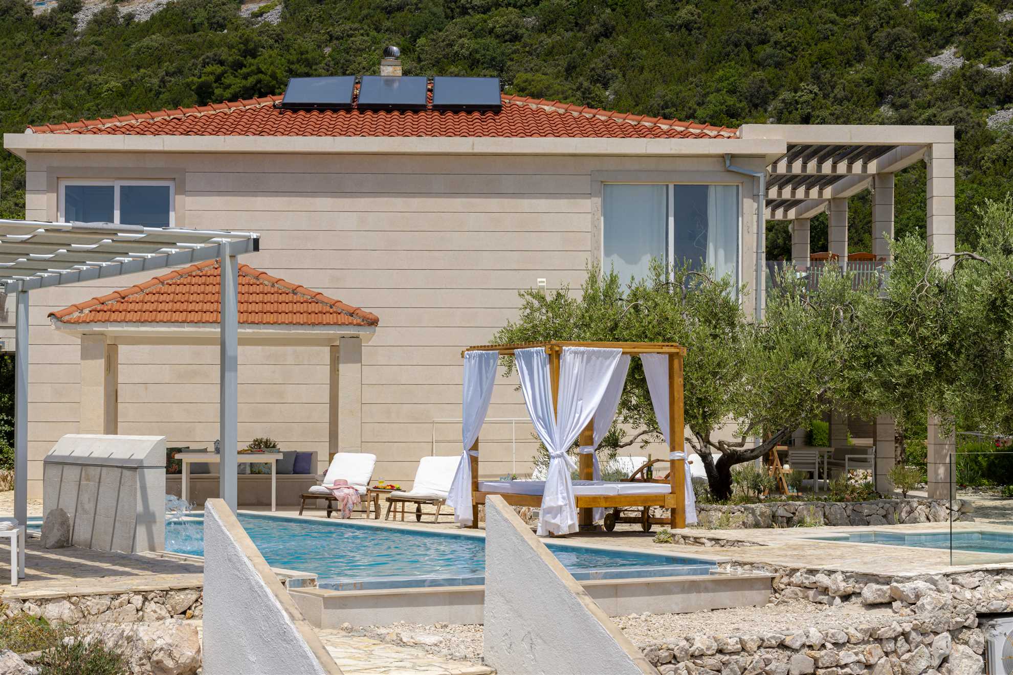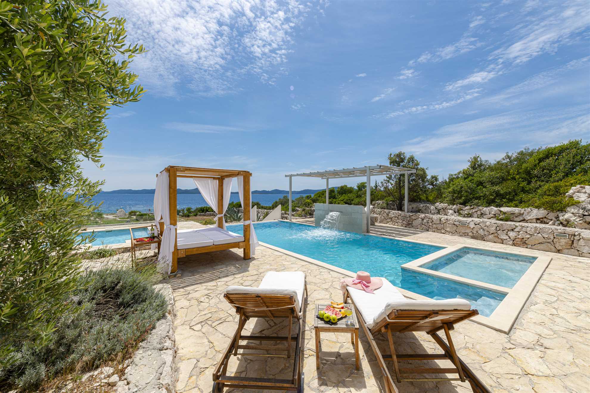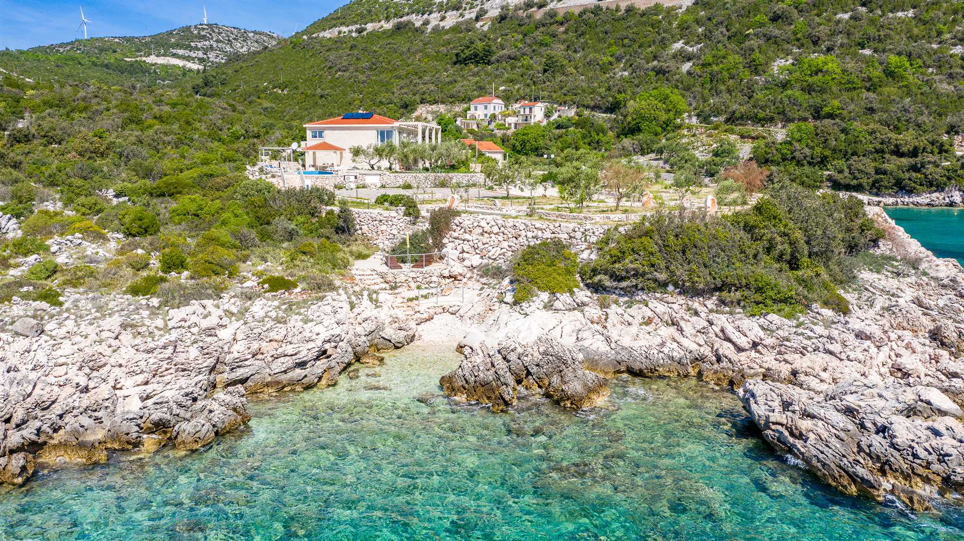 One of a kind charming property located right on the water in a secluded, quiet and tranquil bay. Villa Oasis provides comfort, luxury, relaxation, privacy and views of the gorgeous landscape in every direction. Without many neighbors around you are sure to have the beautiful blue Adriatic to yourself. Two levels occupy the villa. On the ground floor is a large, fully equipped, modern kitchen with a large dining table seating 12. Here are also two double bedrooms, a triple bedroom as well as two bathrooms. On the upper level are the remaining two double bedrooms, two bathrooms and a separate guest toilet, also a lounge with a sofa bed and a balcony. Facing the sea, each room allows for a breathtaking view. For your comfort and enjoyment provided are a gym, pool table, sauna, table tennis, children’s playground and a Jacuzzi. Impressive outdoor area provides covered lounge areas, alfresco dining, barbecue facilities, and stone deck to access the pool with a smaller section within for the little ones’ safety. If you fancy a swim early in the morning in the sea, you won’t go far as the access to the sea is at your doorstep.