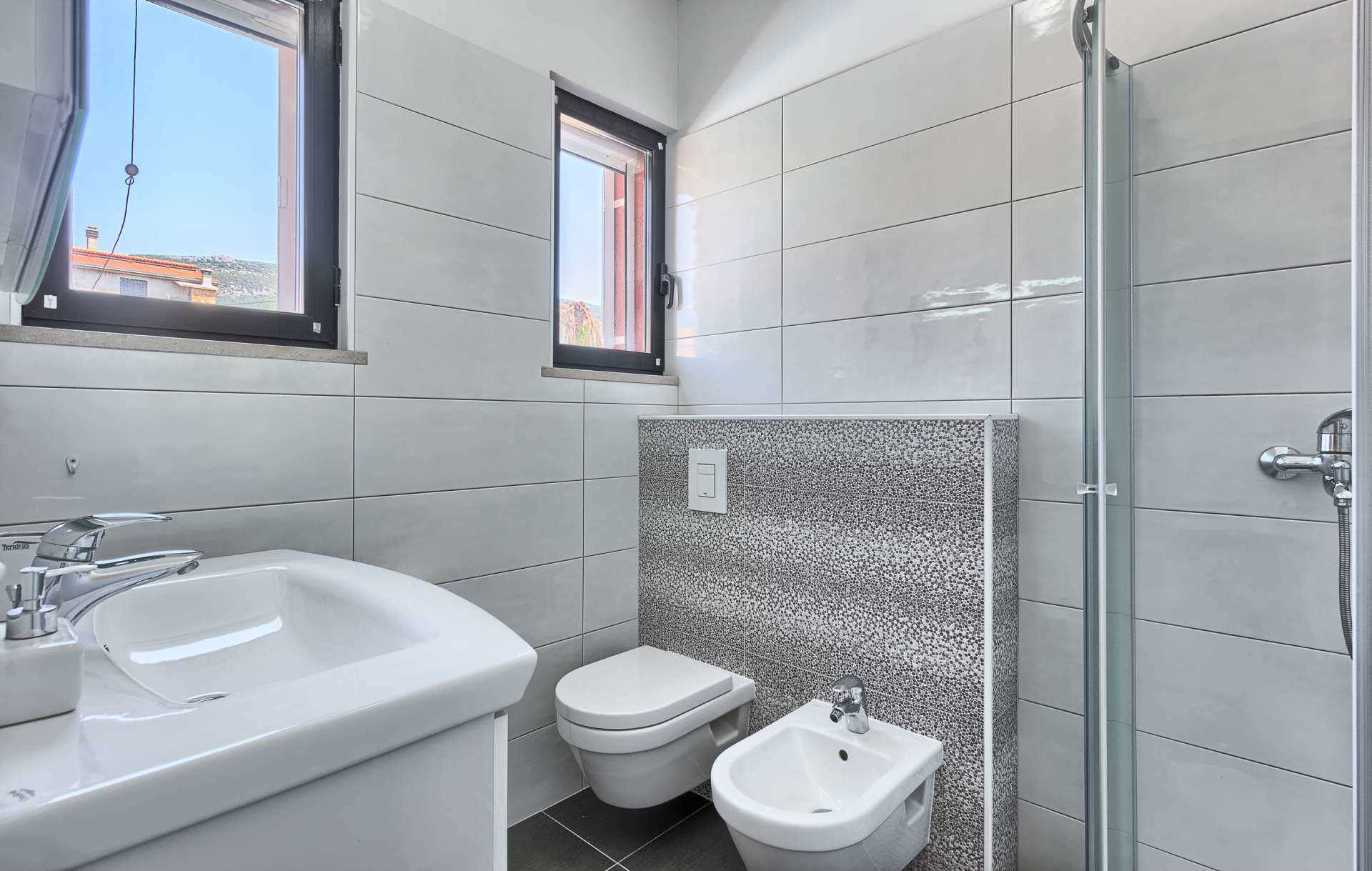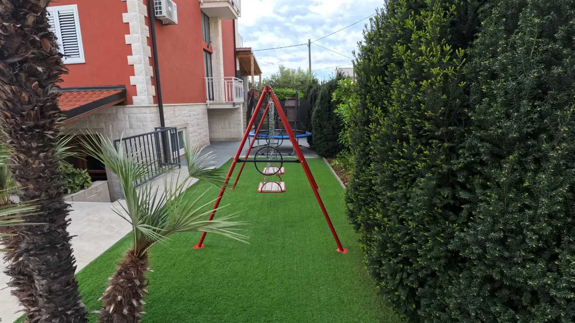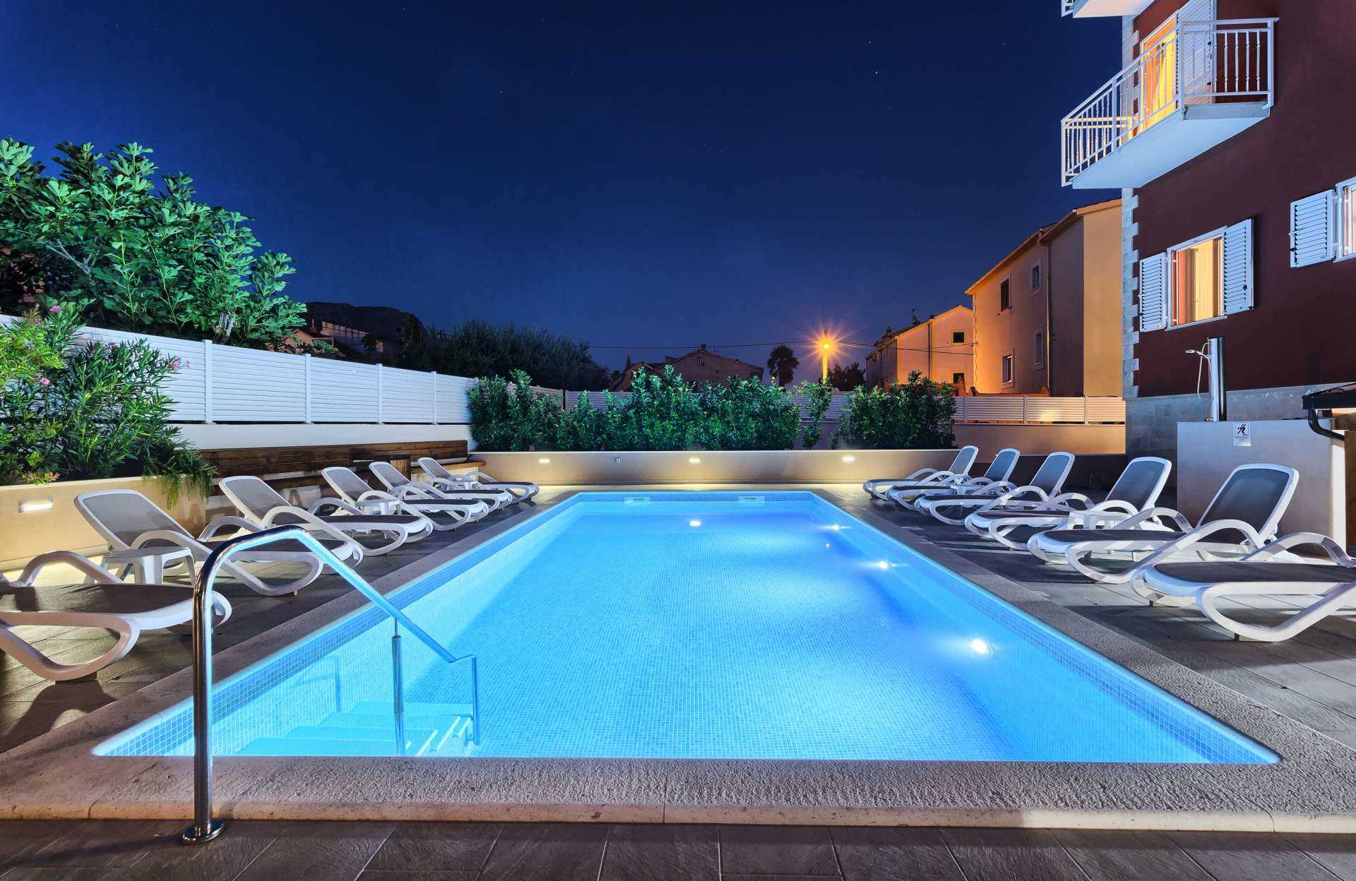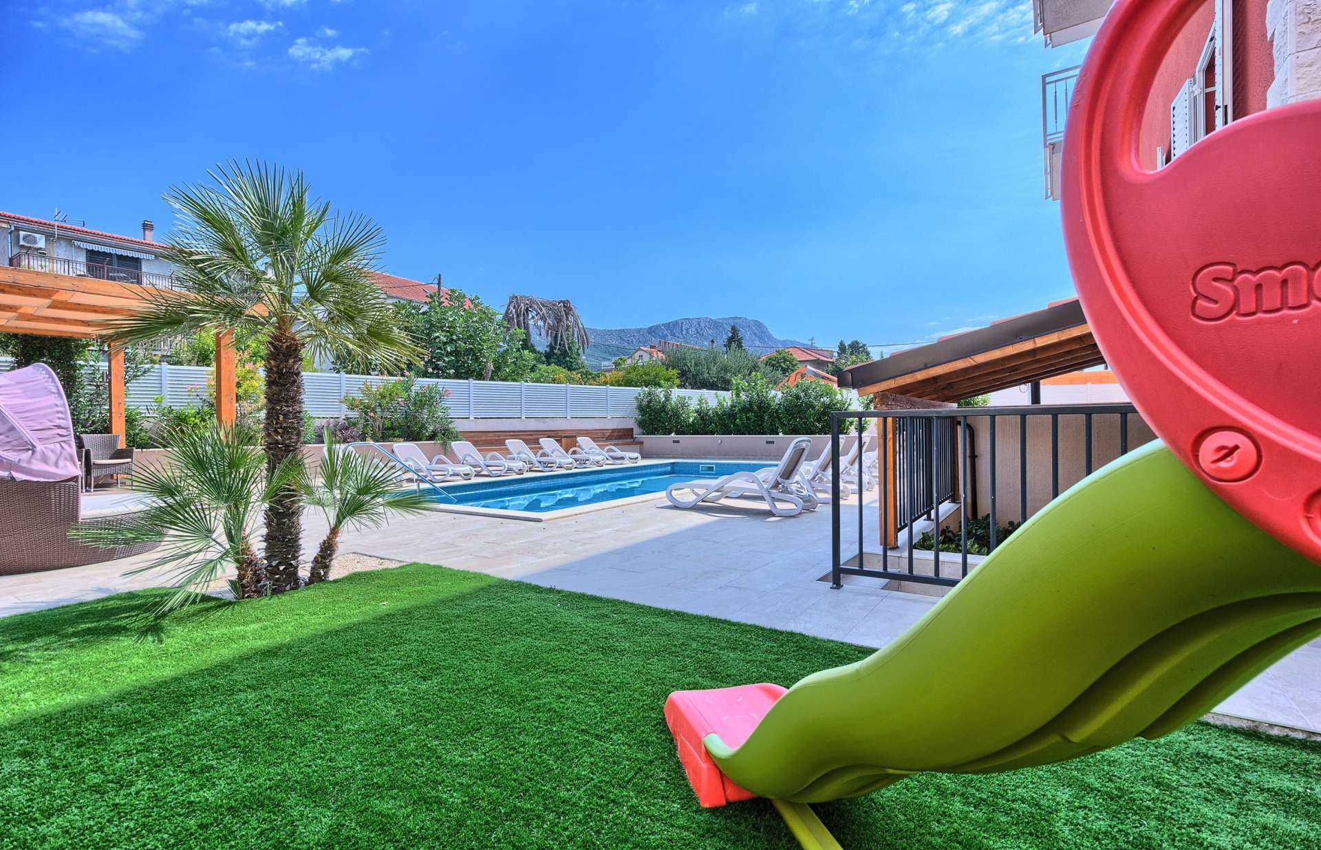 Whether you are seeking a relaxing holiday close to a beach, or if you are a large group, or if you wish to visit Croatia’s most notable historical and cultural sites, or if you are on a long weekend getaway then Villa Tea-Beach may be just what you are looking for - conveniently located between Split and Trogir, 10 minutes from Split Airport and 200 meters from the beach. With four levels sharing a specious 400 m² interior with seven bedrooms, plus two kitchens and two living rooms everyone in the group is sure to have their corner of privacy. Semi underground level offers entertainment such as a sauna, wine cellar, pool table, table tennis and a gym. First level consists of 2 double bedrooms, the second level of 1 bedroom with 2 single beds and finally the 3rd level is where you will find 3 double bedrooms and another bedroom with 2 single beds. Seasonal heated pool, sun loungers, BBQ facilities and a shaded lounge area are also available for your enjoyment.