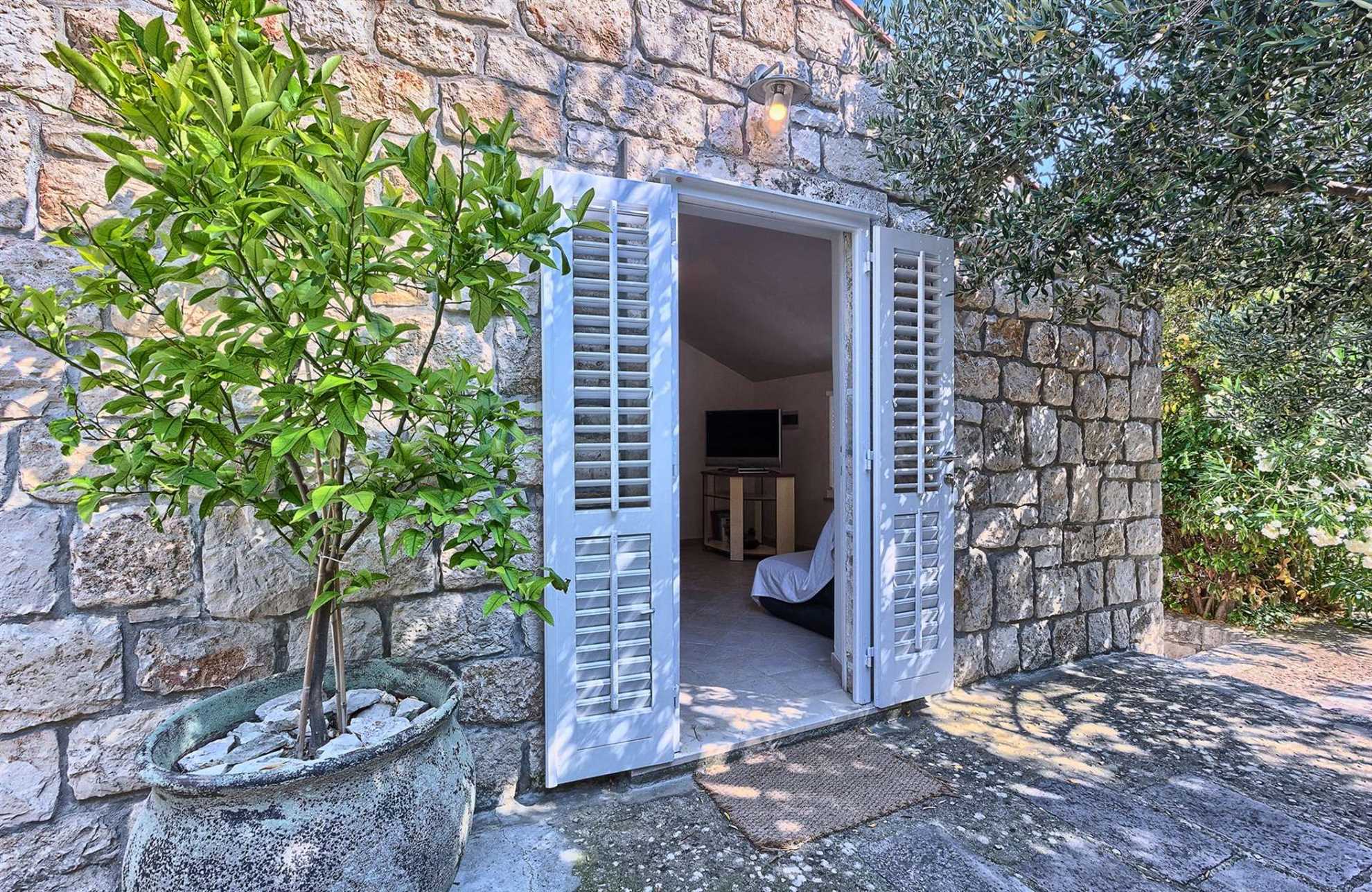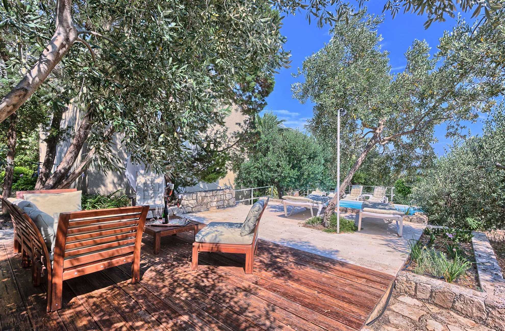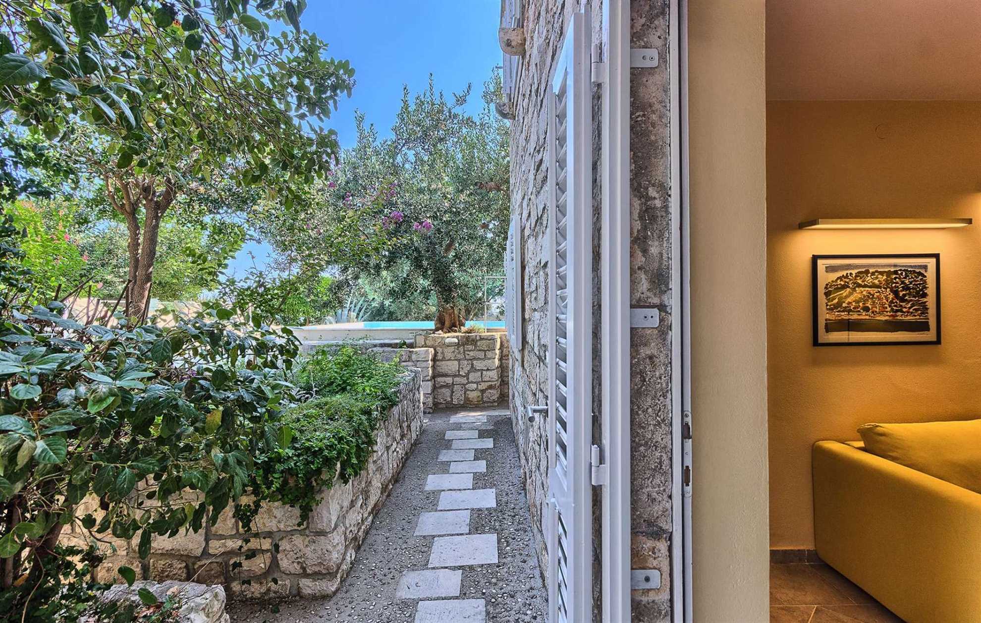 Charming garden oasis consisting of three separate living units, each with its own two bedrooms, two bathrooms and a lounge with a flatscreen TV, ideal for multiple families looking to vacation together without compromising privacy. The authentic villa boasts regional charm with exposed stone walls, wood beams and a large stone fireplace. Fully equipped kitchen with a dining room is in a separate unit accessible to all. The outdoor garden impresses with lush rose bushes, olive and palm trees and aloe plants and yields breathtaking views of the sea and the neighboring islands. Heated pool is also provided for your enjoyment, as well as built in BBQ facilities, alfresco dining tables and plenty of shaded seating areas. Casa Garden invites you to relax, enjoy quality time together, time apart, and indulge your holiday. The beach is a whole 4-minute walk away. Welcome to Dalmatia.