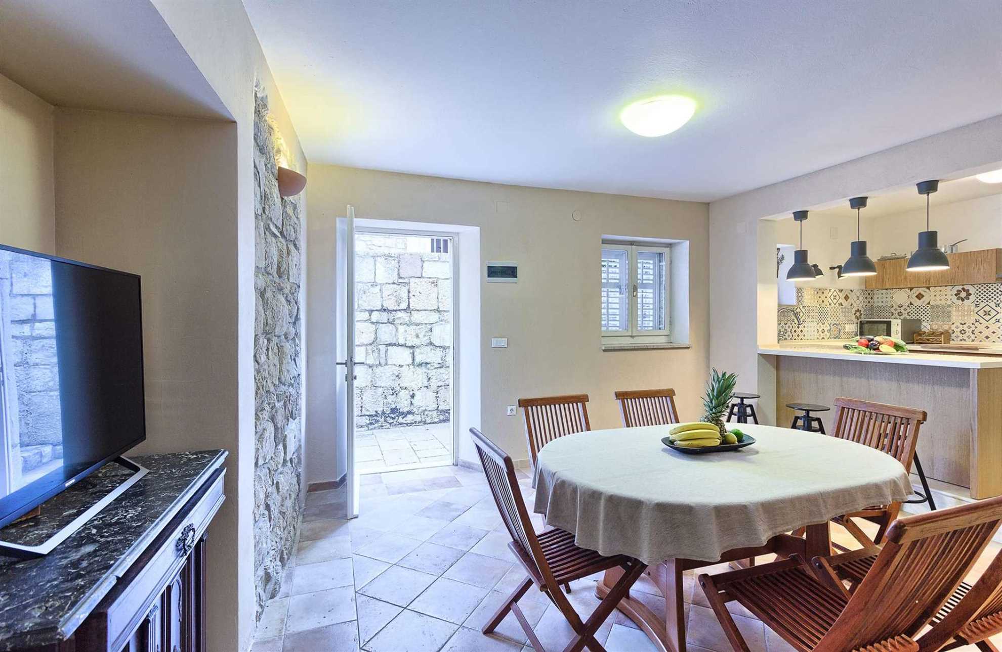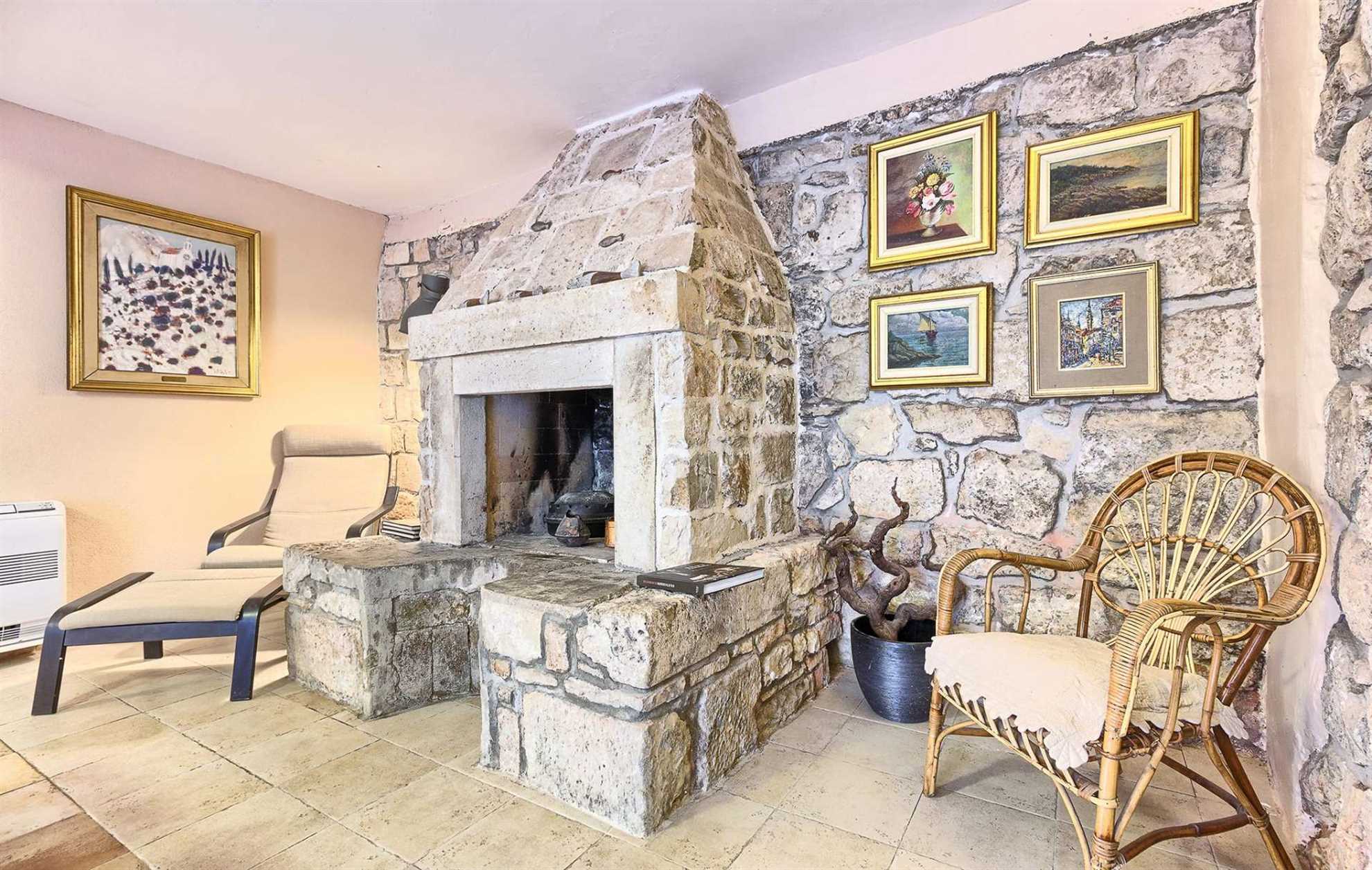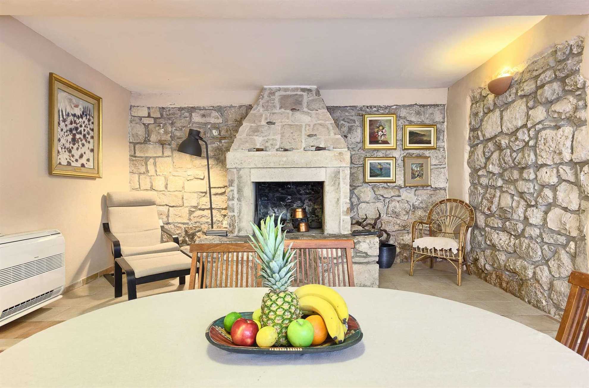 Stone house #2: one 2-bedroom apartment and main kitchen with a dining area and a fireplace