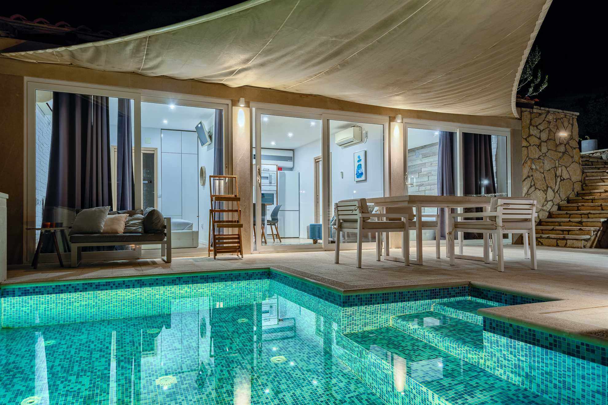 One of a kind charming property located right on the water in a secluded, quiet and tranquil bay. Amara cottage provides comfort, relaxation, privacy and views of the gorgeous landscape in every direction. Without many neighbors around you are sure to have the beautiful blue Adriatic to yourself. At your disposal are two charming double bedrooms and 2 bathrooms, fully equipped kitchen and a small sofa lounge. Facing the sea priceless views can be enjoyed from all the rooms and make waking up here a truly wonderful start to a day. Outdoor stone deck leads to a pool, and is equipped with an alfresco dining area with BBQ facilities, as well as a direct access to the sea. Welcome to the Adriatic.