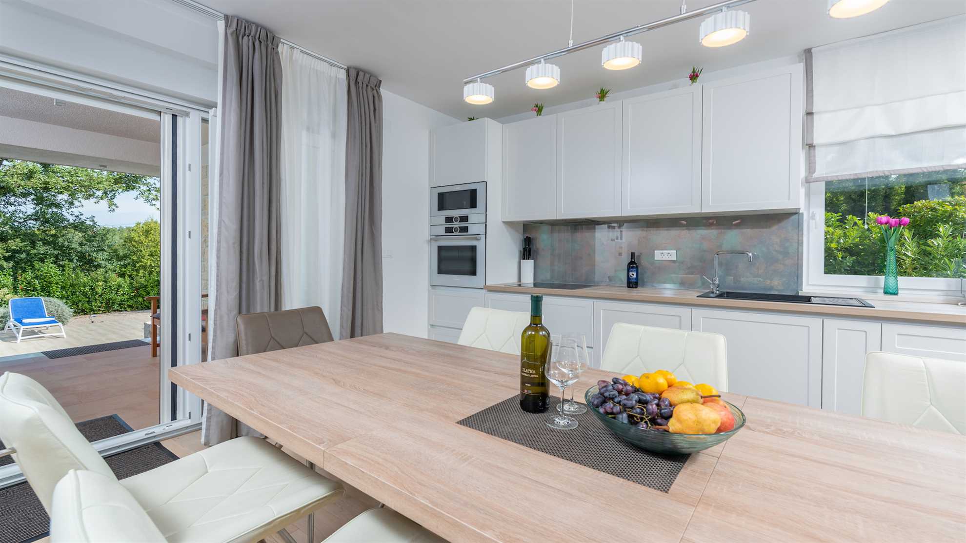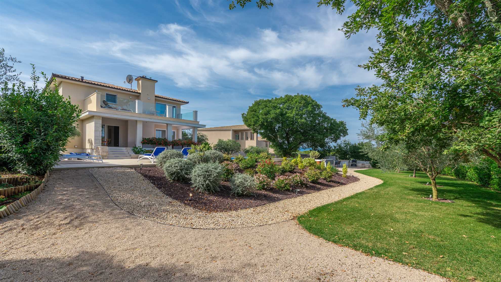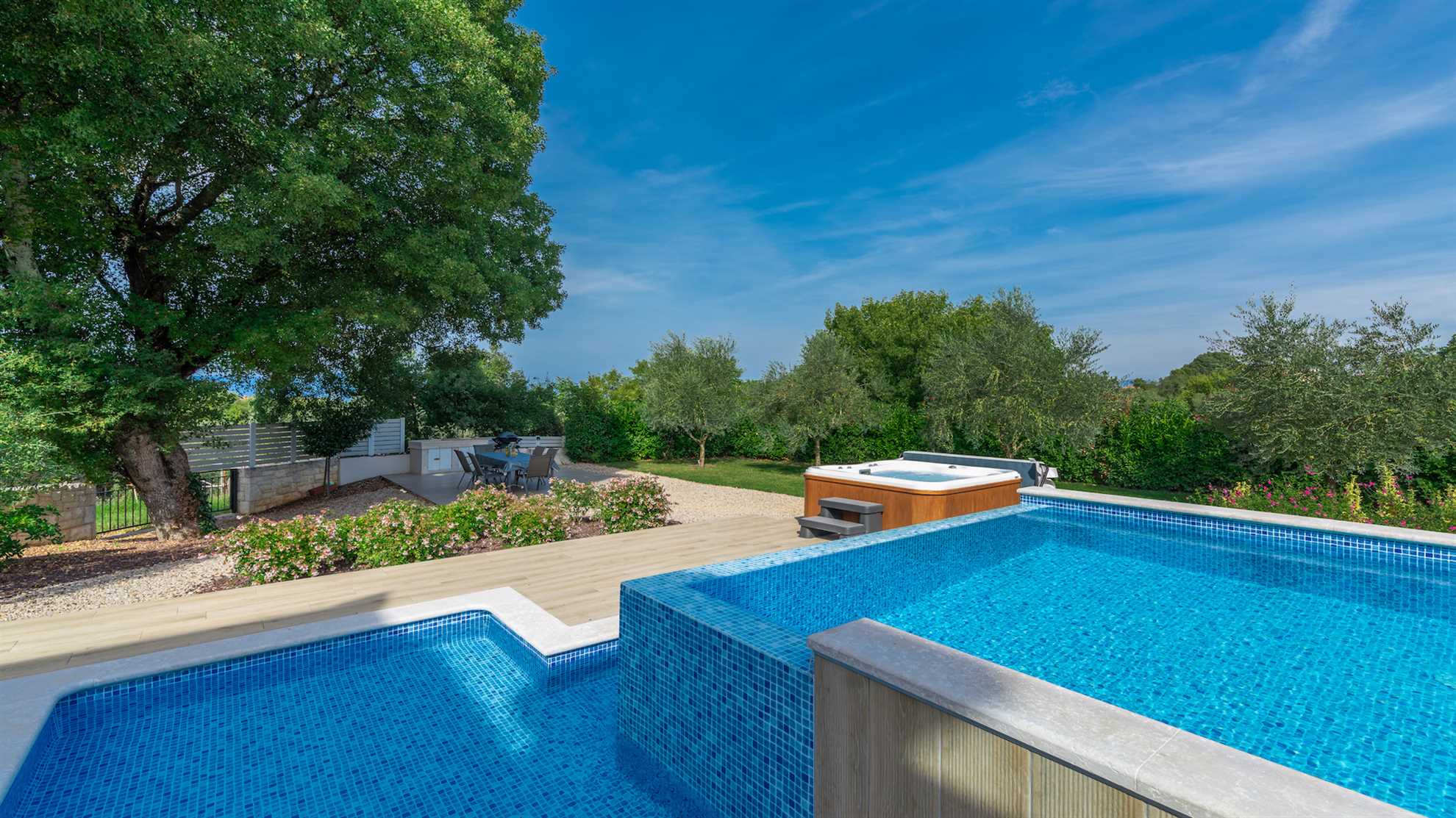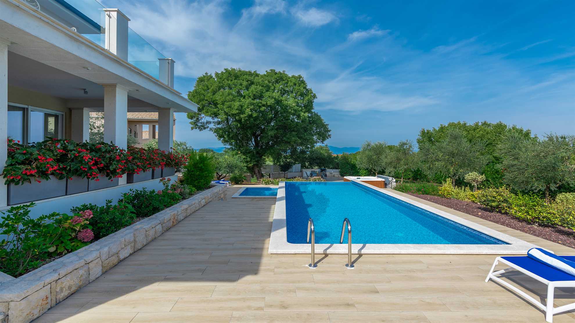 Villa Almedina is a gorgeous destination for a family holiday offering entertainment, leisurely activities for all ages plus luxury amenities. Spread over three floors 250 m² occupy the contemporary interior boasting elegance and comfort, with accent walls and wood floors creating a relaxing atmosphere. Underground level consists of a sauna and entertainment room with pool table and table football. With access to the pool deck the ground floor keeps a living room equipped with a corner sofa and a flatscreen TV, alongside a fully equipped kitchen and the dining table. One of the bedrooms is also on this level while the remaining bedrooms are on the upper floor with access to a second terrace. Large outdoor sunny deck houses a 40 m² pool, sun loungers, a shallow corner of the pool for safety of the little ones in the family, a Jacuzzi, tidy green lawn perfect for playtime and covered alfresco dining table with barbecue facilities. Beautiful green landscape surrounds the villa and magnificent sunsets can be enjoyed from here.