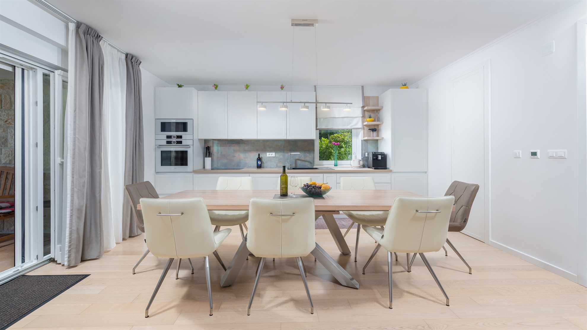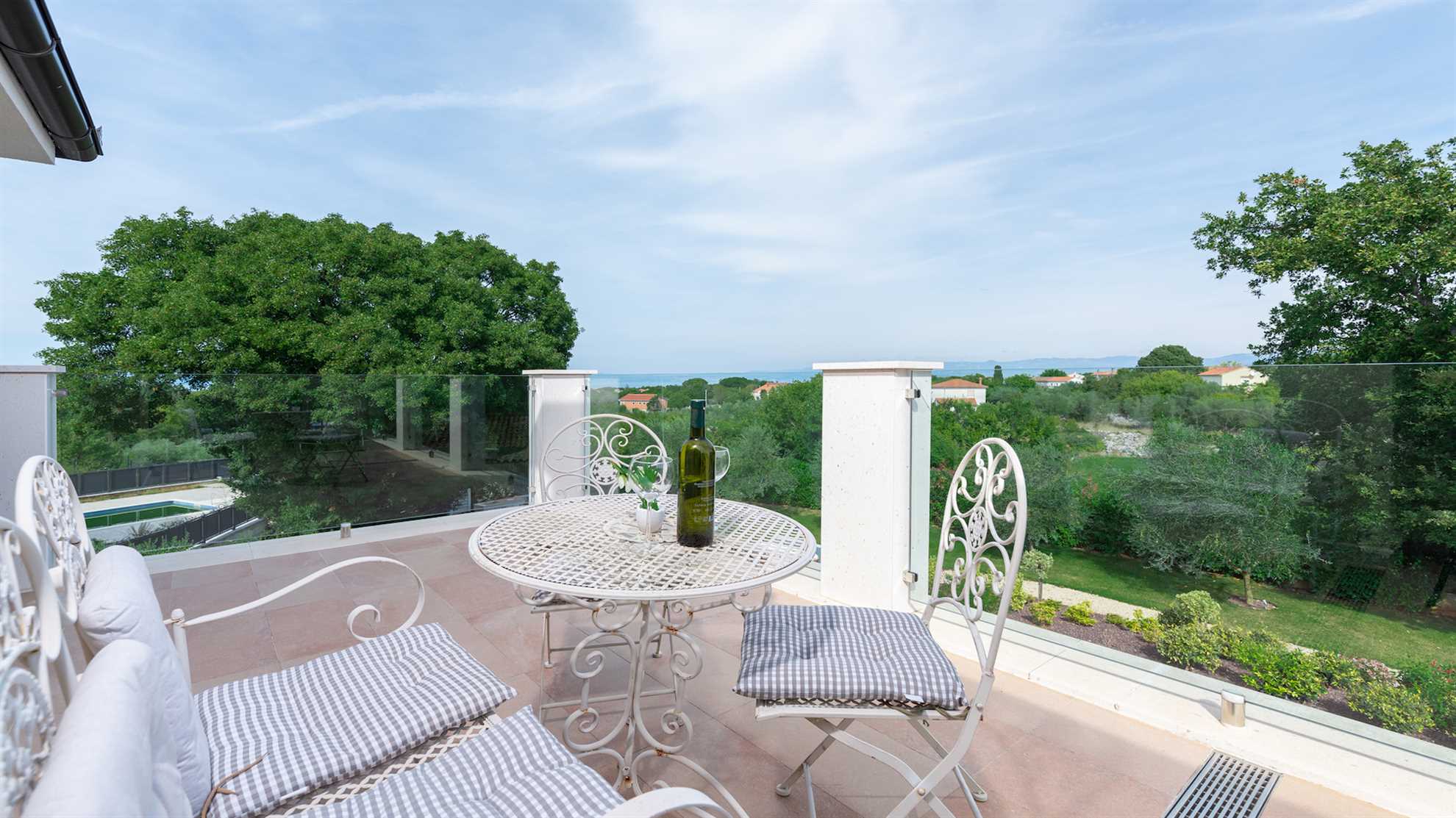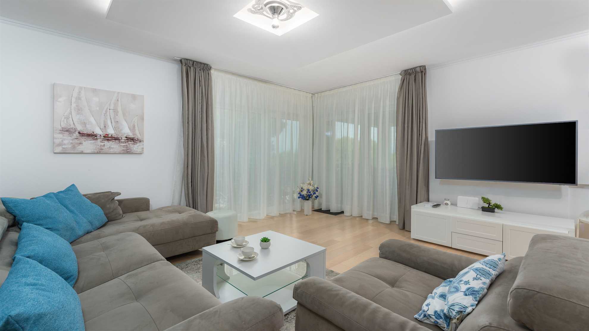 Villa Almedina is a gorgeous destination for a family holiday offering entertainment, leisurely activities for all ages plus luxury amenities. Spread over three floors 250 m² occupy the contemporary interior boasting elegance and comfort, with accent walls and wood floors creating a relaxing atmosphere. Underground level consists of a sauna and entertainment room with pool table and table football. With access to the pool deck the ground floor keeps a living room equipped with a corner sofa and a flatscreen TV, alongside a fully equipped kitchen and the dining table. One of the bedrooms is also on this level while the remaining bedrooms are on the upper floor with access to a second terrace. Large outdoor sunny deck houses a 40 m² pool, sun loungers, a shallow corner of the pool for safety of the little ones in the family, a Jacuzzi, tidy green lawn perfect for playtime and covered alfresco dining table with barbecue facilities. Beautiful green landscape surrounds the villa and magnificent sunsets can be enjoyed from here.