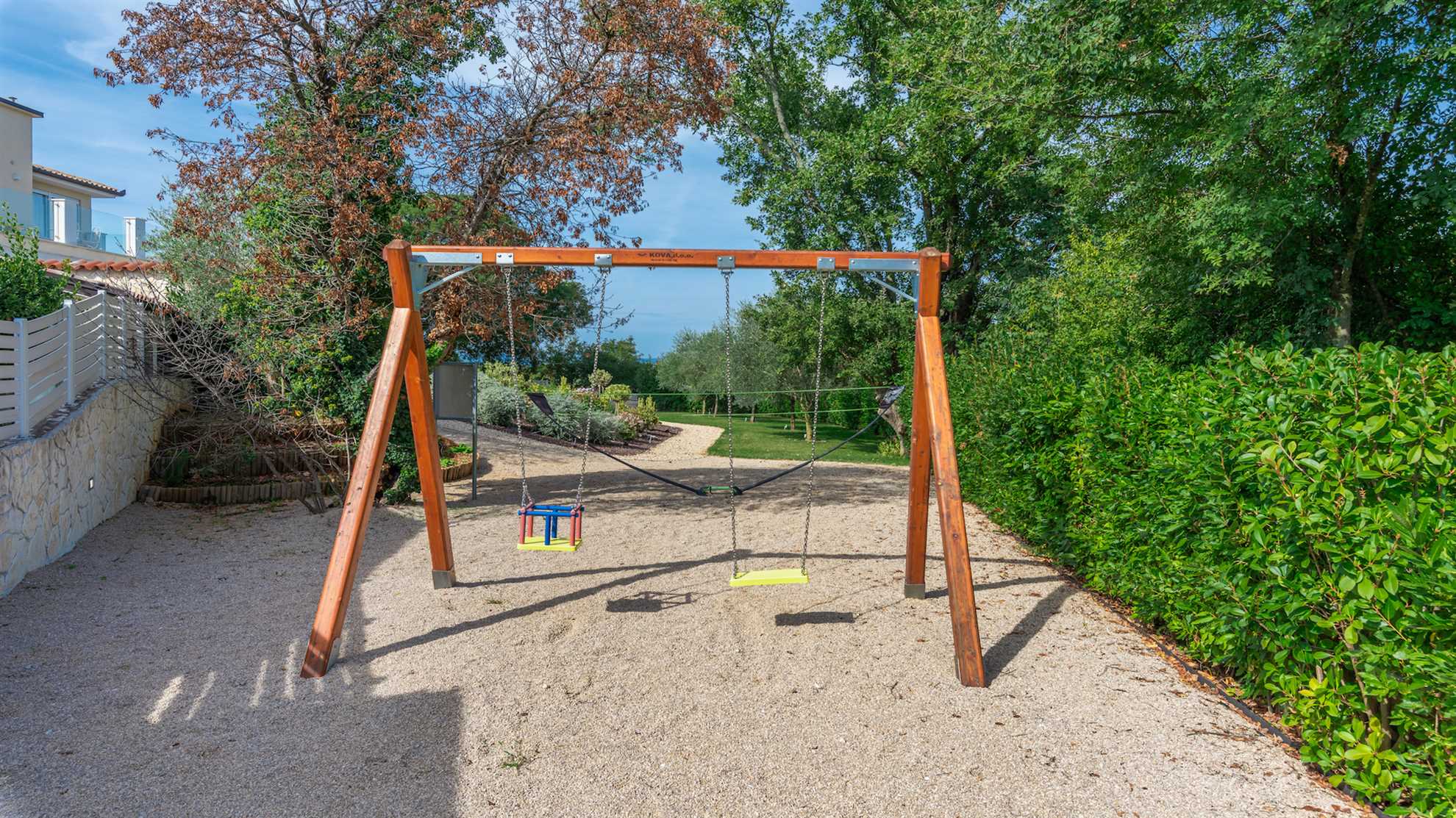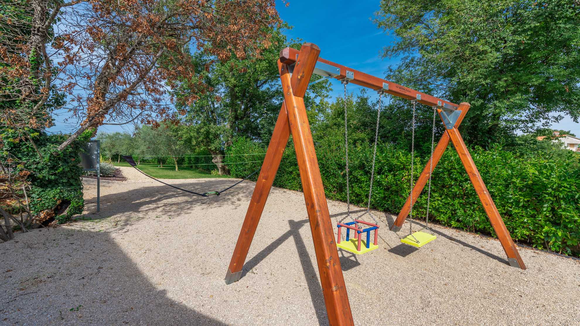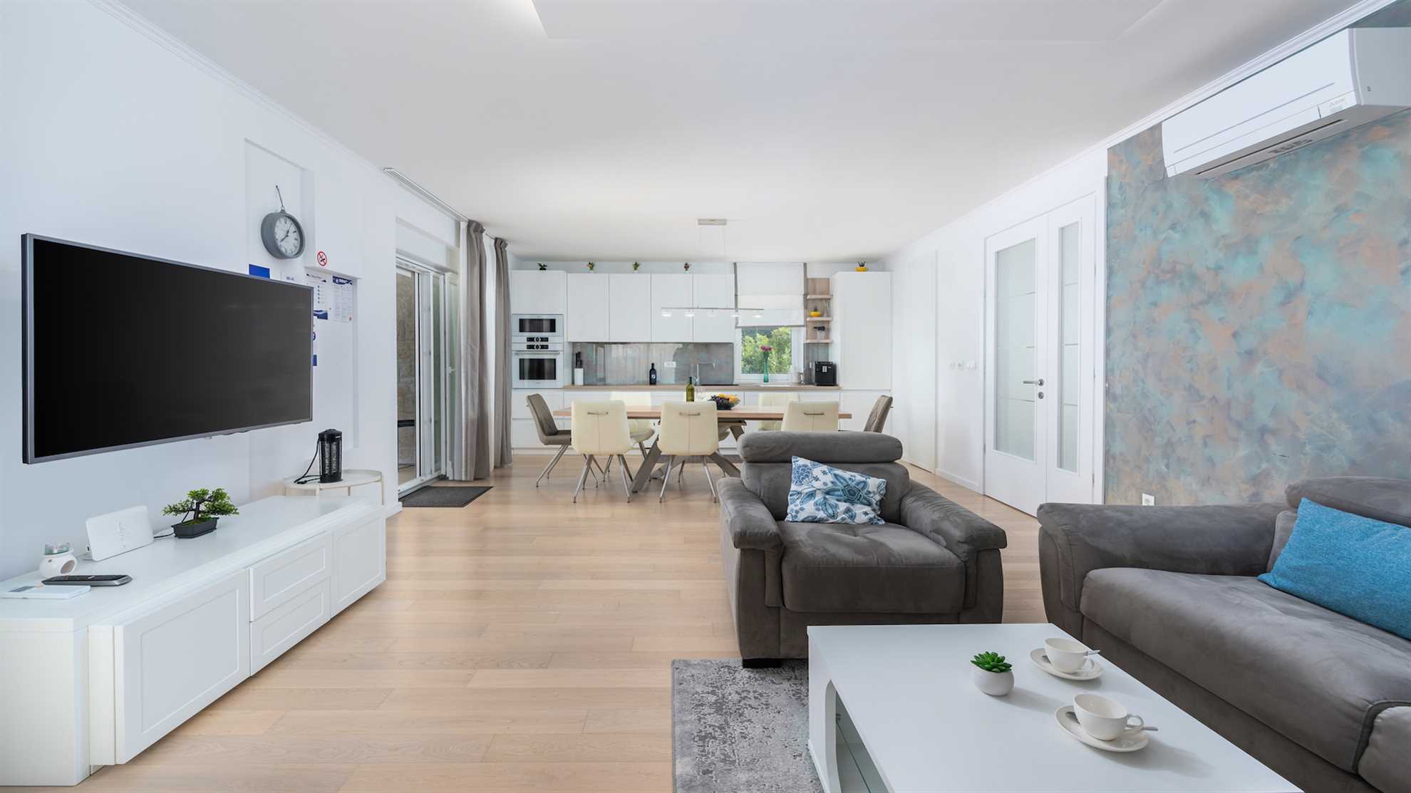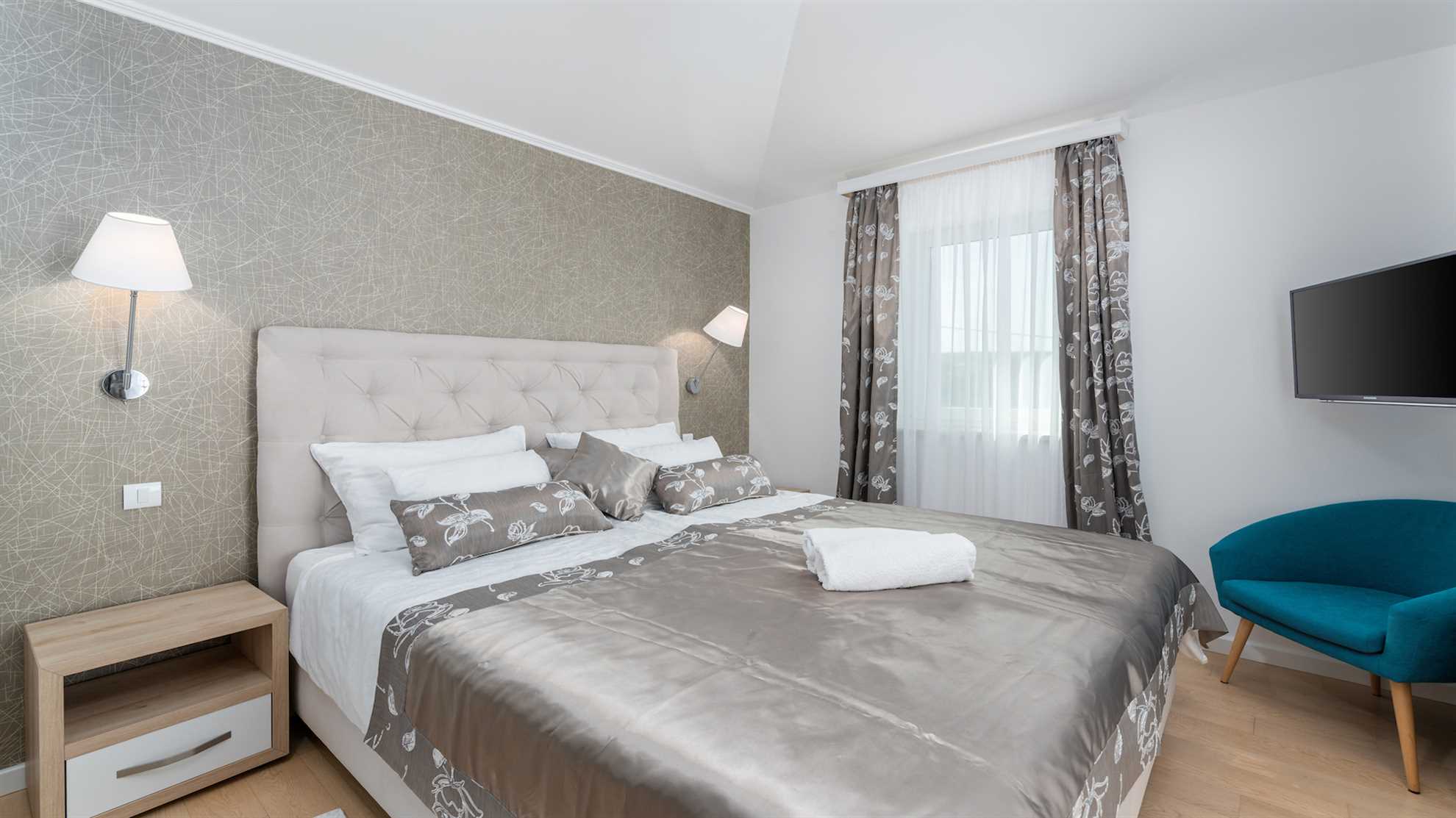 Villa Almedina is a gorgeous destination for a family holiday offering entertainment, leisurely activities for all ages plus luxury amenities. Spread over three floors 250 m² occupy the contemporary interior boasting elegance and comfort, with accent walls and wood floors creating a relaxing atmosphere. Underground level consists of a sauna and entertainment room with pool table and table football. With access to the pool deck the ground floor keeps a living room equipped with a corner sofa and a flatscreen TV, alongside a fully equipped kitchen and the dining table. One of the bedrooms is also on this level while the remaining bedrooms are on the upper floor with access to a second terrace. Large outdoor sunny deck houses a 40 m² pool, sun loungers, a shallow corner of the pool for safety of the little ones in the family, a Jacuzzi, tidy green lawn perfect for playtime and covered alfresco dining table with barbecue facilities. Beautiful green landscape surrounds the villa and magnificent sunsets can be enjoyed from here.