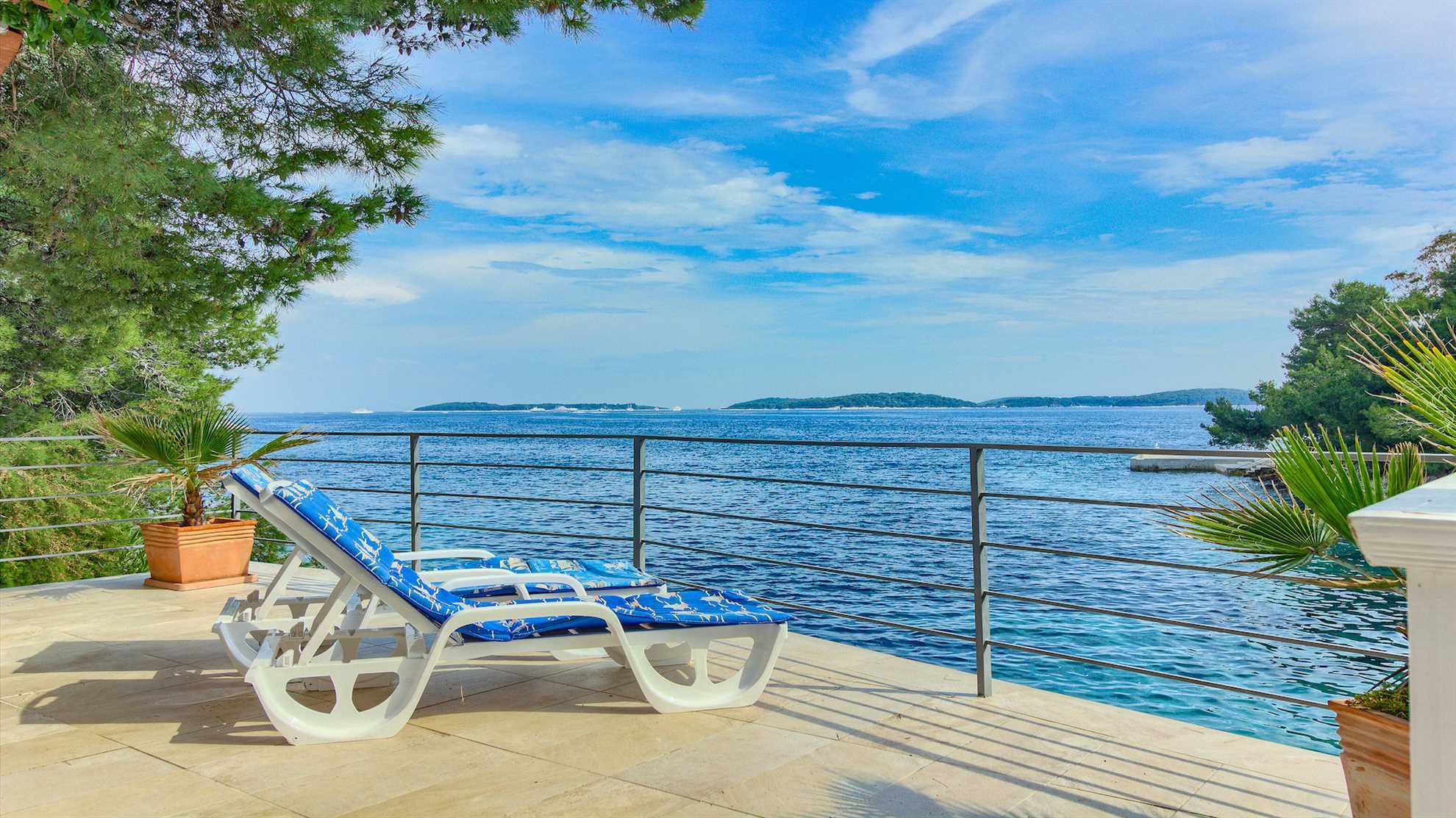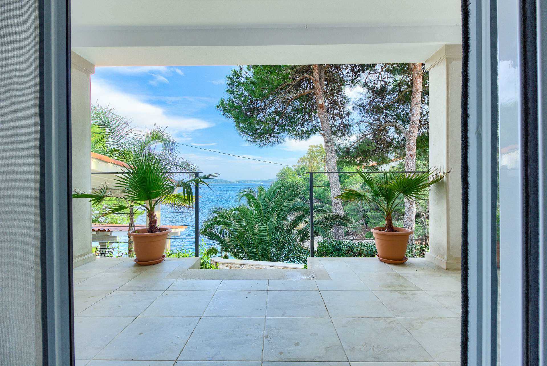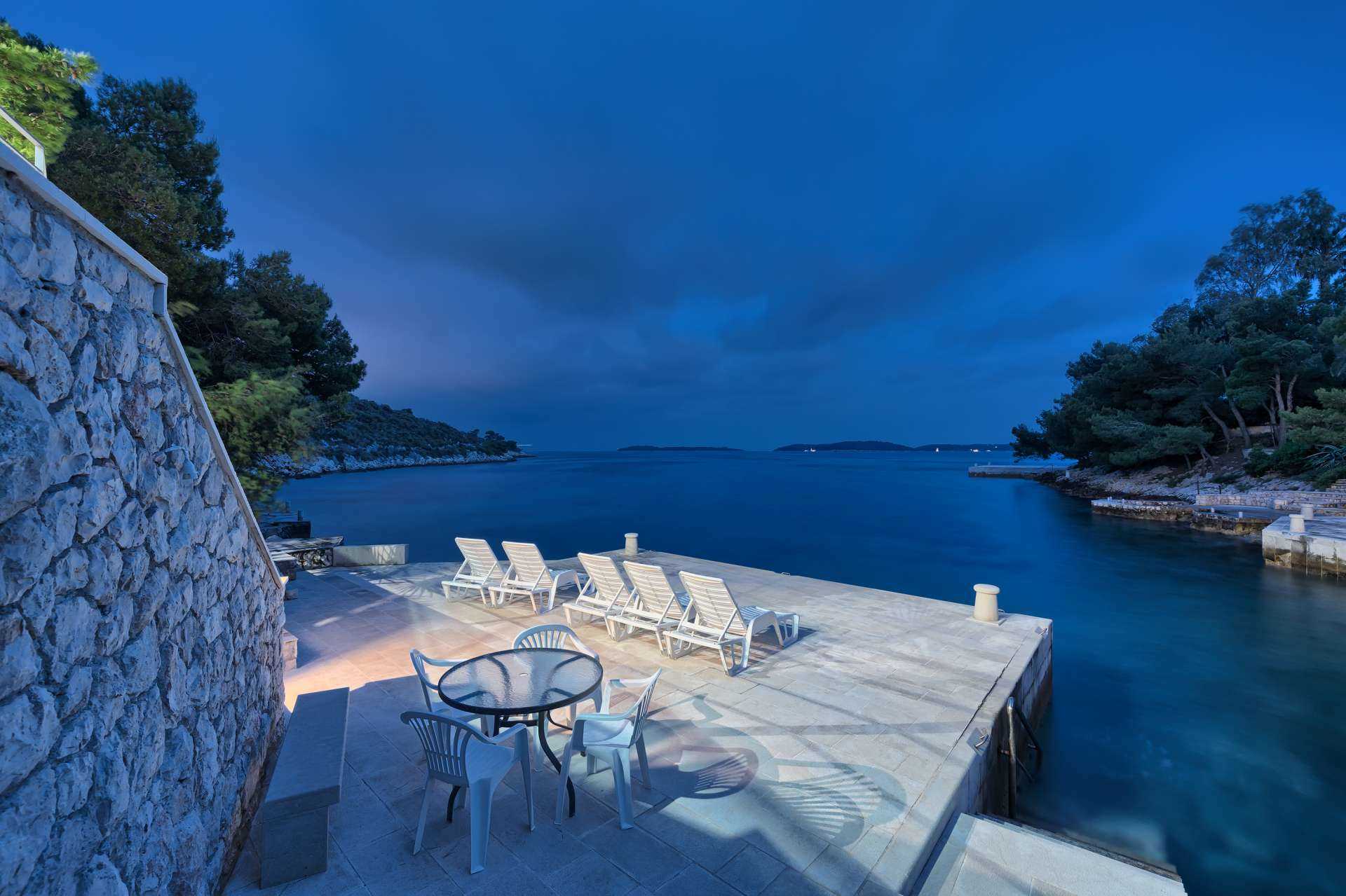 Welcome to the stunning beachfront villa that has it all, located in the national park Pelegrin radiating abundant life. With views of the beautiful blue Adriatic only a few feet away, pine and palm tree around, complete privacy, balconies and terraces to enjoy the sunsets, exclusive access to the water, private pool, comfy and charming naturally shaded seating areas throughout, Villa Crystal Water gives you no choice but to enjoy it, and to enjoy family and friends you are sharing it with. With 350m2 of interior each guest is granted a corner of privacy to themselves. Bedrooms have access to balconies facing the sea insuring an incredible start to every day. The ground floor is composed of a bright sofa lounge and a kitchen ideal for large get-togethers with a dining table seating 14 and a built-in stone fireplace, all with access to a terrace providing further alfresco dining area with sea views. Bedrooms come with flatscreen TVs, with sea and garden views, each has a king size bed, three have their own ensuite bathroom.