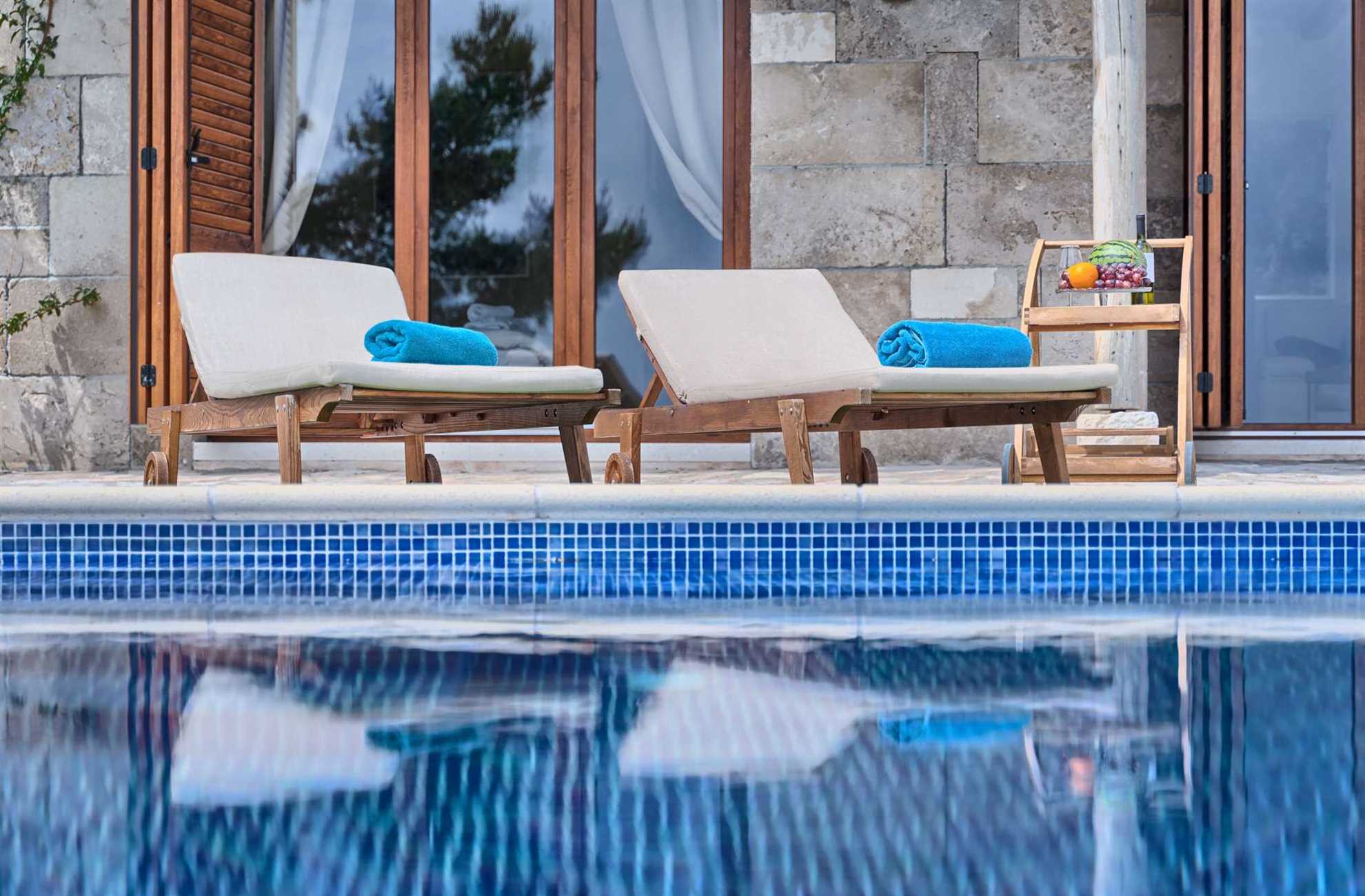 Exquisite property in walking distance to Old Town Hvar yet in its own secluded world of relaxation. With only a few neighboring villas it offers breathtaking views of the Adriatic from the elevated position. Spacious contemporary interior features stylish decor, wood furnishings and ample and bright rooms with exposed wood beams. A large balcony facing the sea is equipped with comfortable lounge seating and is truly a sweet spot for enjoying sunsets. Immaculate grounds occupy a spacious deck with a 40m² infinity heated pool surrounded by palm trees and green lawn. Built-in barbecue facilities with alfresco shaded dining table are provided for your enjoyment. Welcome to your home away from home - Luxury Villa Hector.