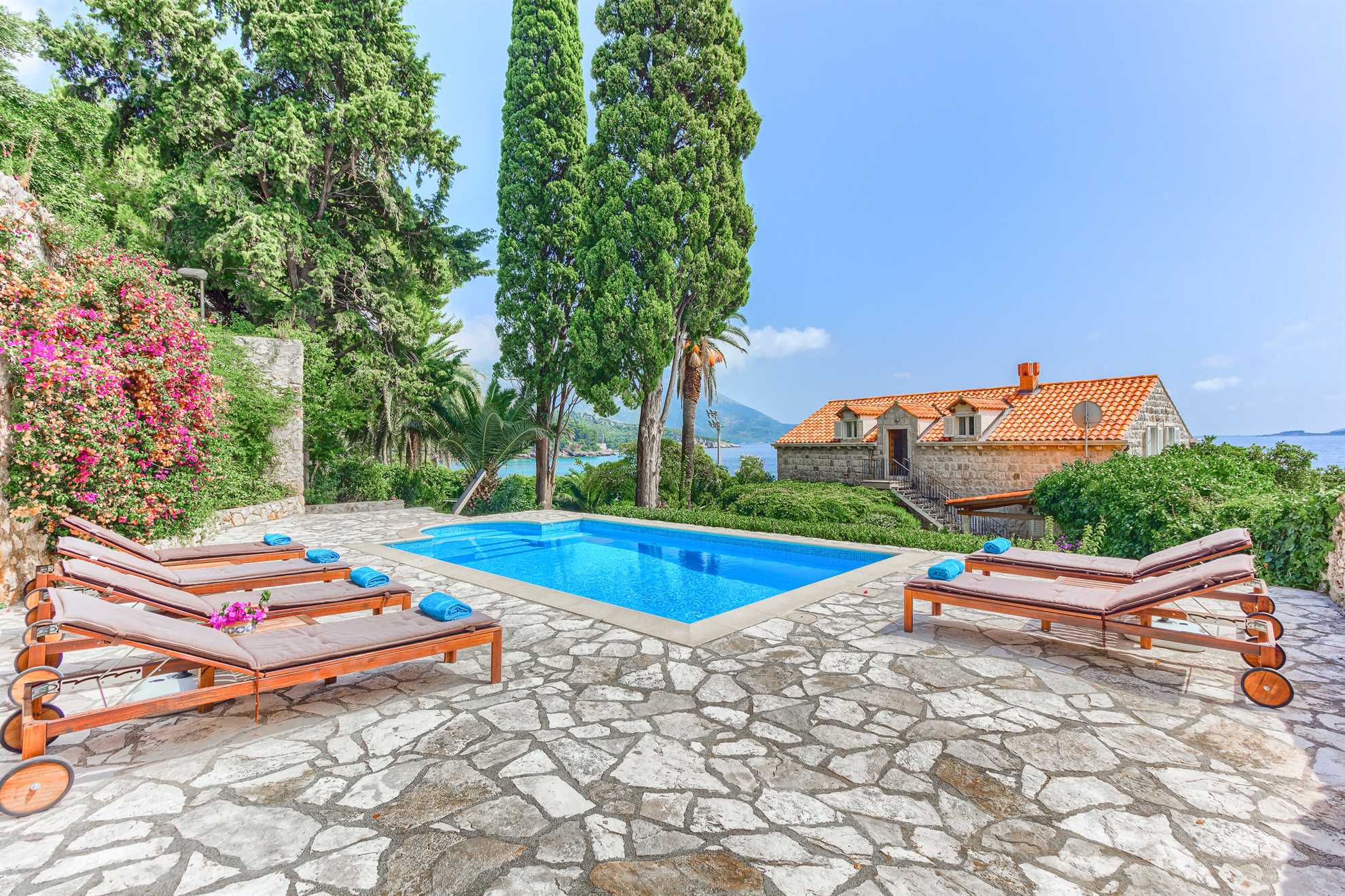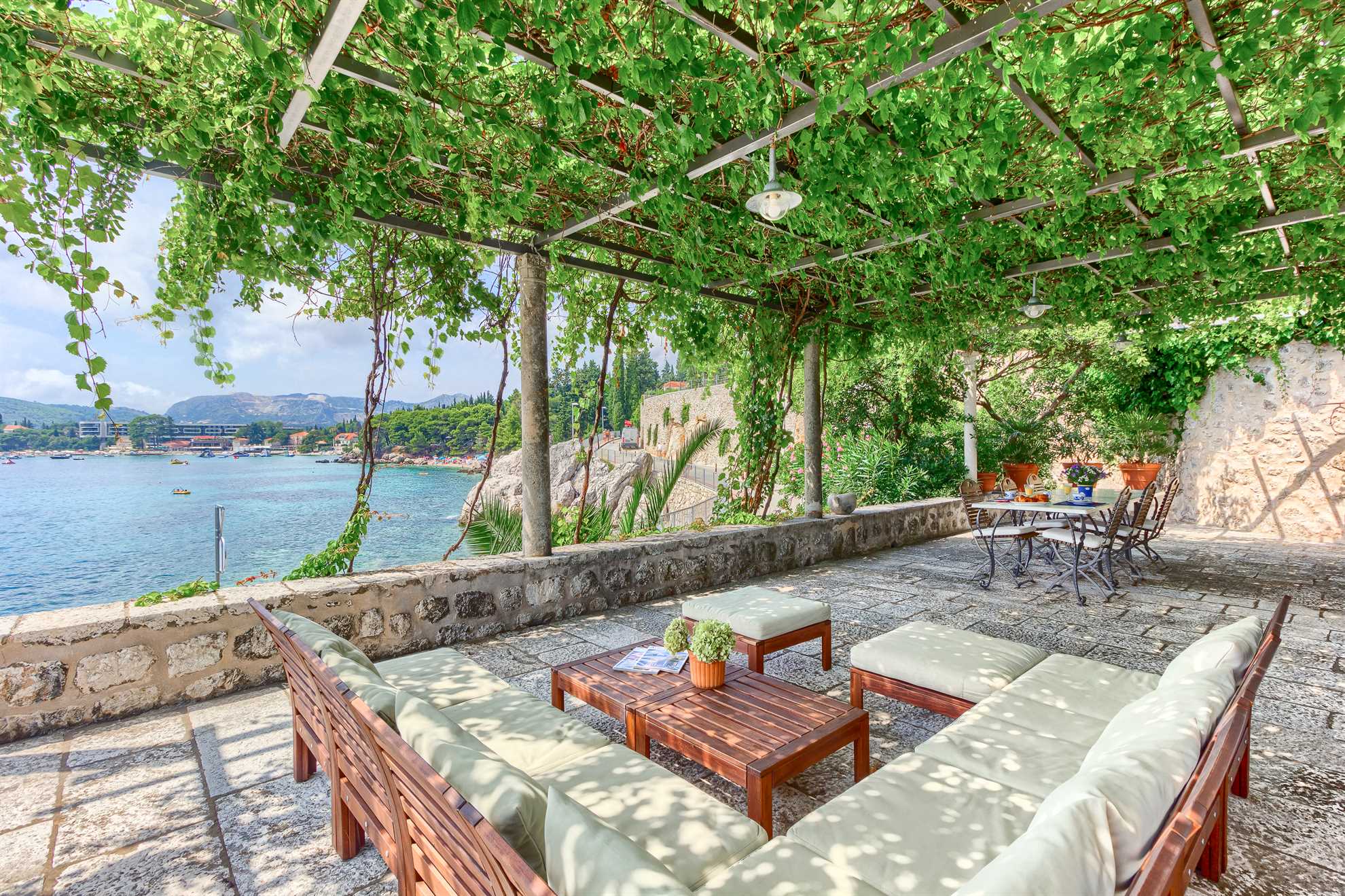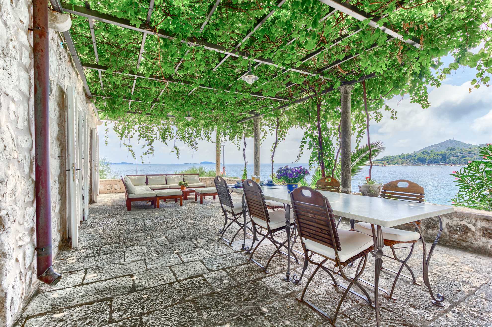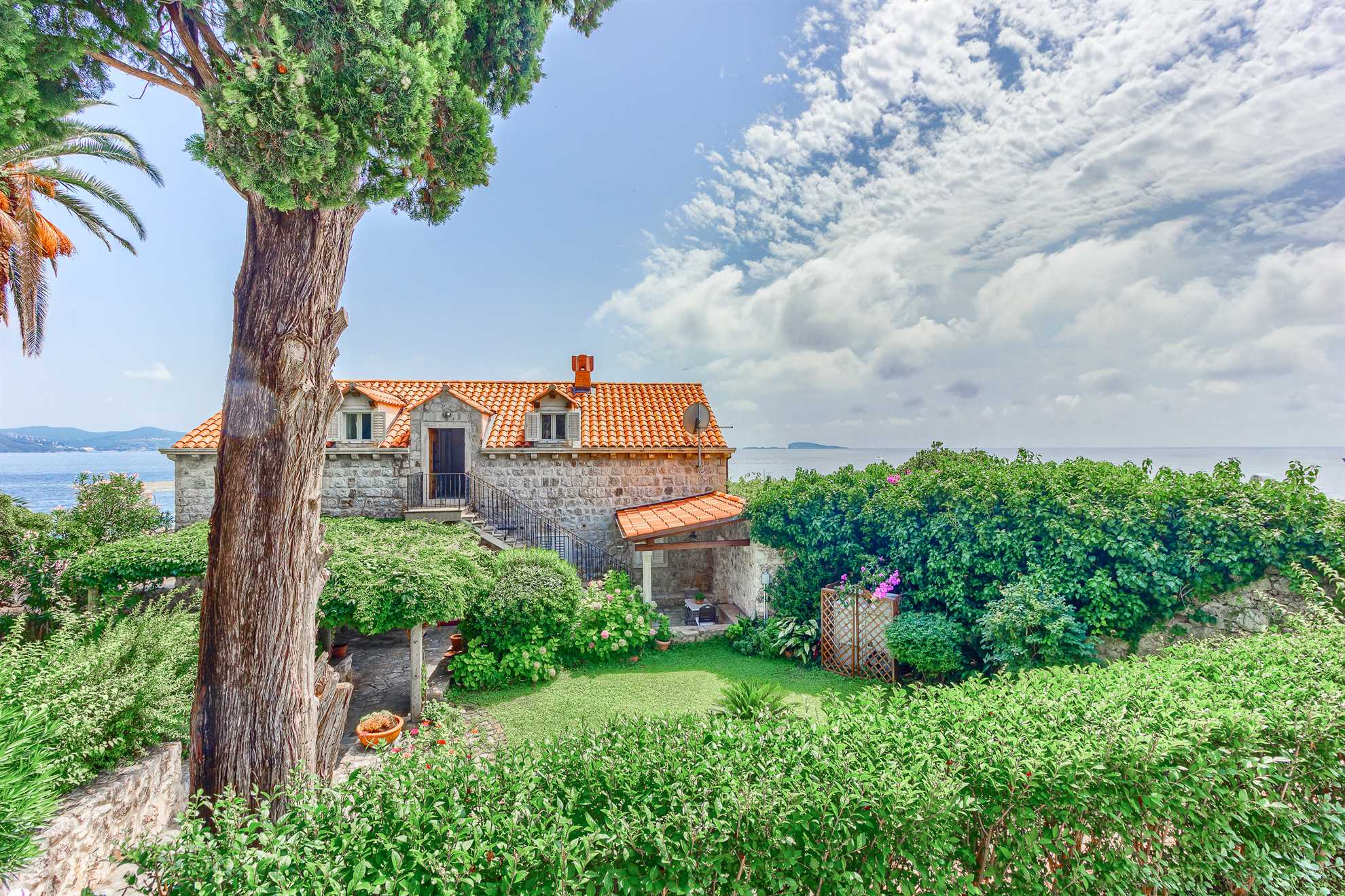 Proclaimed a cultural monument this stunning Mediterranean villa in a superb location dates back to the second half of the 16th century. With only steps away from the beach and just 8km south of Dubrovnik guests can enjoy the best of Dalmatia. Villa Grace showcases authentic stone architecture, timeless interior design, charming features and welcome amenities. Bright and specious interior features clean white walls and tile floors, French doors, mid-century quality furnishings and regional wall art. Fully equipped kitchen is available for your convenience. Sea views are available from every bedroom with mountains in the background adding to this already brilliant contrast. The private garden of over 1200 m² displays immaculate green lawn, palm, cypress, olive, orange and lemon trees, and seasonal flowers plus seating areas under the grapevines overlooking the bay. Secluded outdoor pool with plenty of sun loungers is at your disposal as well as a tucked in traditional built-in barbecue with a shaded alfresco dining area.