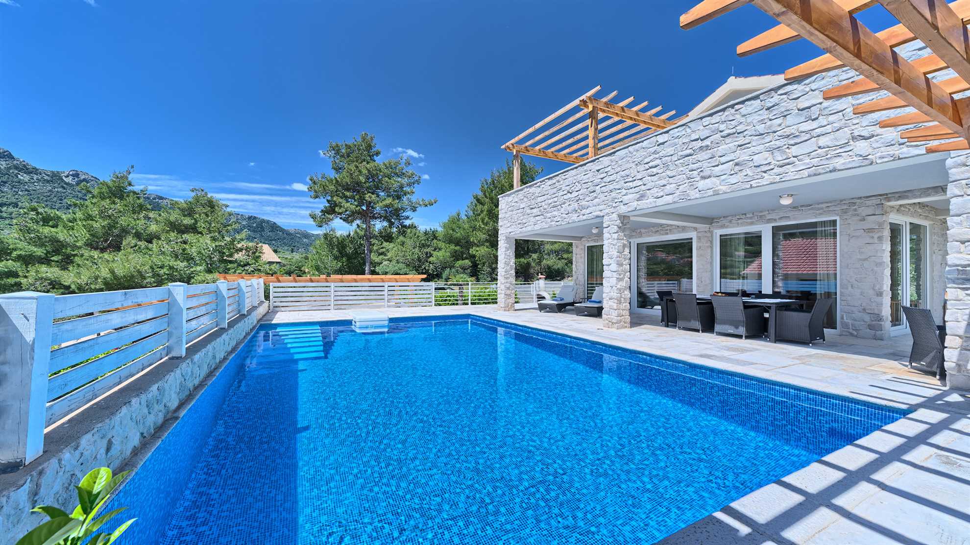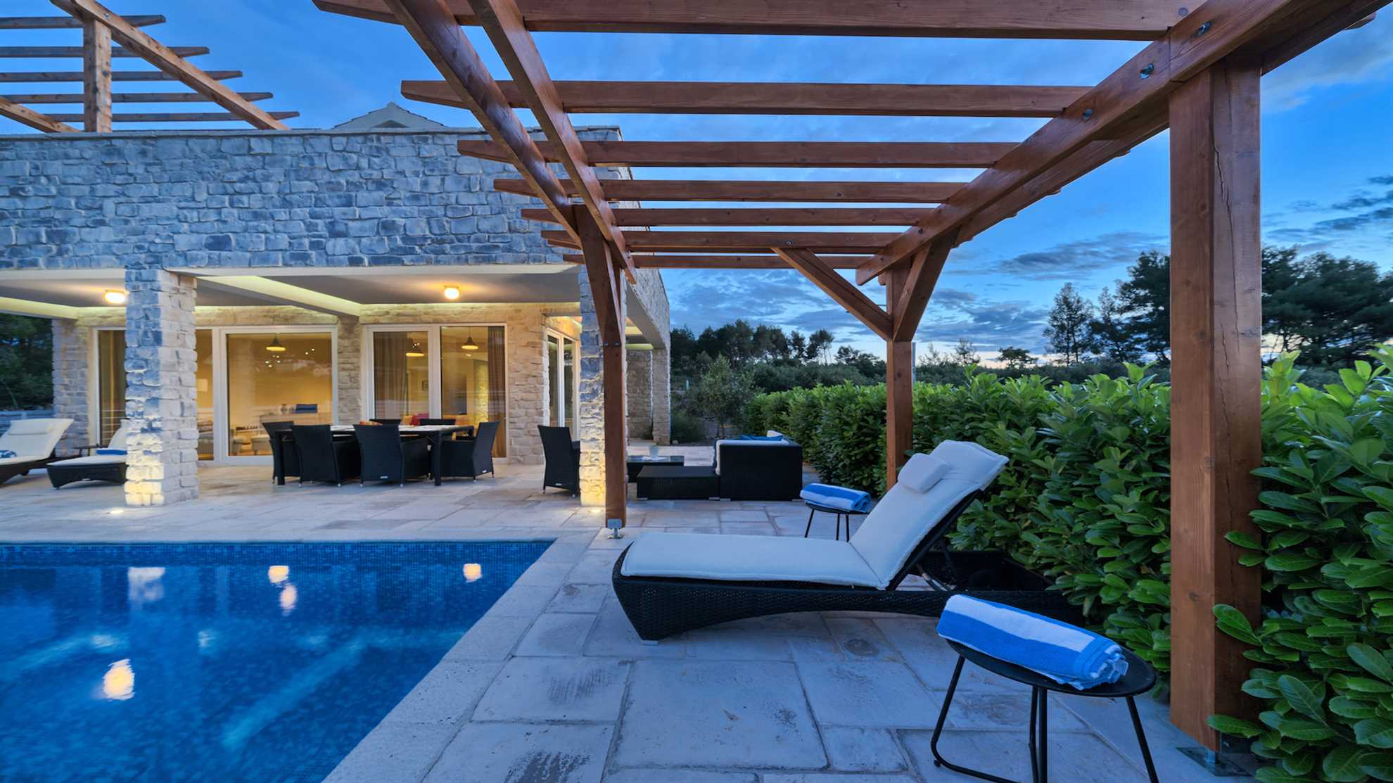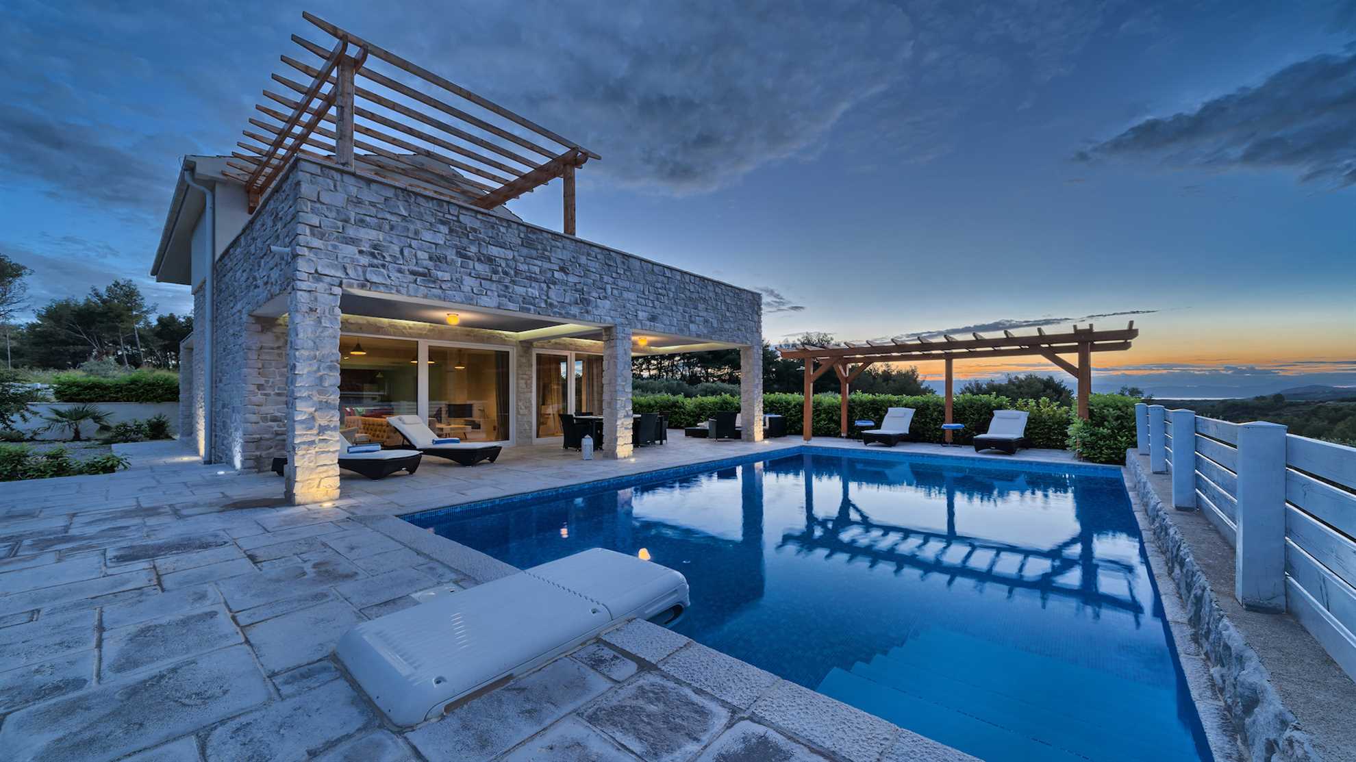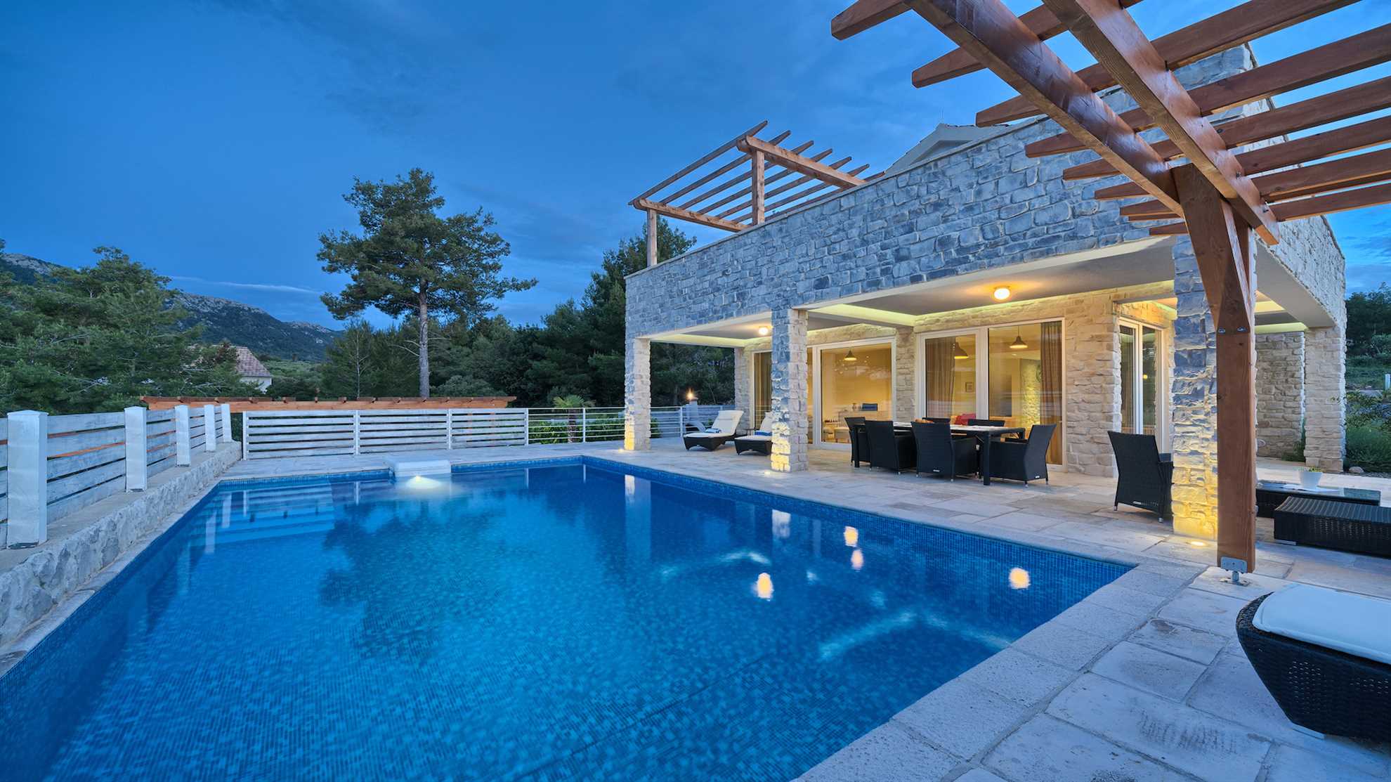 Set on a picturesque island Hvar this breezy holiday destination is fully equipped for a luxurious and carefree holiday. Spread over 270 m² Villa Luxoria graciously offers specious ensuite bedrooms on the upper floor, an open plan ground floor yielding a living area with a designer corner sofa and a fireplace, a fully equipped kitchen and a dining table for ten. With floor to ceiling windows gorgeous views of the surrounding area can be enjoyed from all the rooms. At your disposal is a 42 m² outdoor pool, a sauna, Jacuzzi, built in authentic barbecue with an oversized alfresco dining table as well as a covered seating lounge perfect for enjoying lovely summer evenings. Privileged with peace and tranquility of its surroundings yet in close proximity to the beach as well as excellent eateries available in the area all the essentials for a perfect holiday are within your reach.
