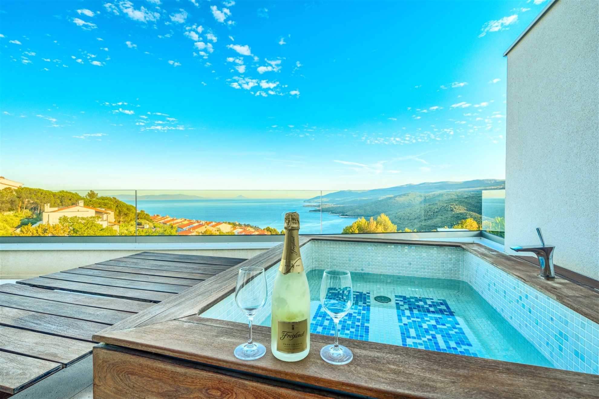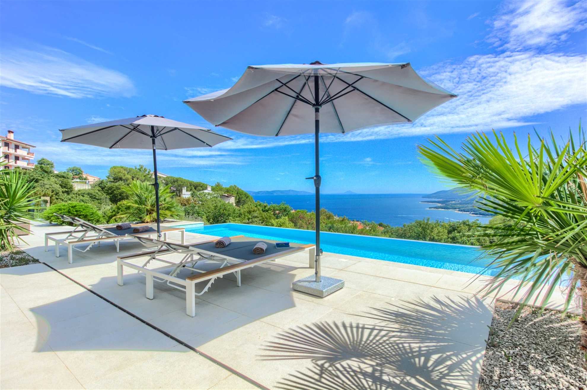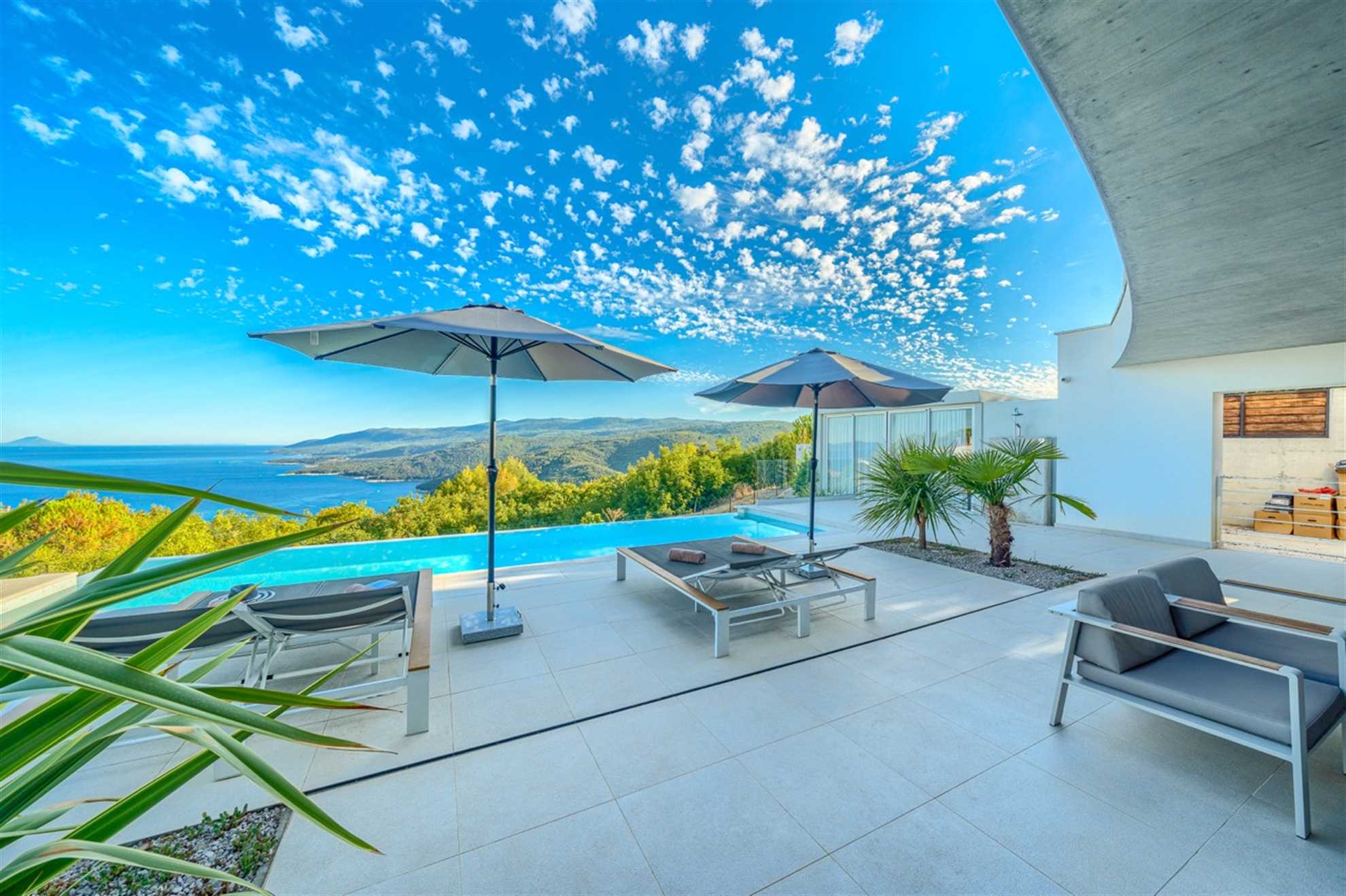 This stunning, stylish and modern property with out-of-this world sea-views is located on the east coast of Istrian peninsula. Nothing quite screams holiday as luxurious Villa Lifestyle. With focus on both exquisite style and comfort this home is inviting with warm wood tones and floor to ceiling glass windows allowing admiration of the Adriatic from every nook in the house. Fully equipped open plan kitchen adjacent to the dining room with a view, makes preparing meals a leisurely and enjoyable activity while a living area is a cozy place to relax to a movie, a book or crackling sound of the fireplace. Built on a hillside fresh sea air can be enjoyed from the pool deck or any of the balconies. Plenty of alfresco lounge seating is available, as well as a charming outdoor kitchen, a sauna room and a jacuzzi. A large deck with tidy garden plants leads to the pool equipped with sun loungers.