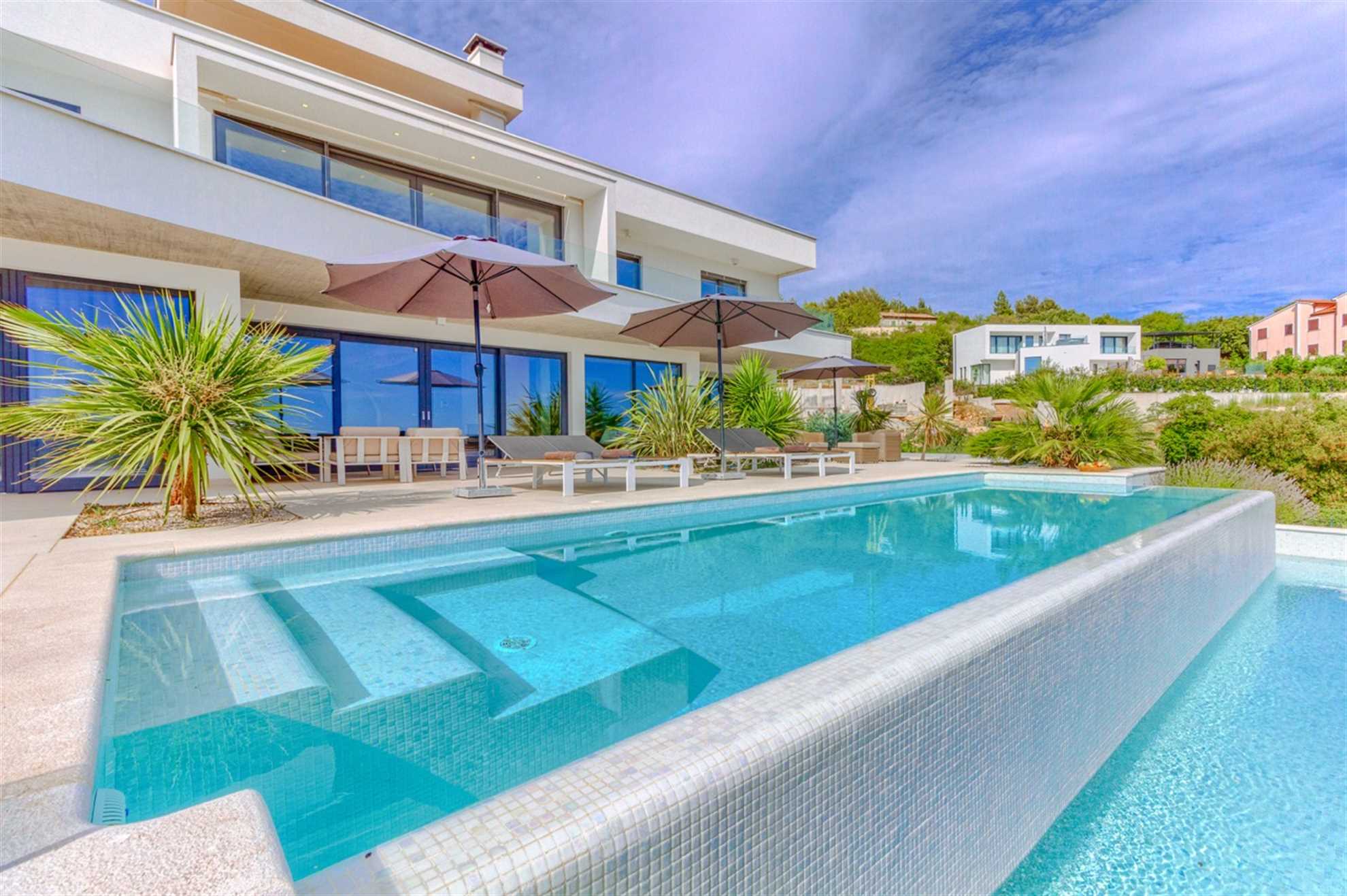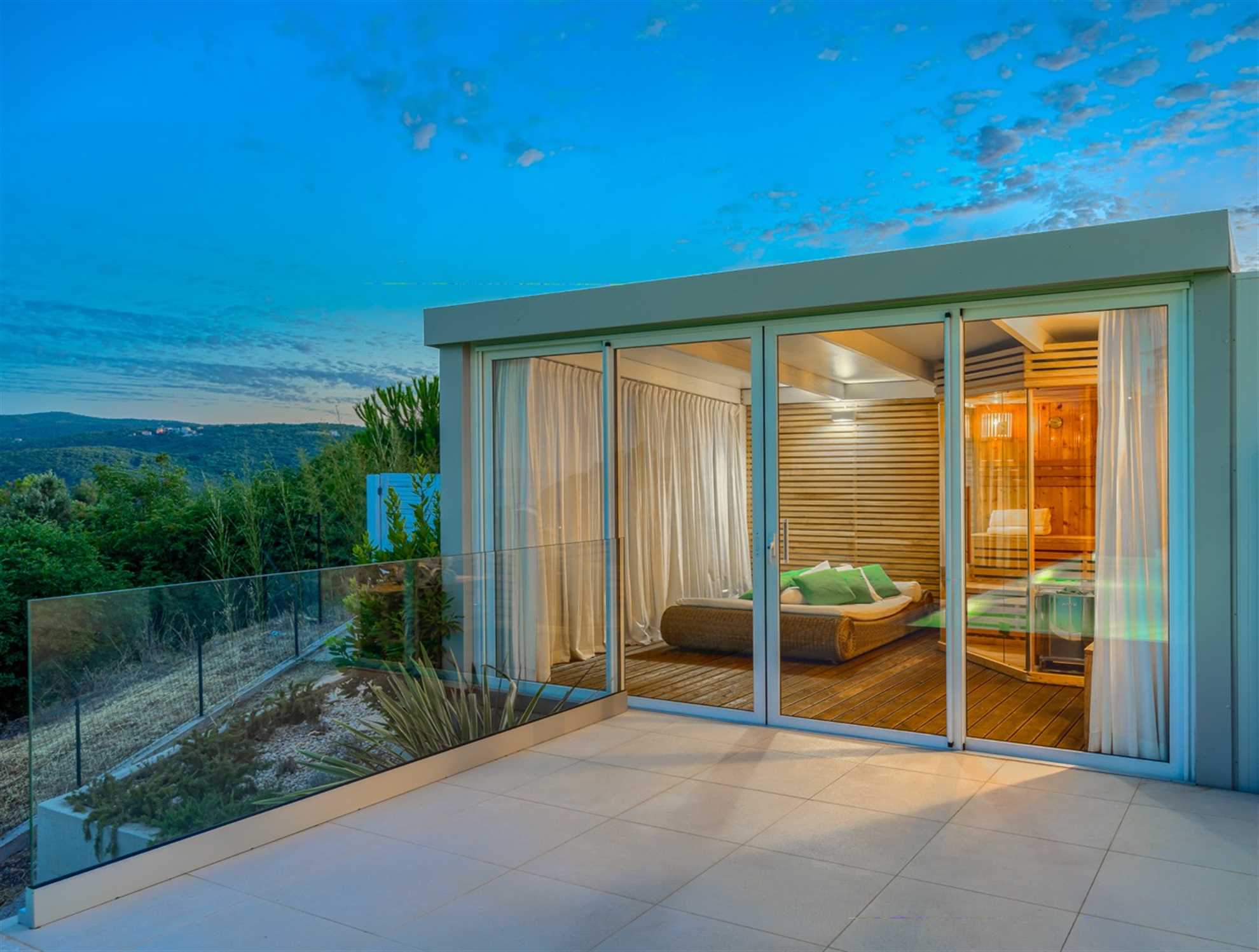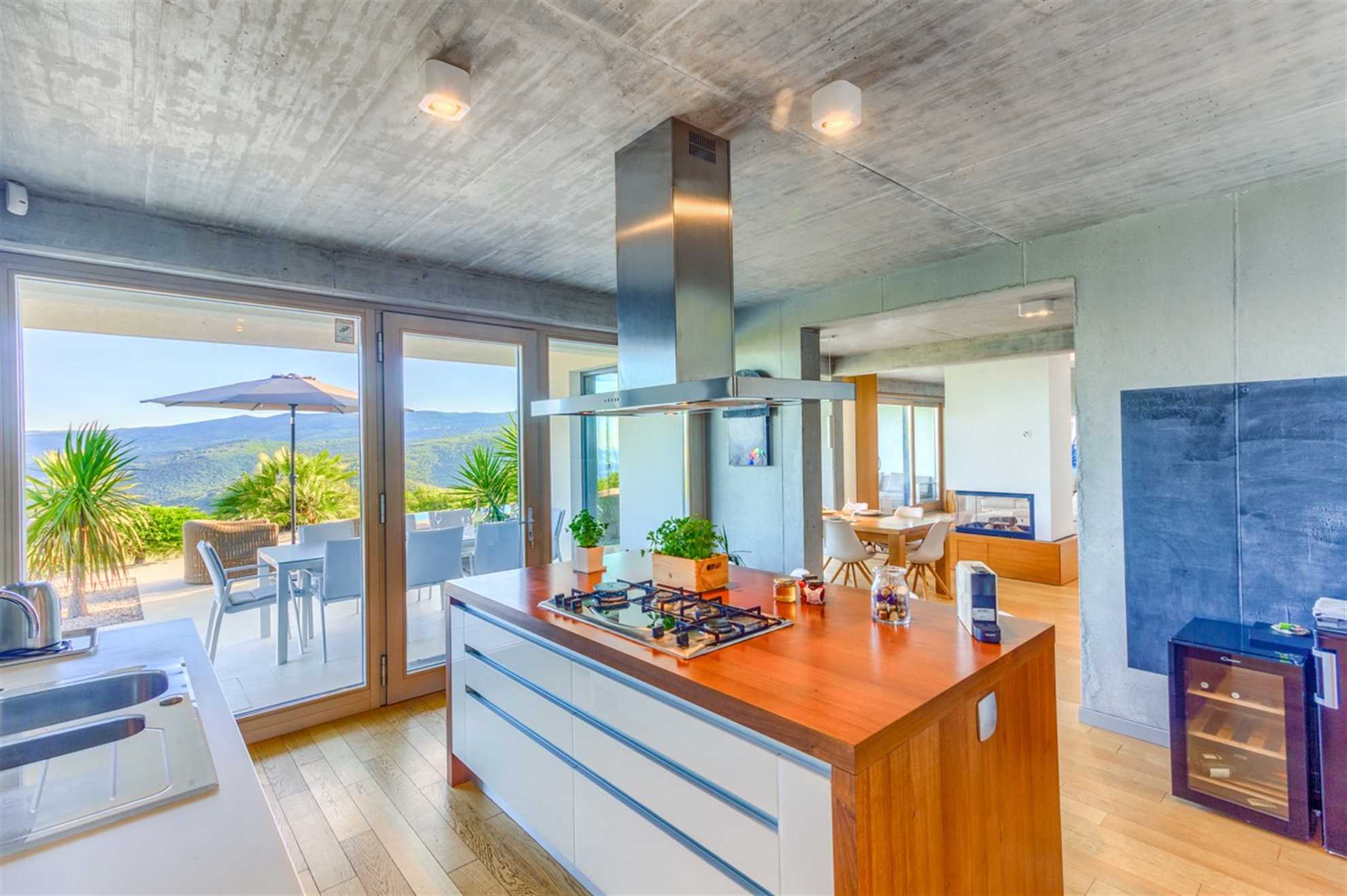 This stunning, stylish and modern property with out-of-this world sea-views is located on the east coast of Istrian peninsula. Nothing quite screams holiday as luxurious Villa Lifestyle. With focus on both exquisite style and comfort this home is inviting with warm wood tones and floor to ceiling glass windows allowing admiration of the Adriatic from every nook in the house. Fully equipped open plan kitchen adjacent to the dining room with a view, makes preparing meals a leisurely and enjoyable activity while a living area is a cozy place to relax to a movie, a book or crackling sound of the fireplace. Built on a hillside fresh sea air can be enjoyed from the pool deck or any of the balconies. Plenty of alfresco lounge seating is available, as well as a charming outdoor kitchen, a sauna room and a jacuzzi. A large deck with tidy garden plants leads to the pool equipped with sun loungers.